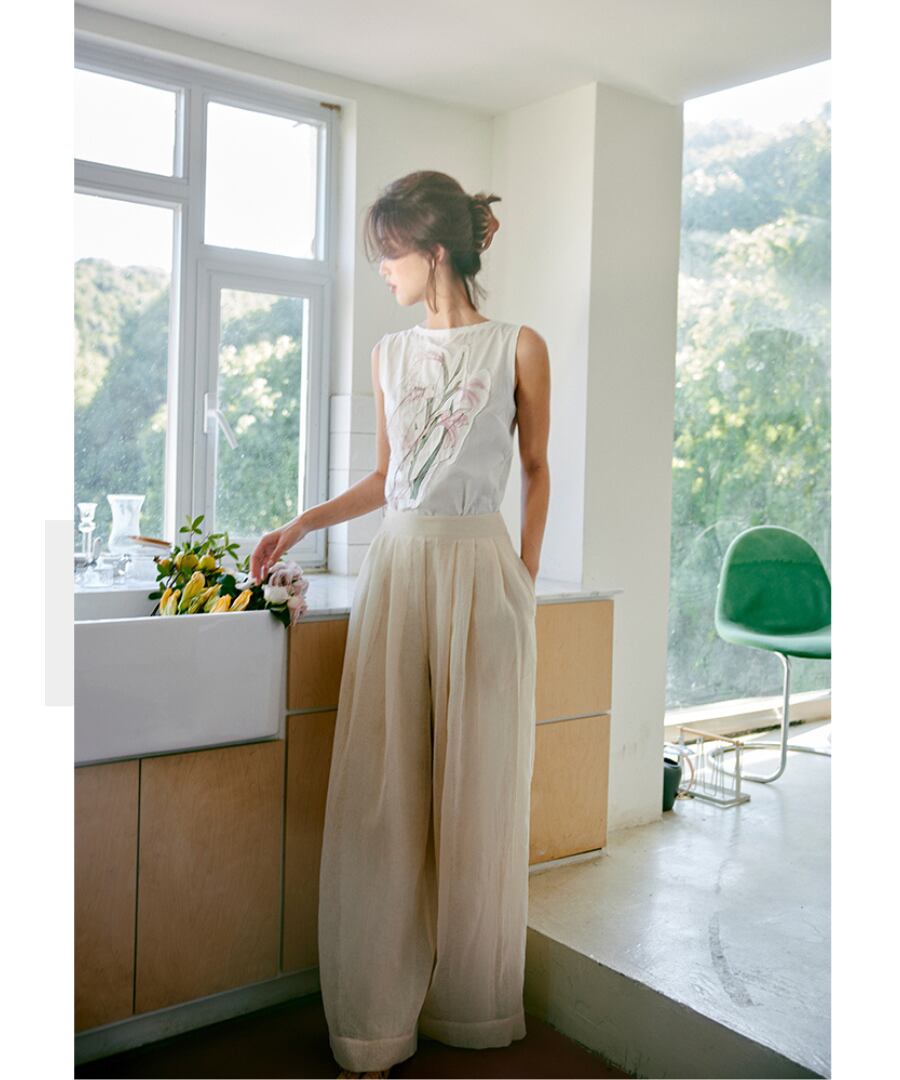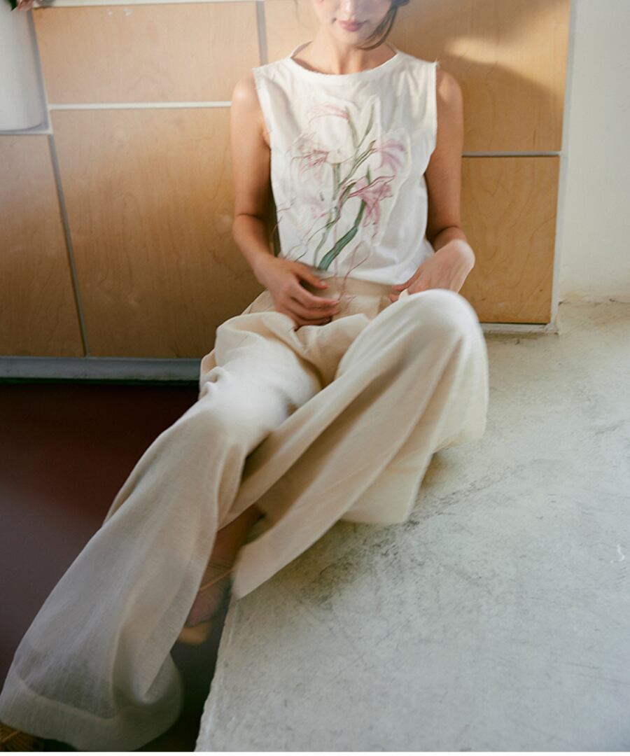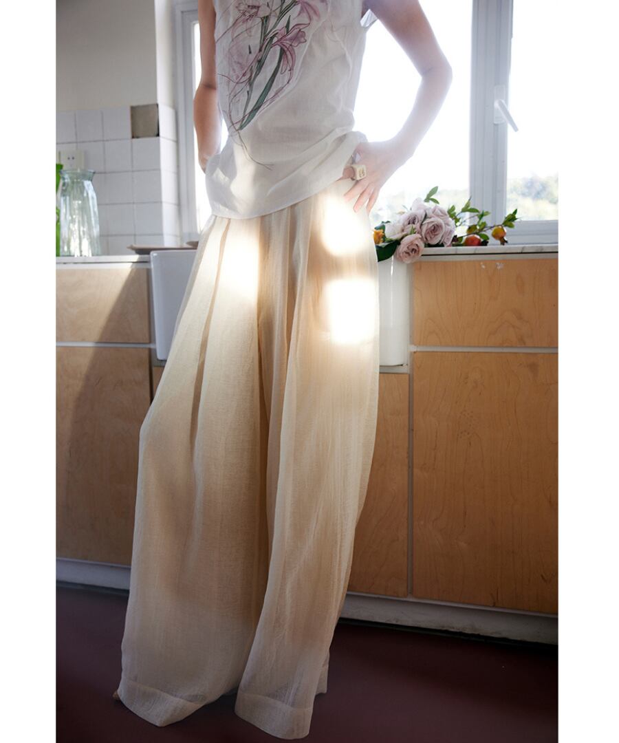 ゆったりとしたワイドレッグデザインは、動きやすさを追求し、リラックスした雰囲気を演出。
