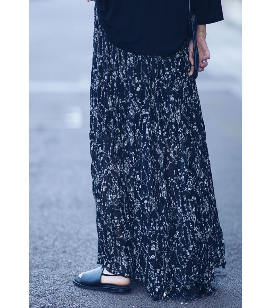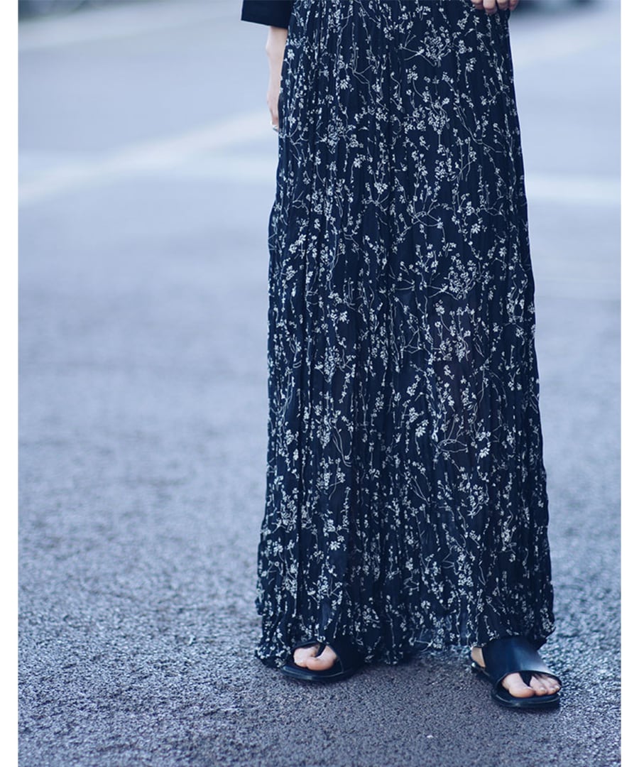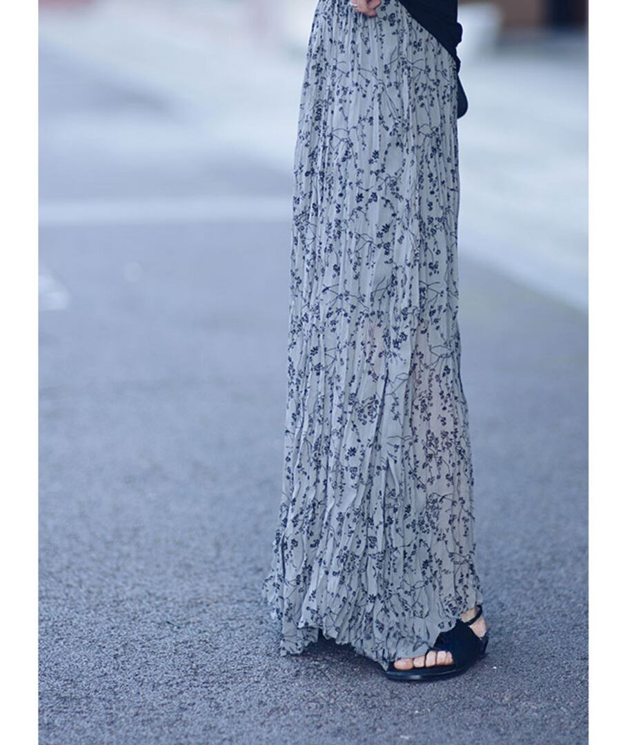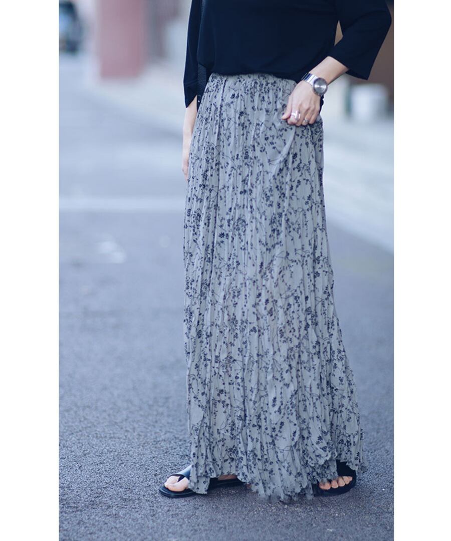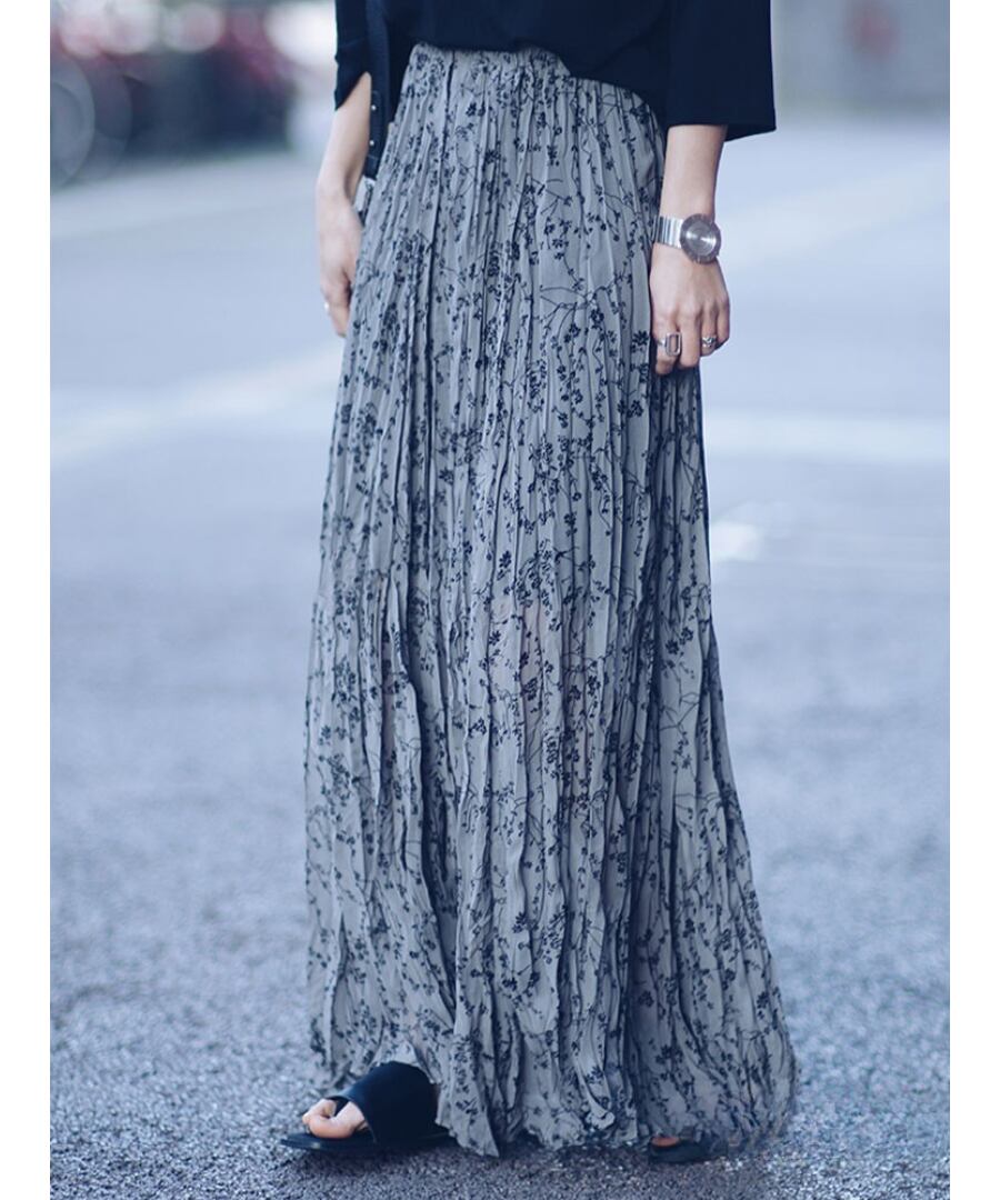 ボタニカルプリントが華やかさを添える、プリーツロングスカート。