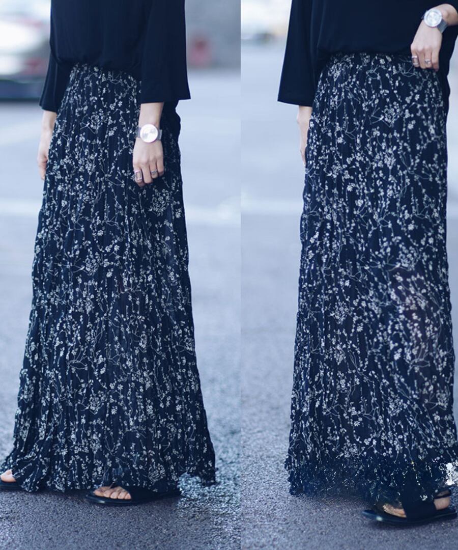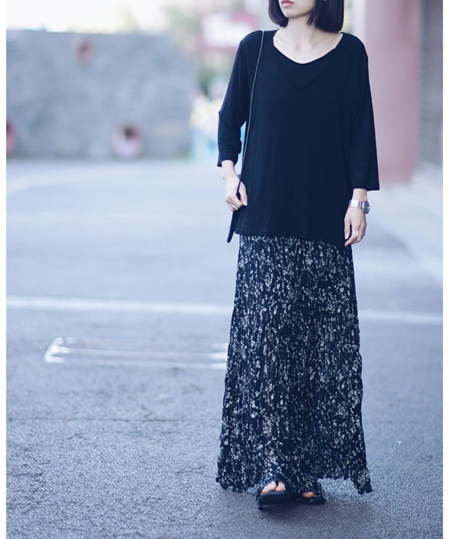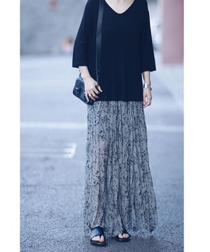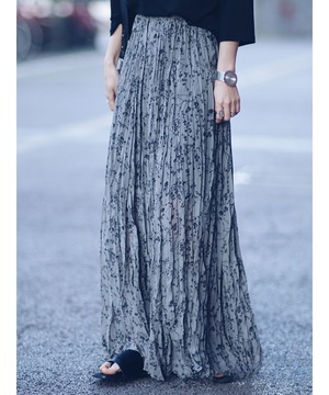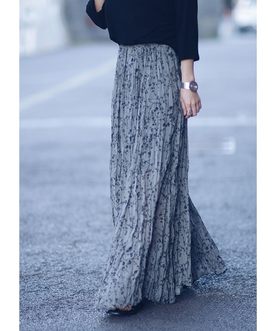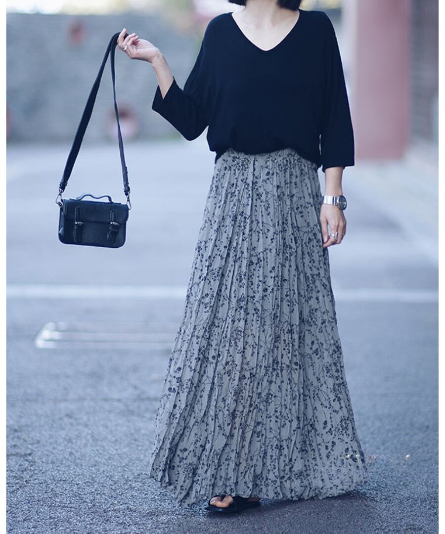 ボタニカルプリントが華やかさを添える、プリーツロングスカート。