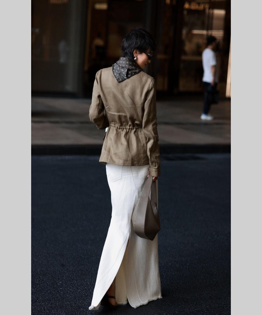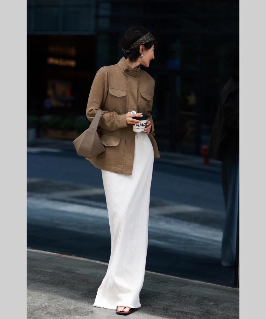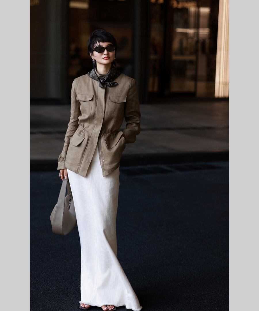エレガントでありながらカジュアルな印象を与えるスタンドカラーのリネンジャケット。