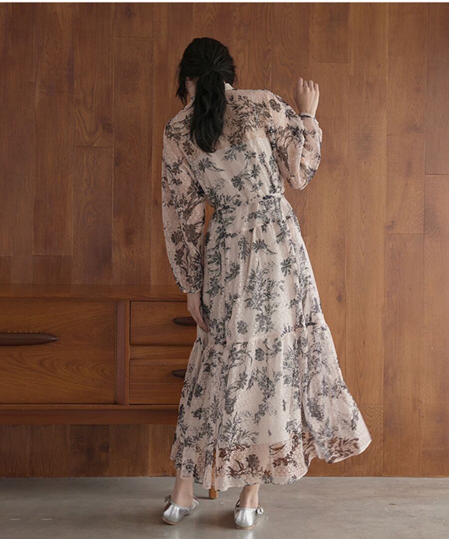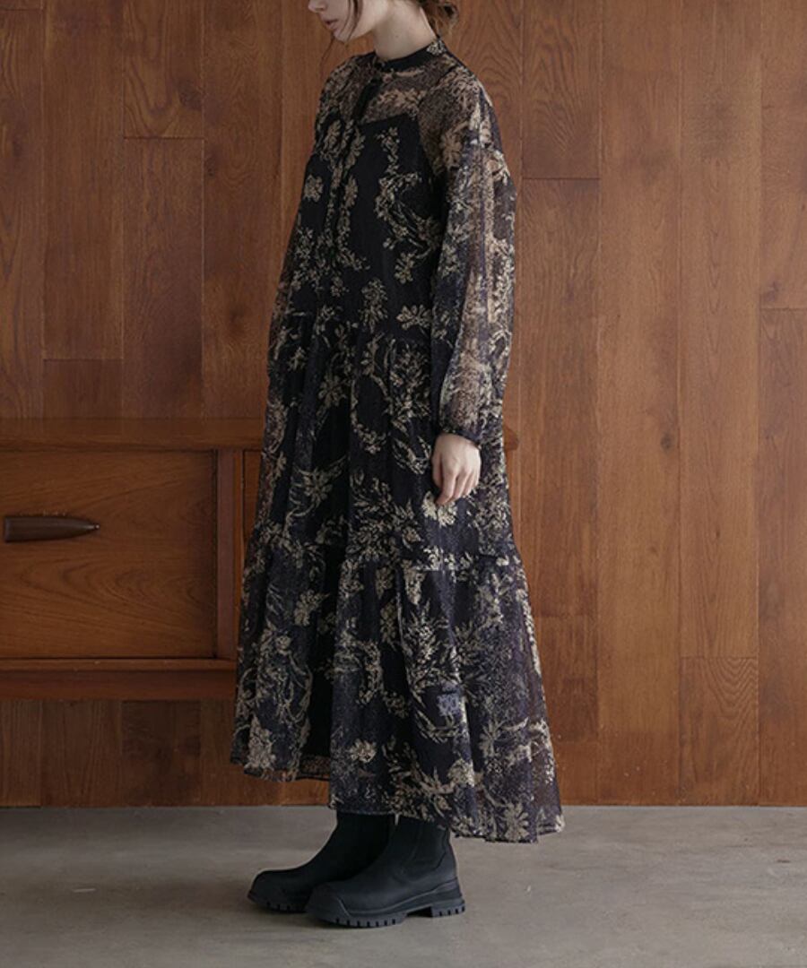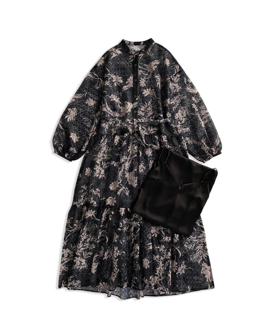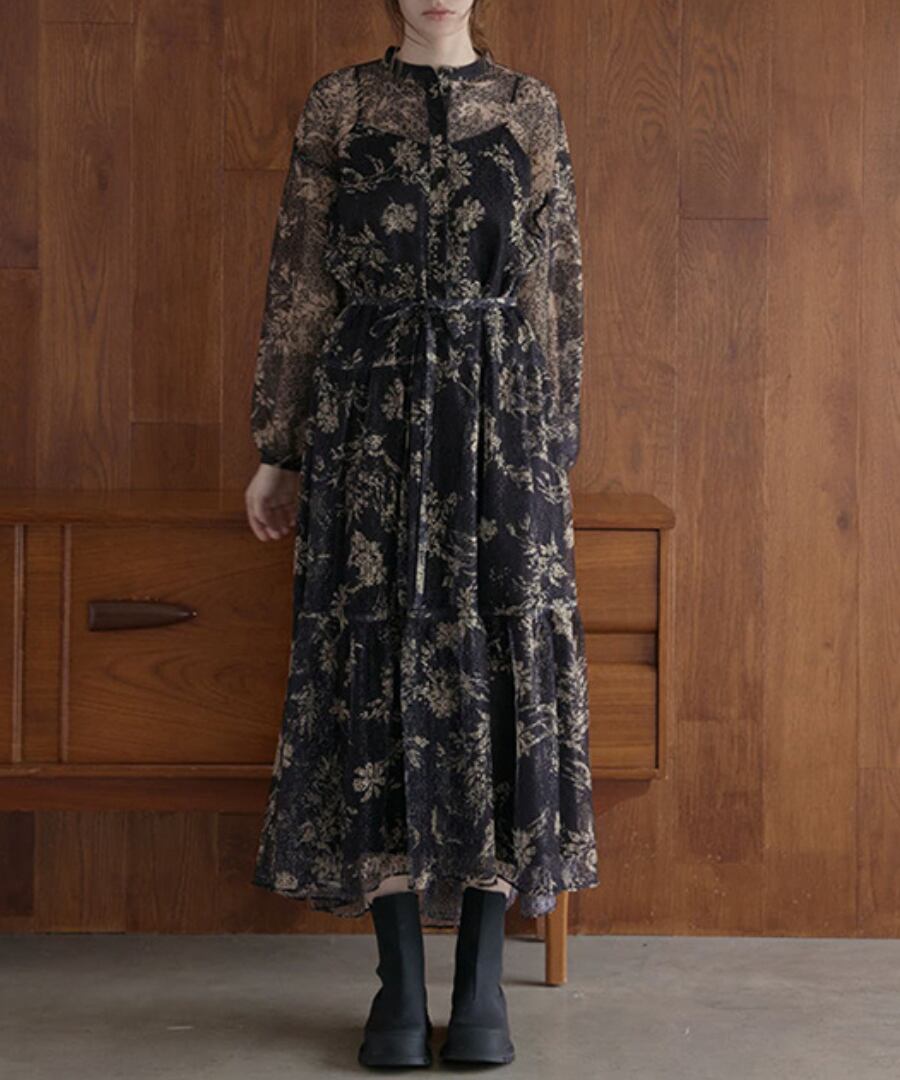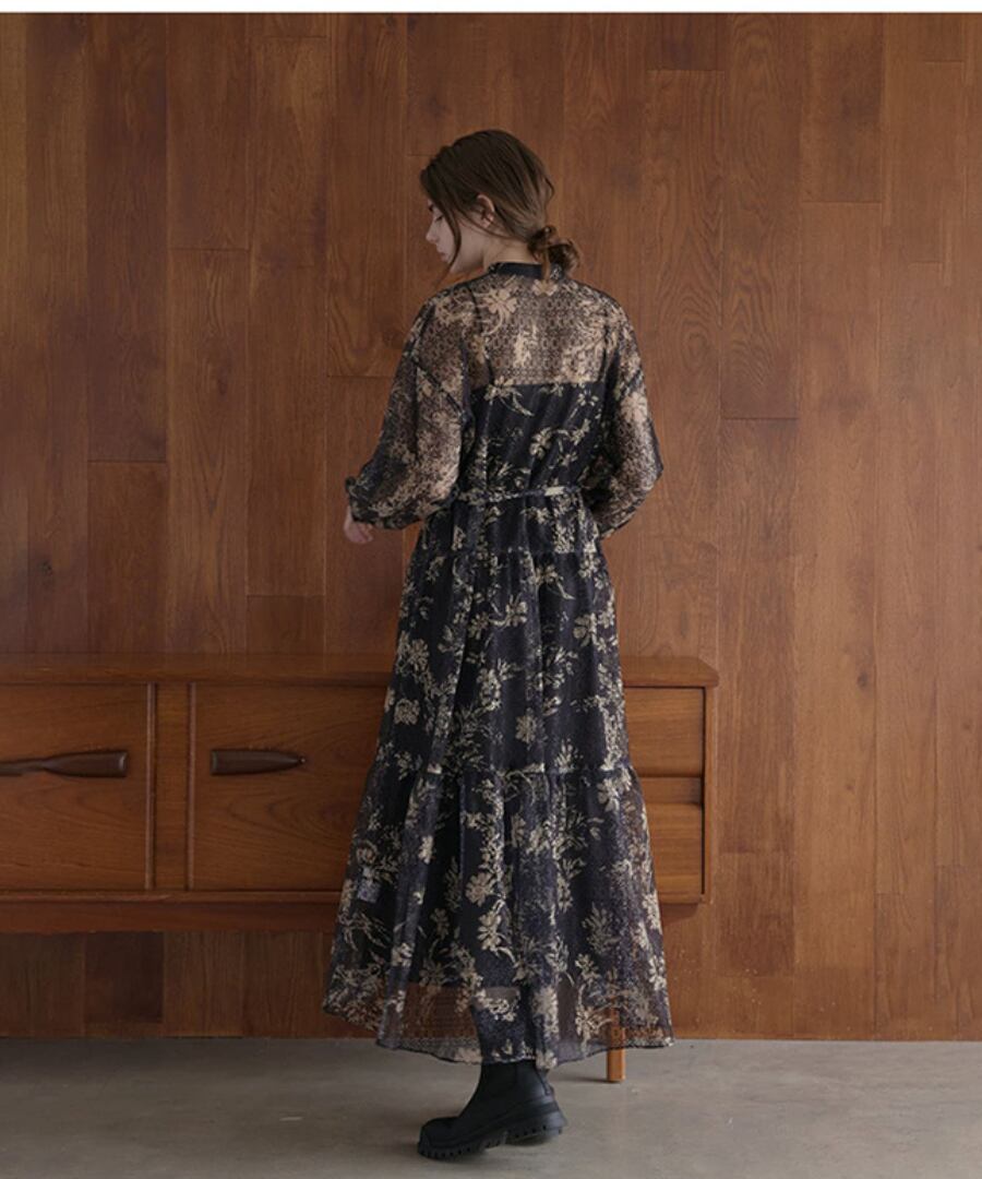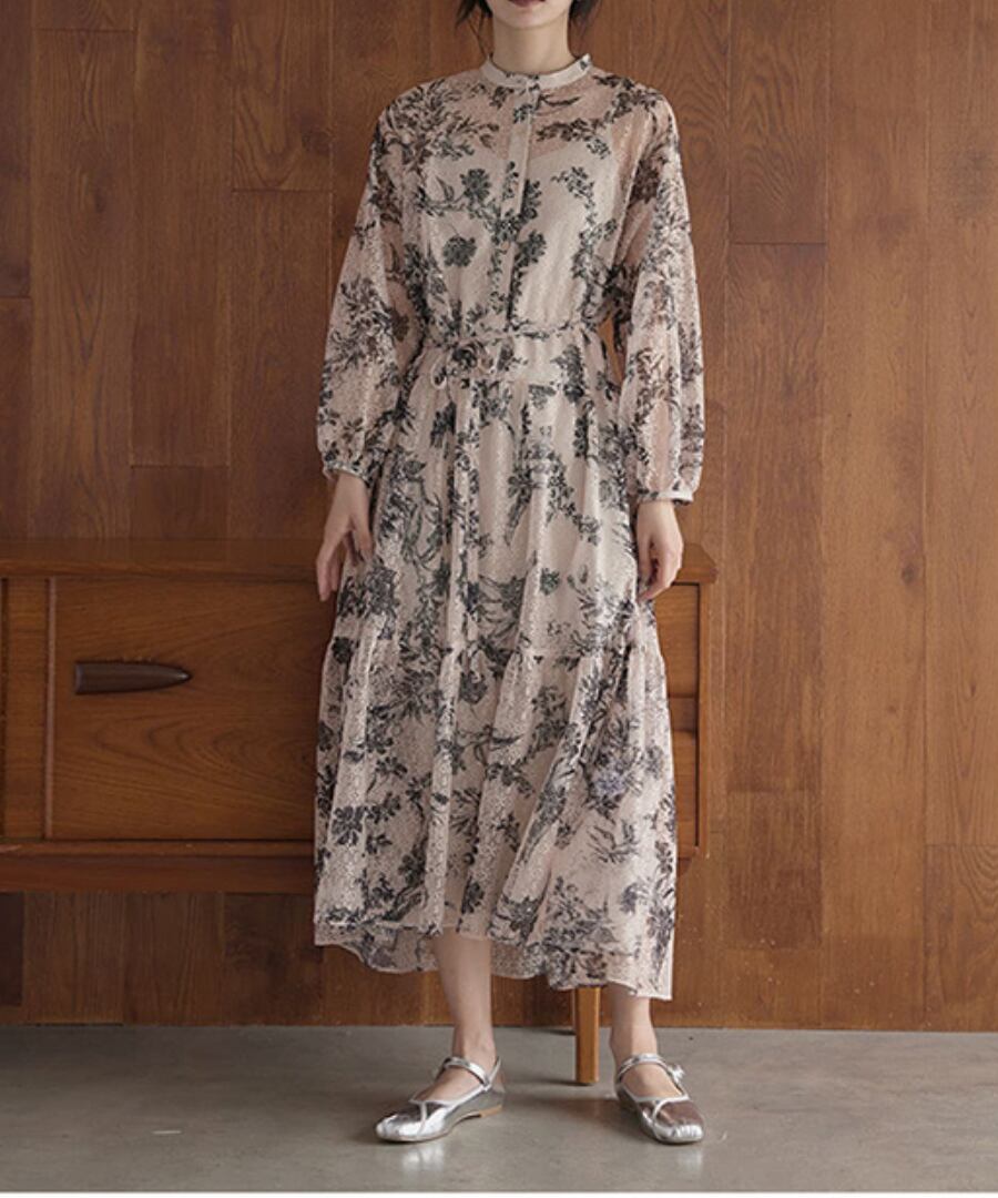 美しいリーフプリントと繊細なレースが大人の魅力を引き立てるワンピース。