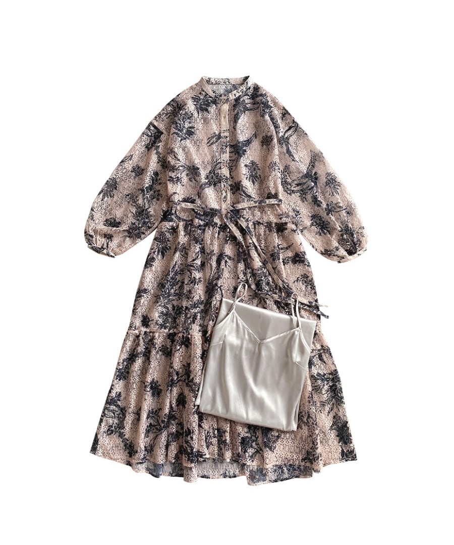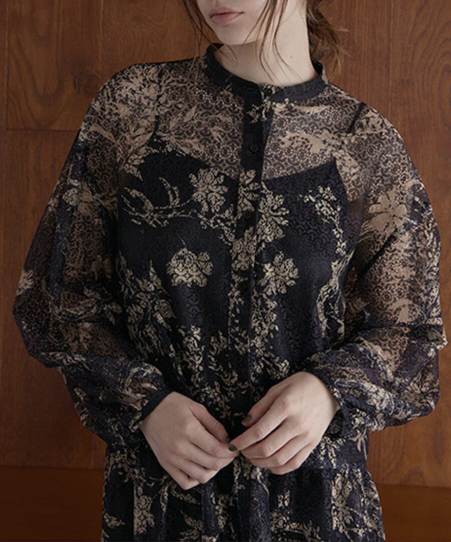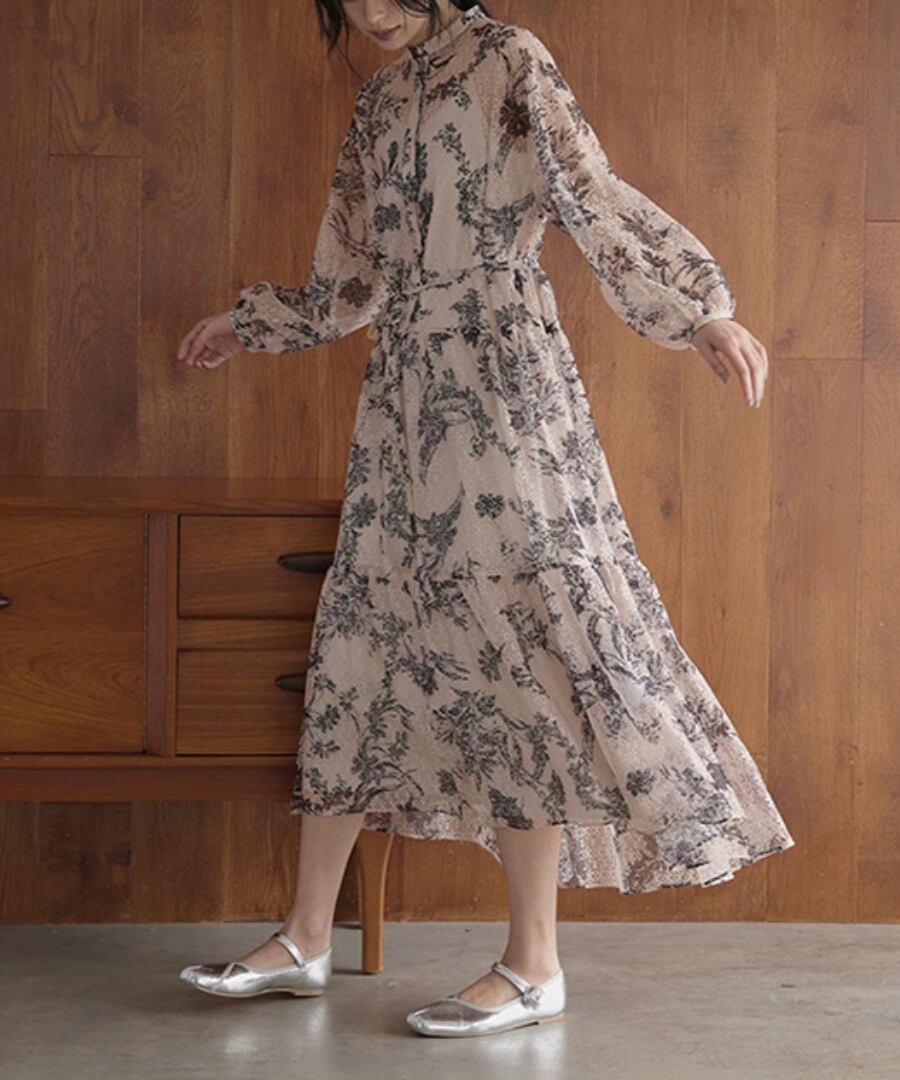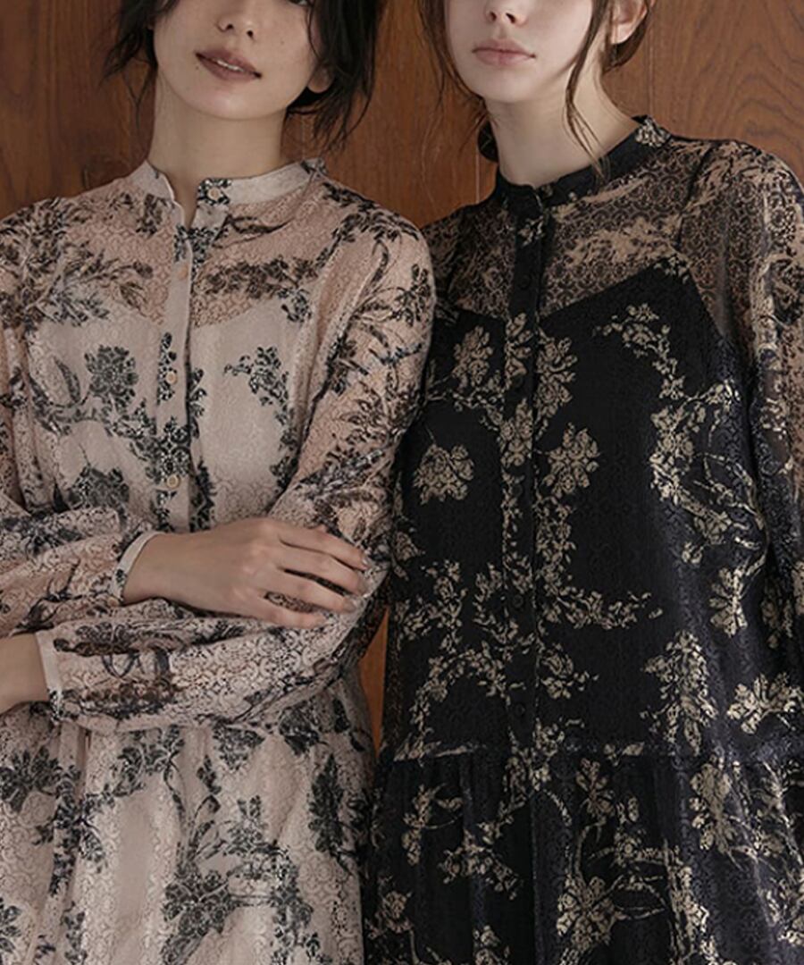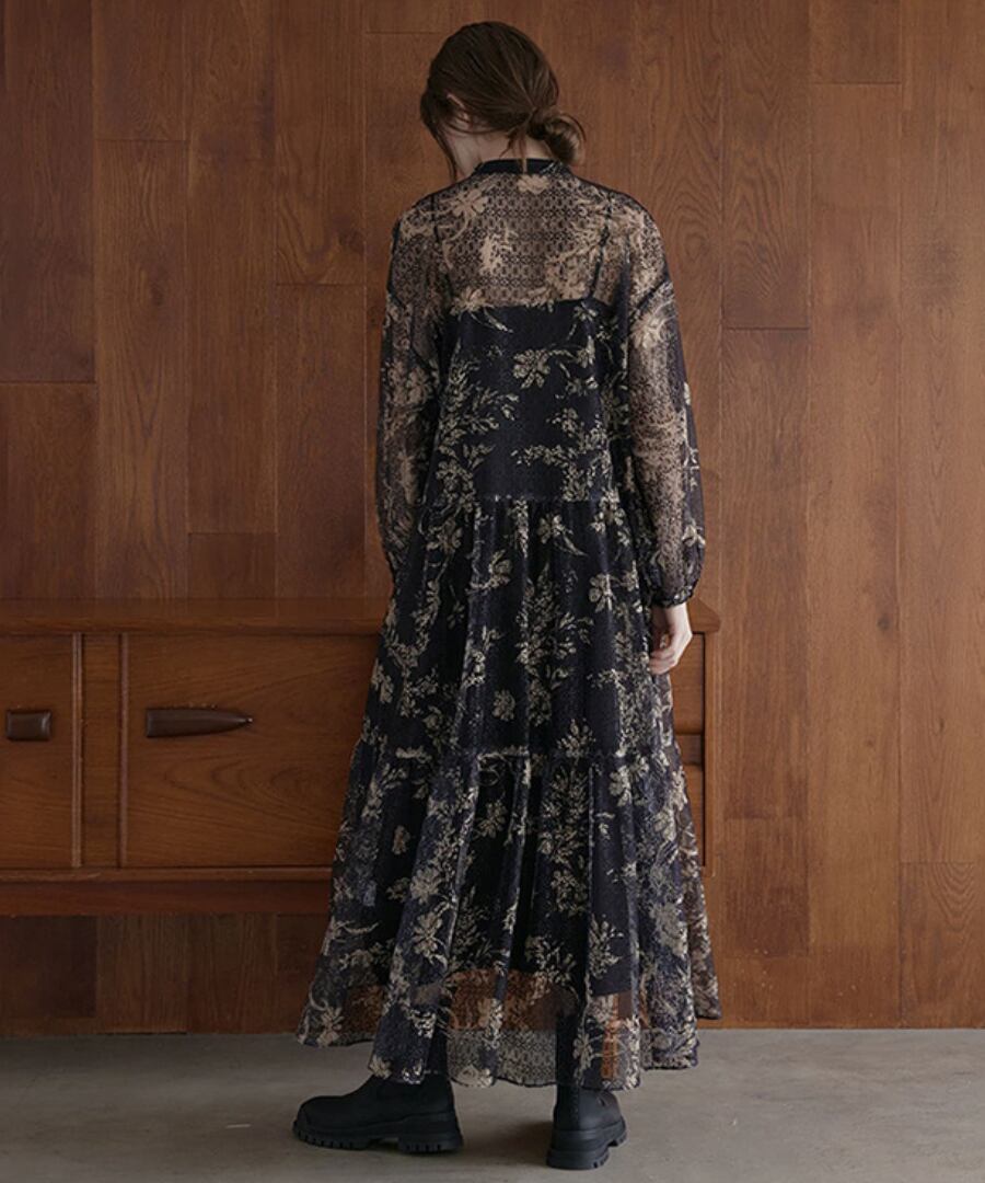 美しいリーフプリントと繊細なレースが大人の魅力を引き立てるワンピース。