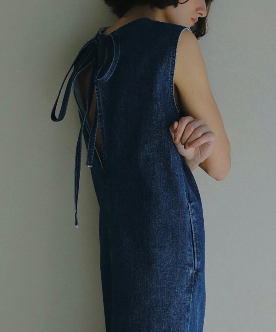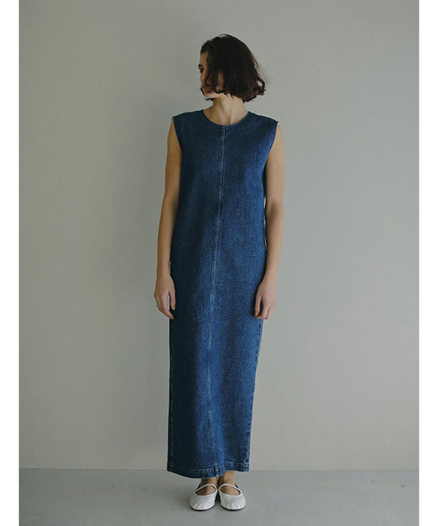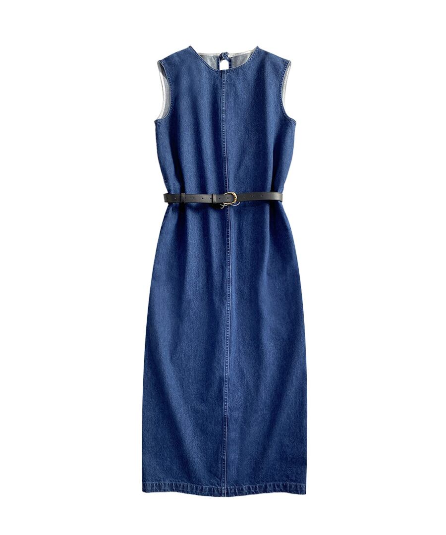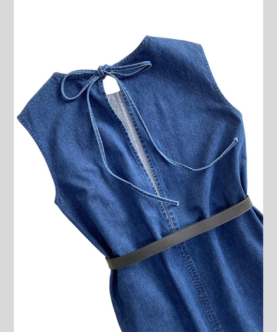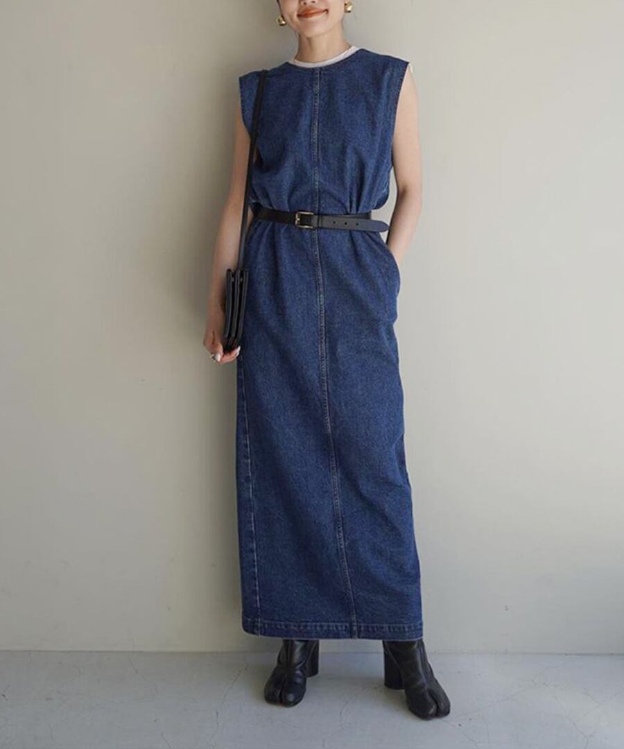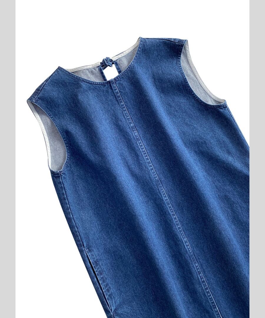 シンプルながらも印象的なノースリーブデニムベストワンピース。