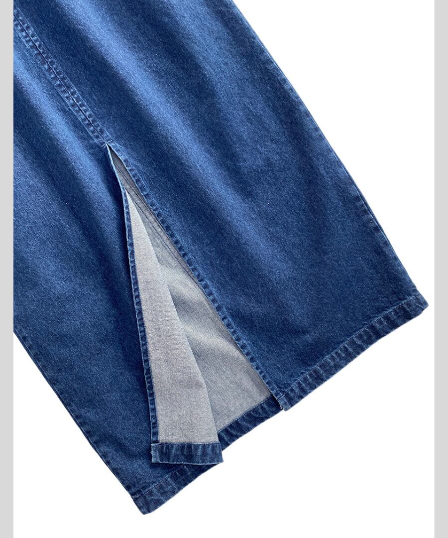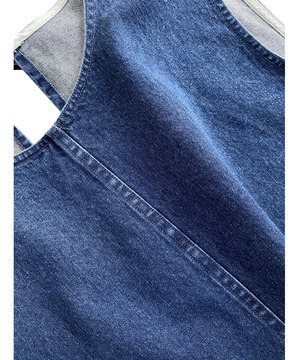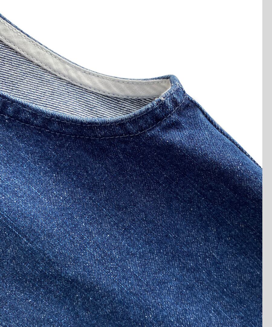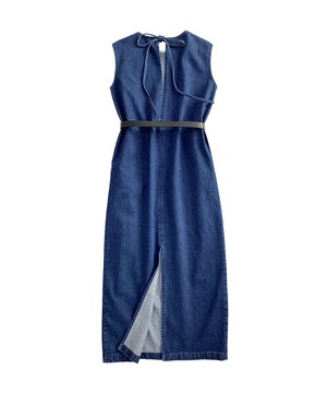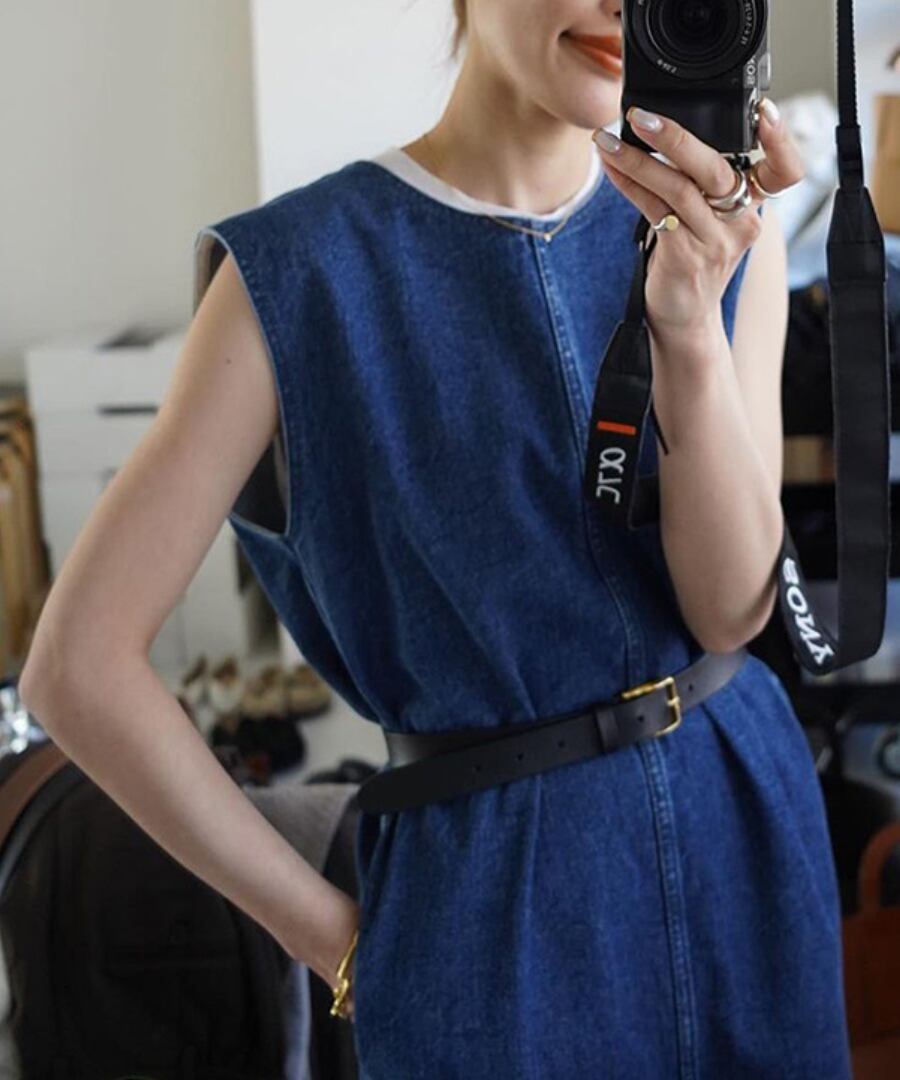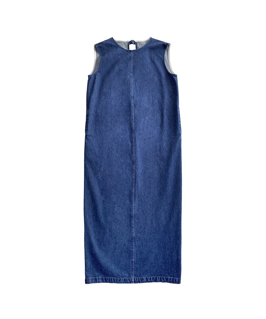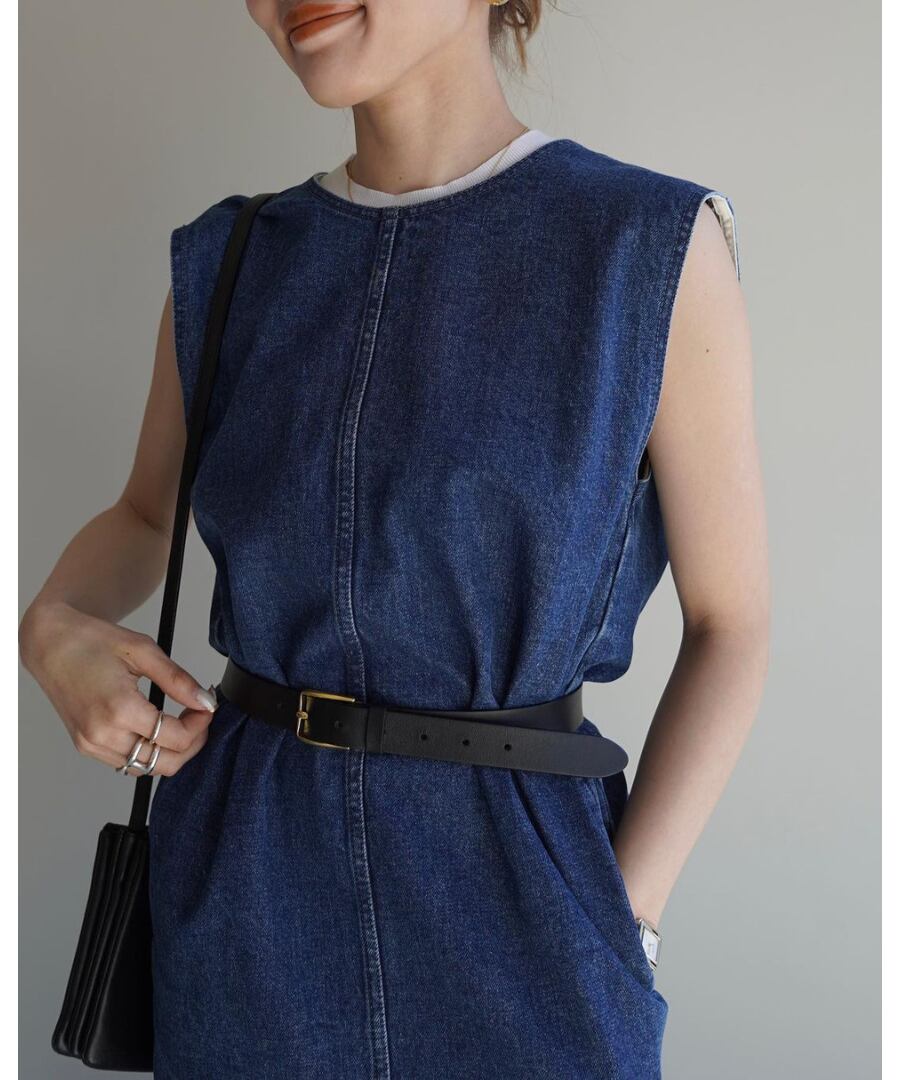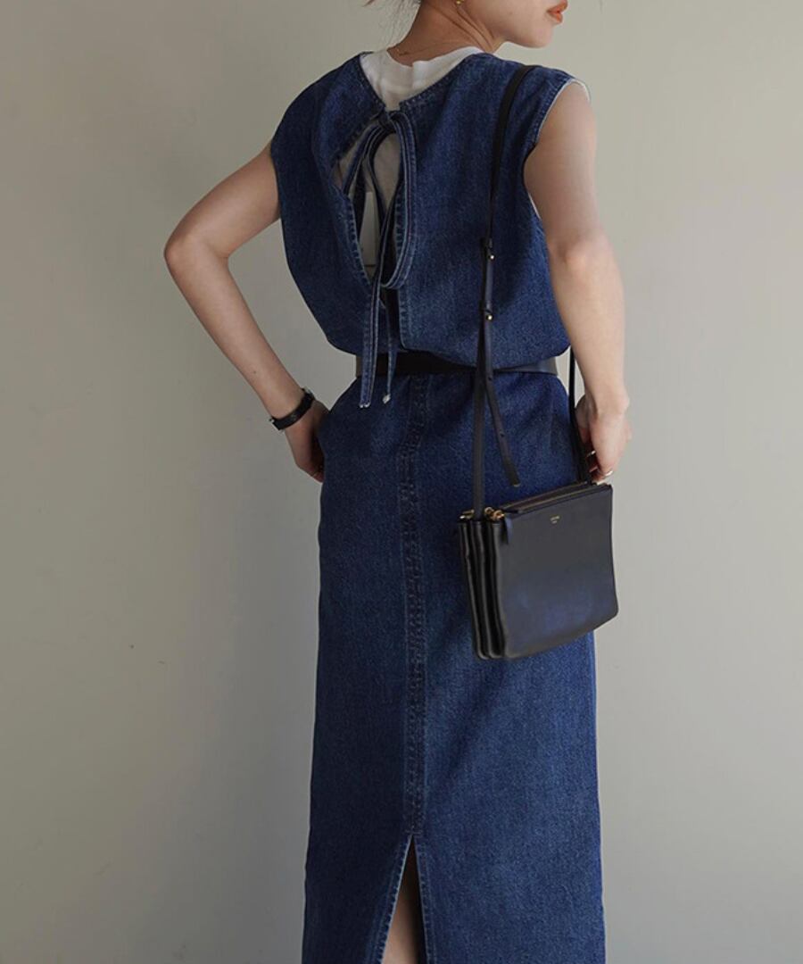 シンプルながらも印象的なノースリーブデニムベストワンピース。