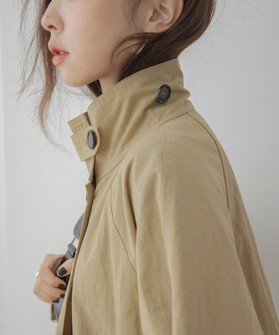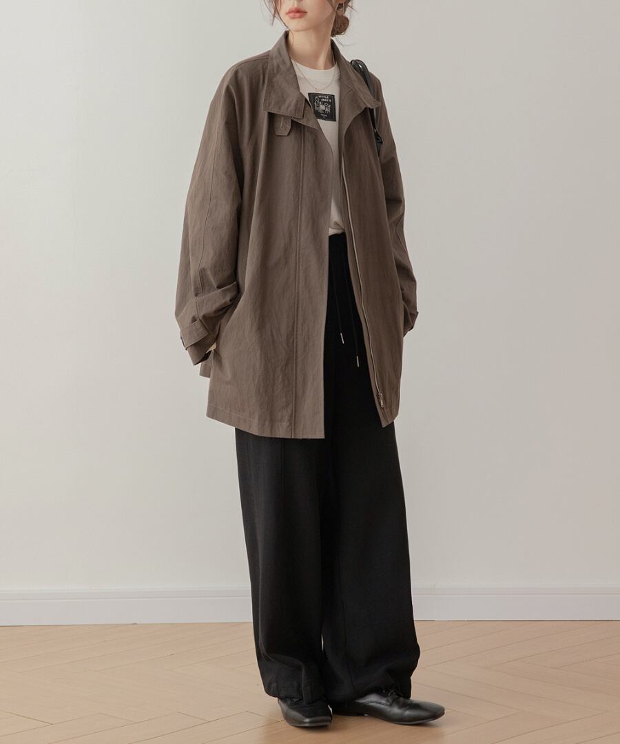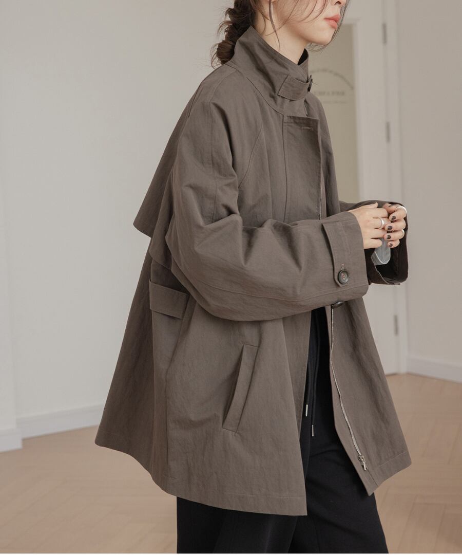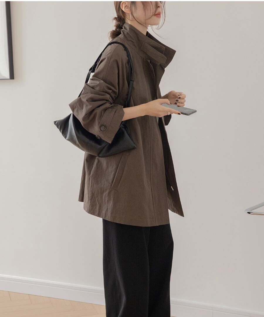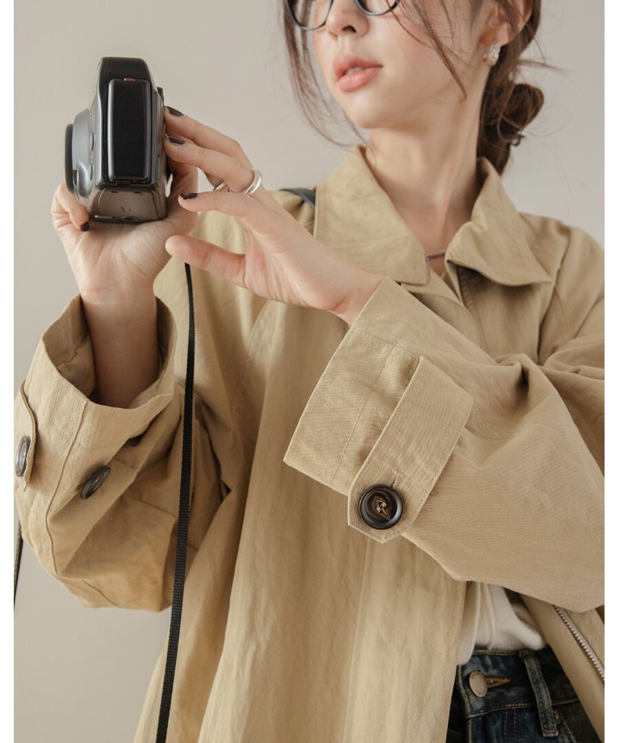 さりげないトレンチディテールが、シンプルながらも洗練された雰囲気を醸し出します。
