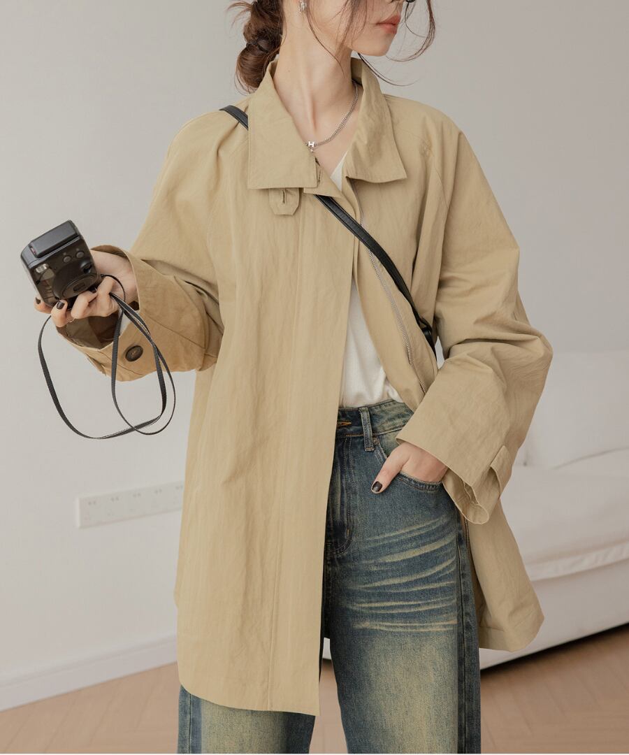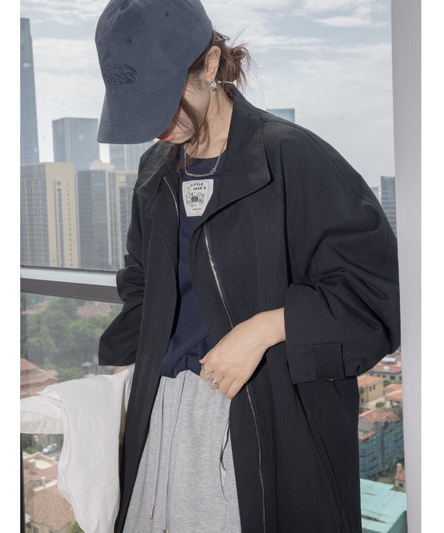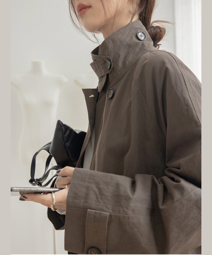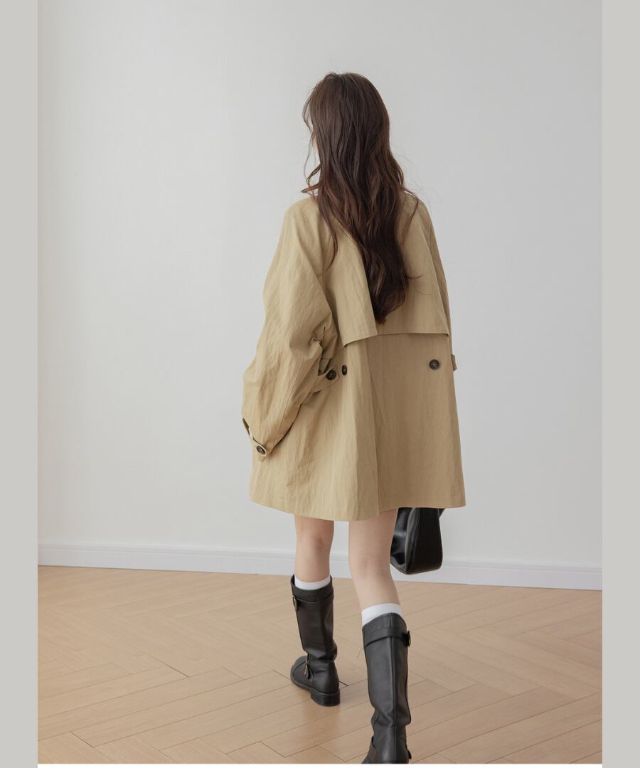 さりげないトレンチディテールが、シンプルながらも洗練された雰囲気を醸し出します。