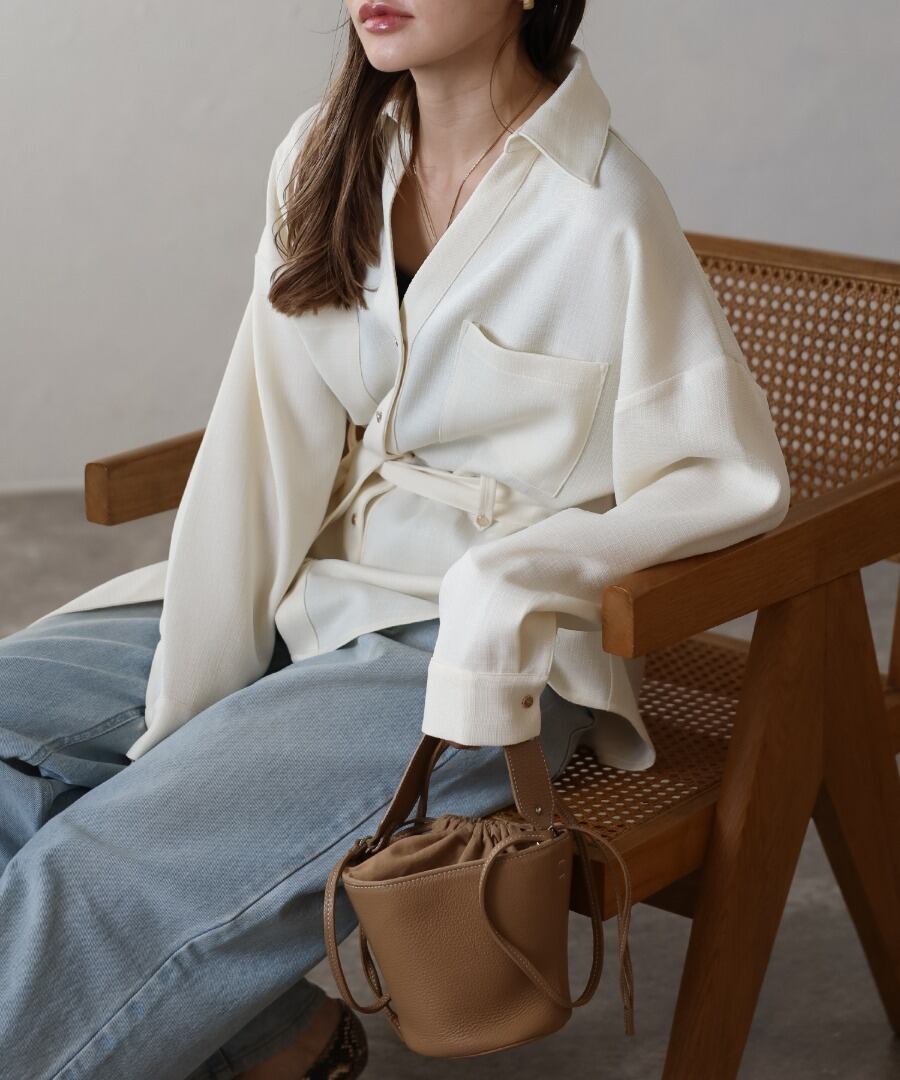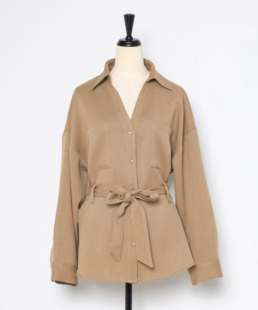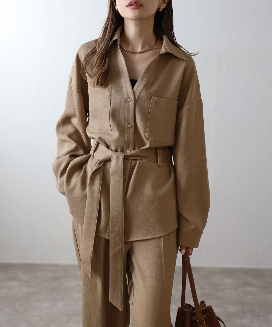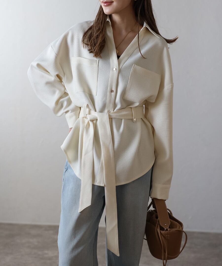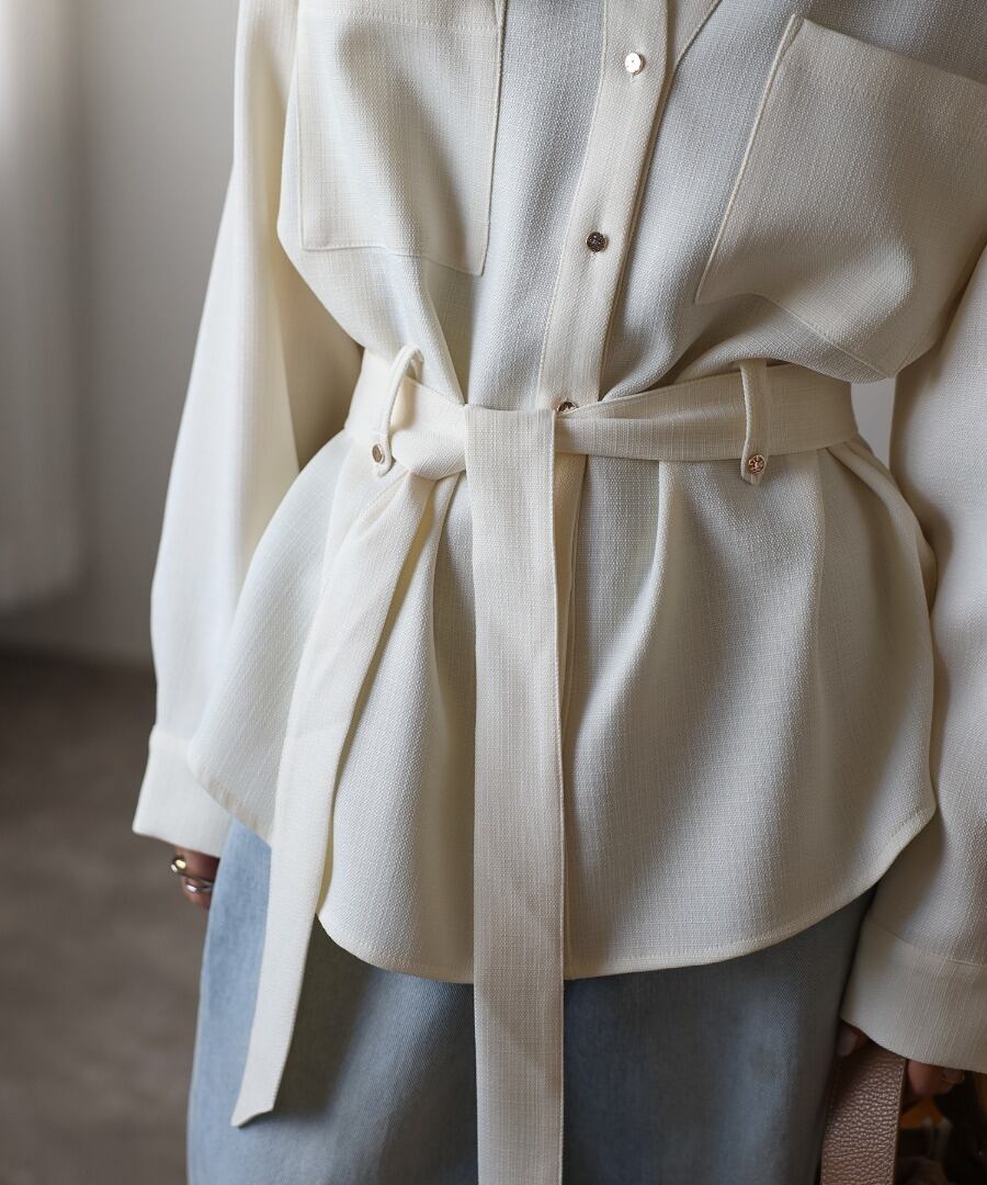 落ち着いたライトツイード素材で仕立てたベルト付きシャツ。