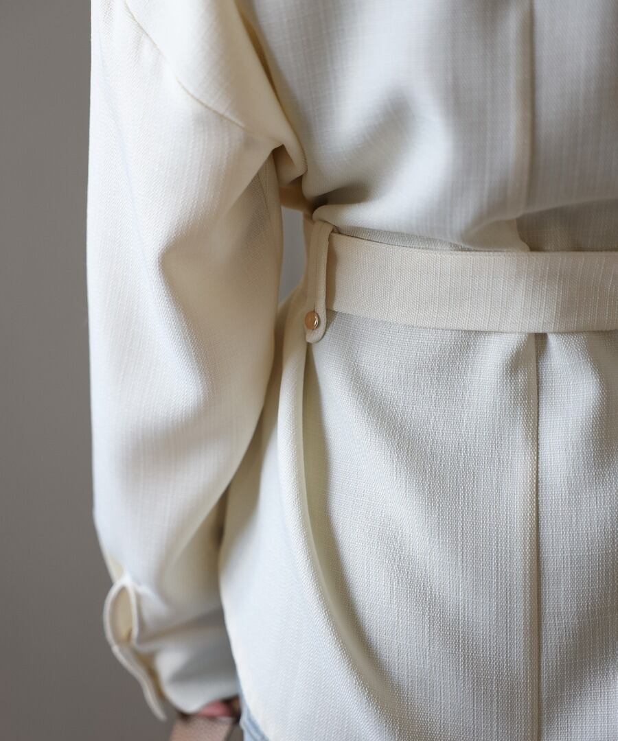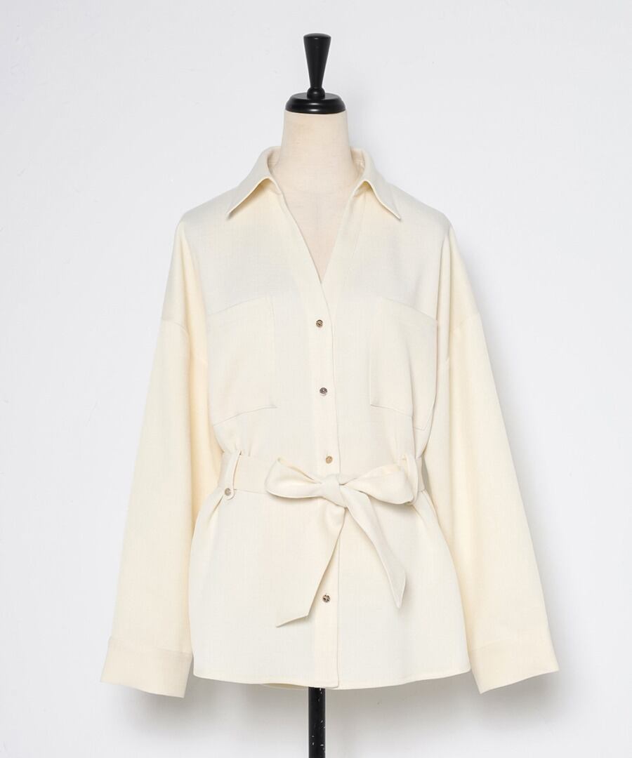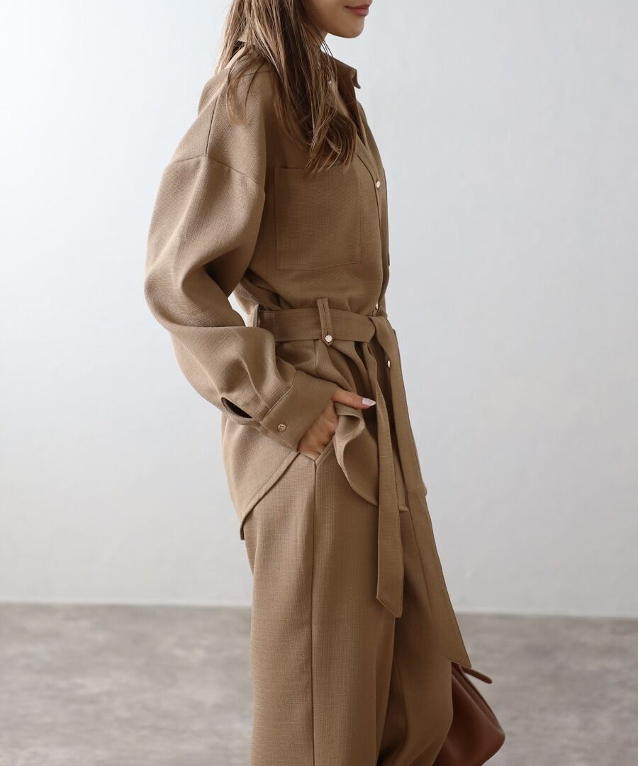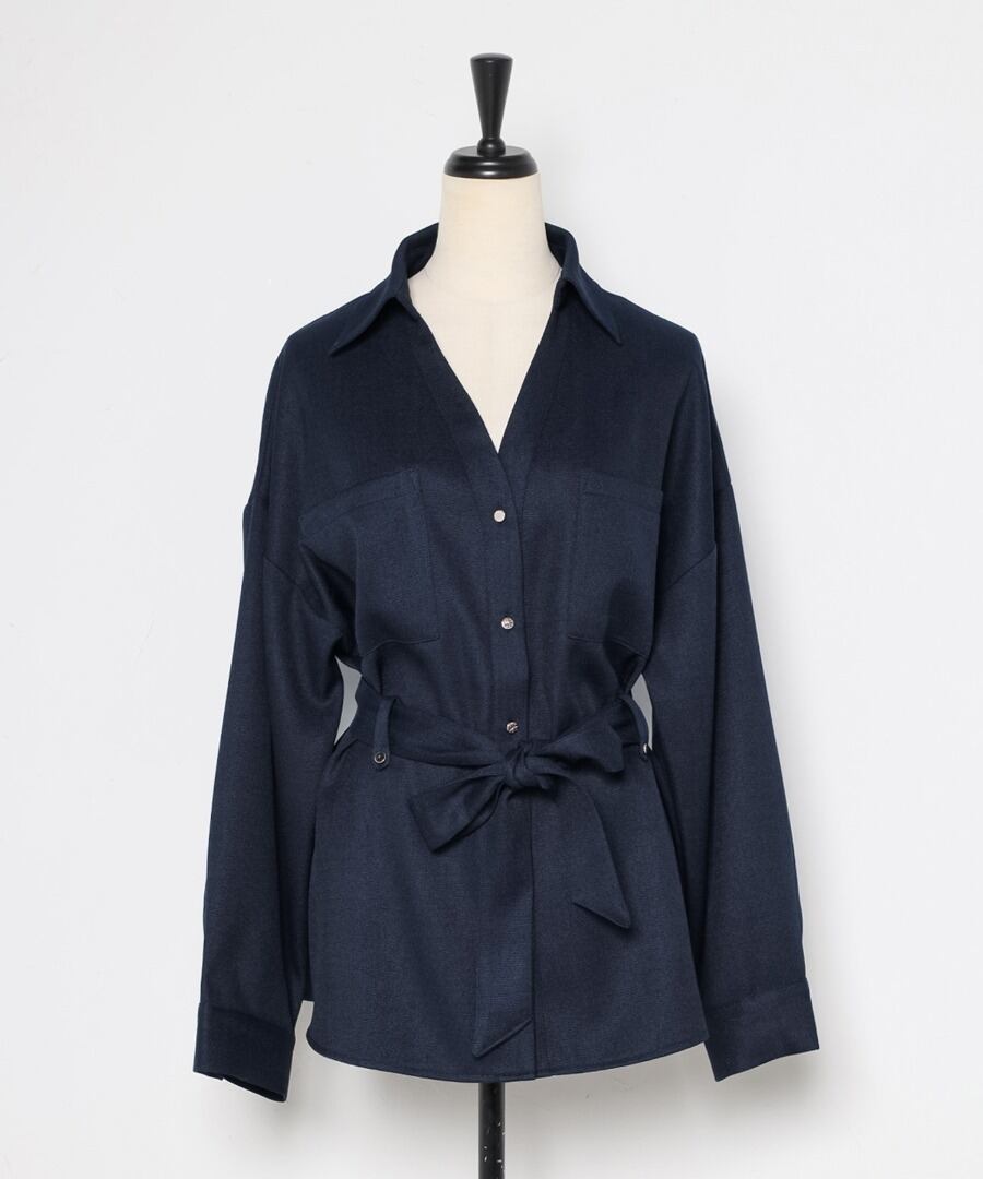 落ち着いたライトツイード素材で仕立てたベルト付きシャツ。