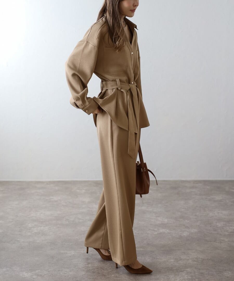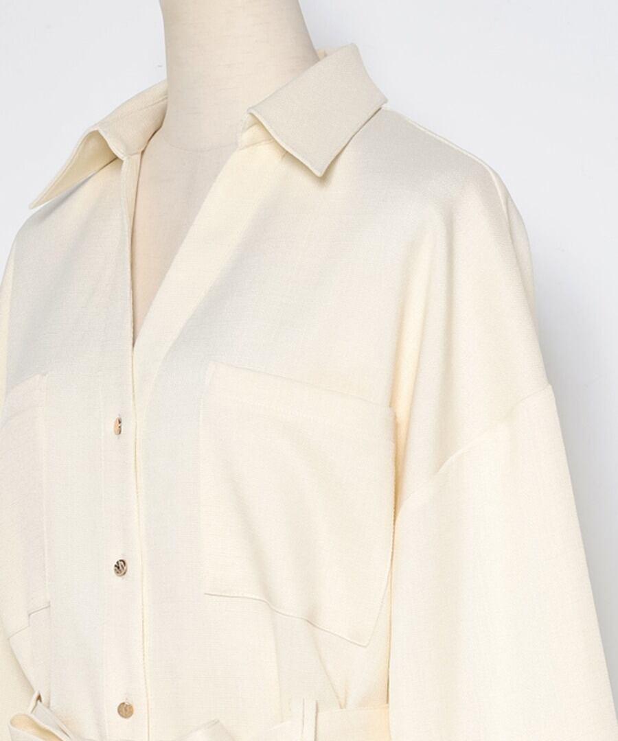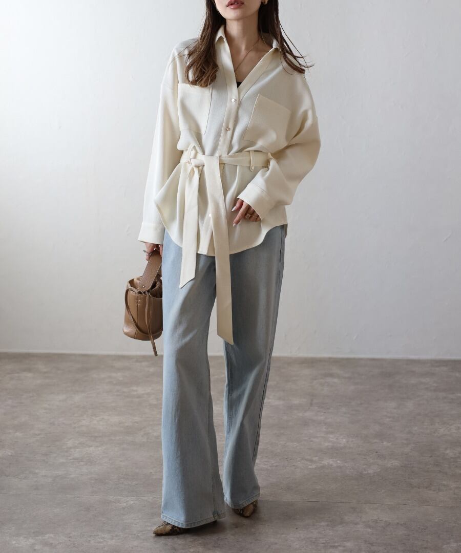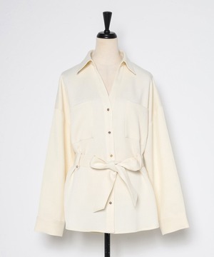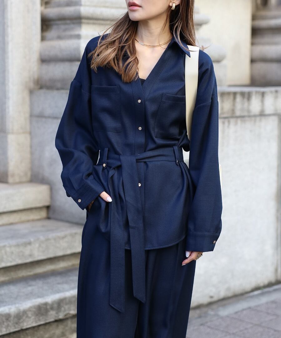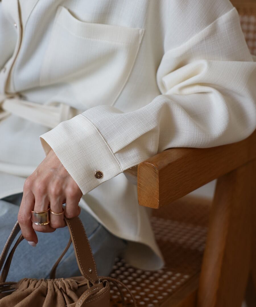 落ち着いたライトツイード素材で仕立てたベルト付きシャツ。