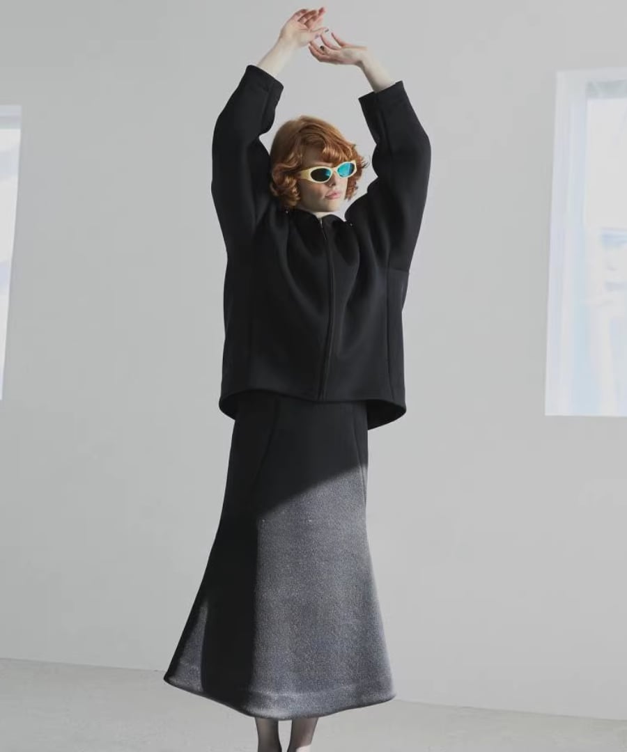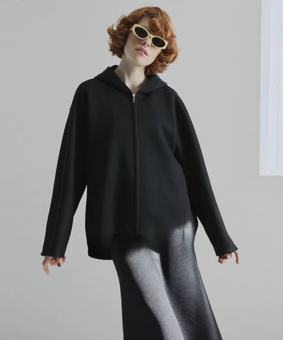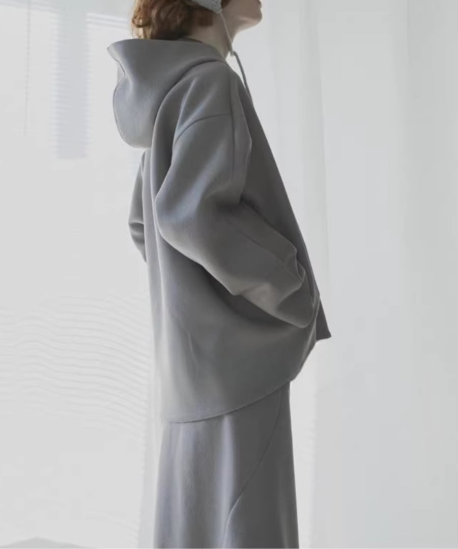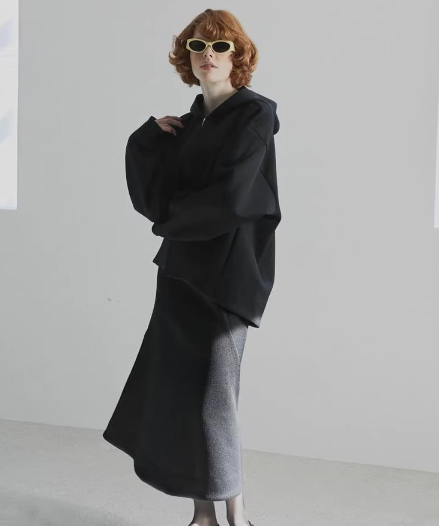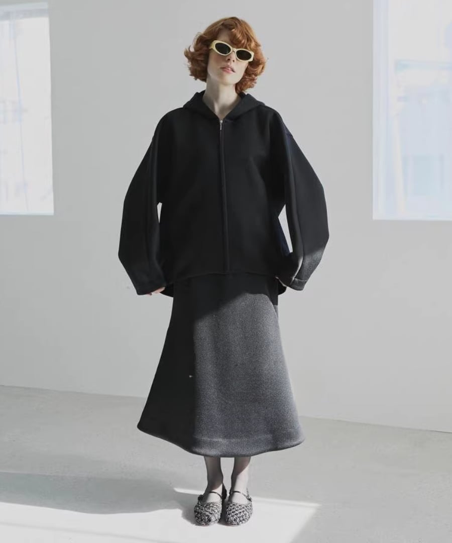 フードが付いているトップスがカジュアルさを演出する一方、スカート部分は柔らかく落ち感のあるデザインで、女性らしいシルエットを添えます。