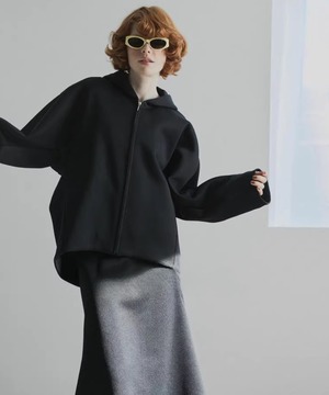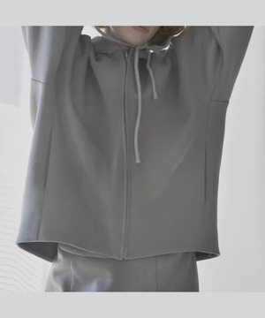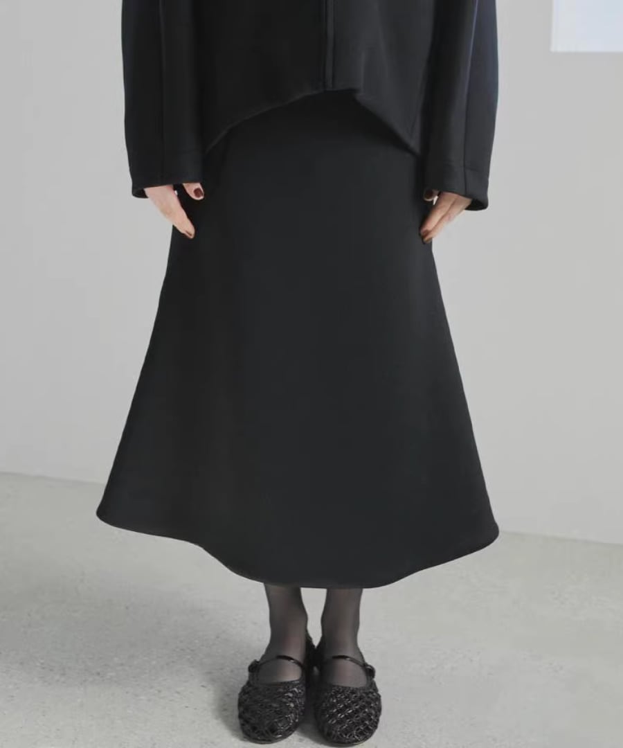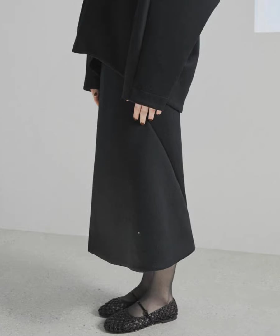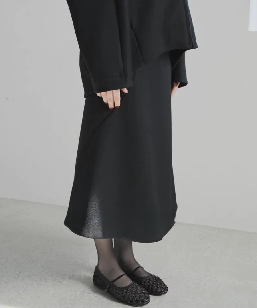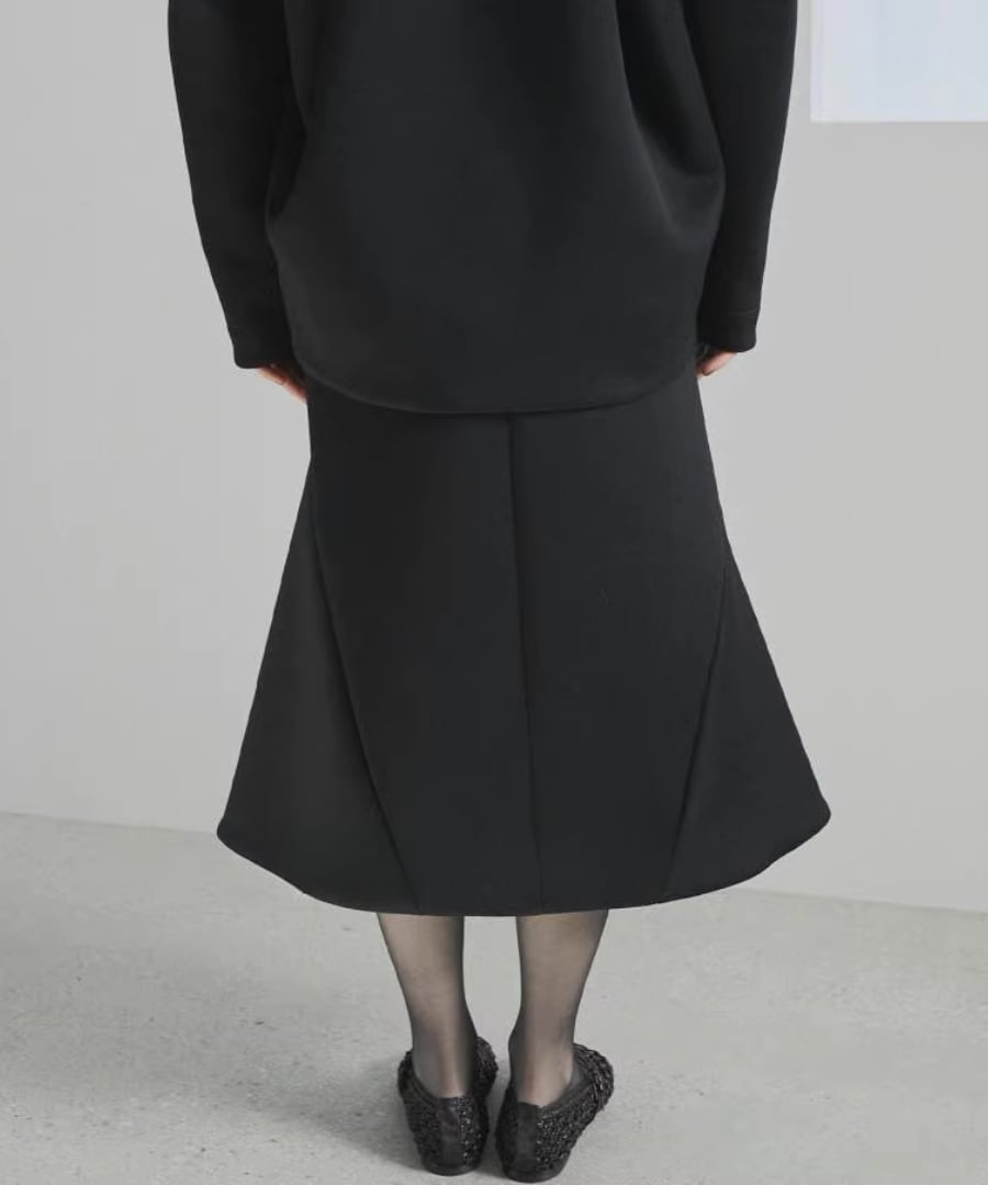 フードが付いているトップスがカジュアルさを演出する一方、スカート部分は柔らかく落ち感のあるデザインで、女性らしいシルエットを添えます。