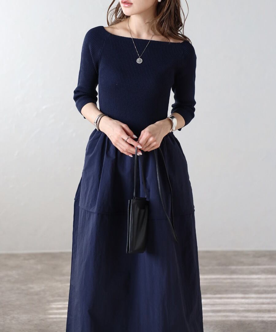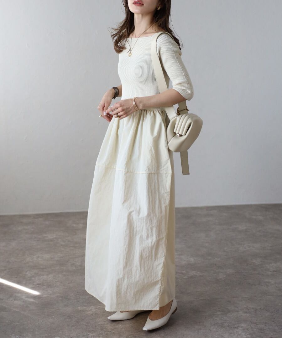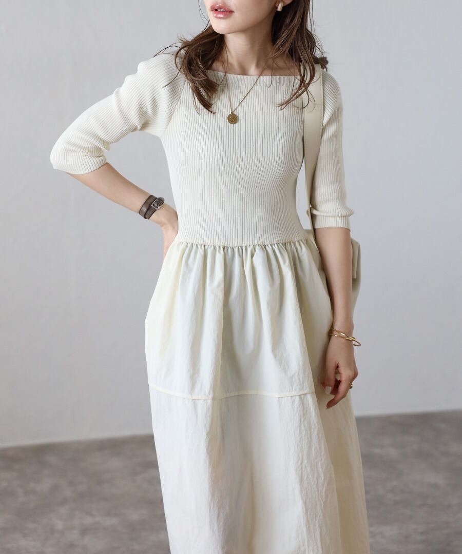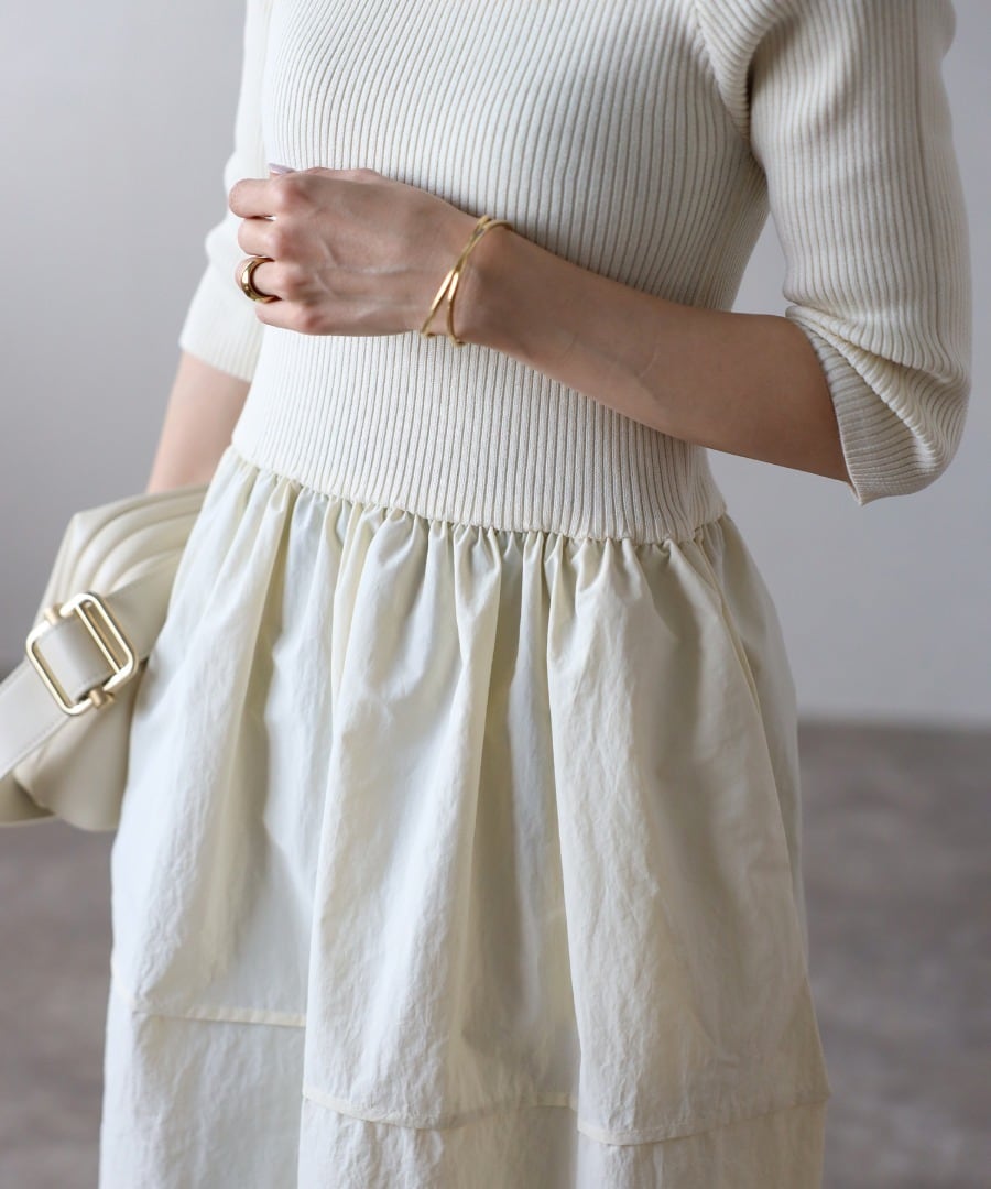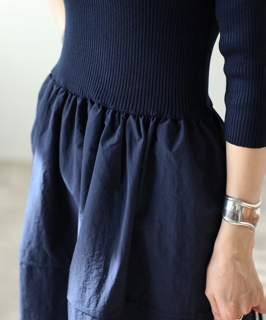 立体感のあるリブニットと、ハリのあるナイロン素材を組み合わせたドッキングワンピース。