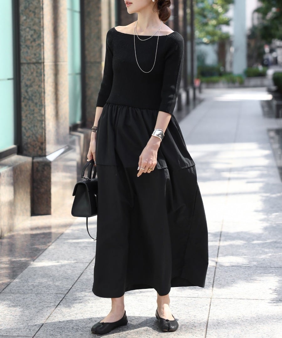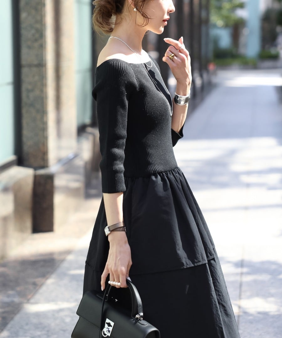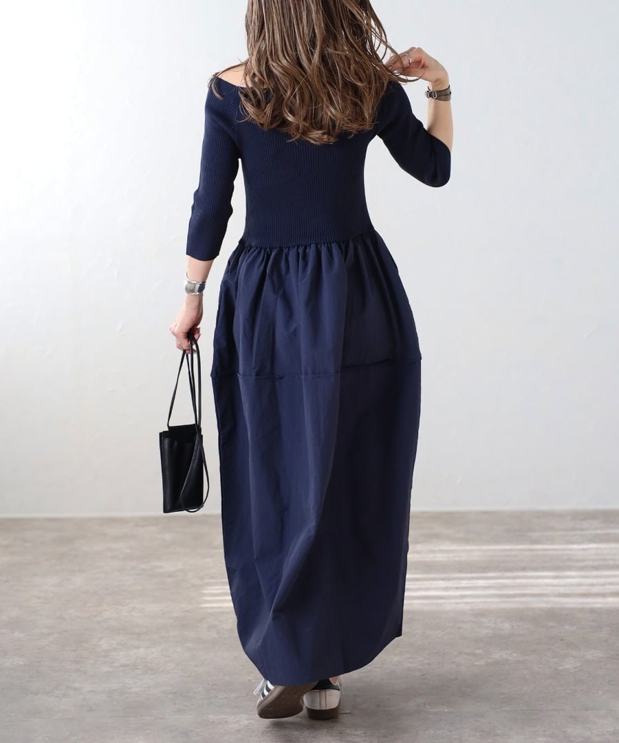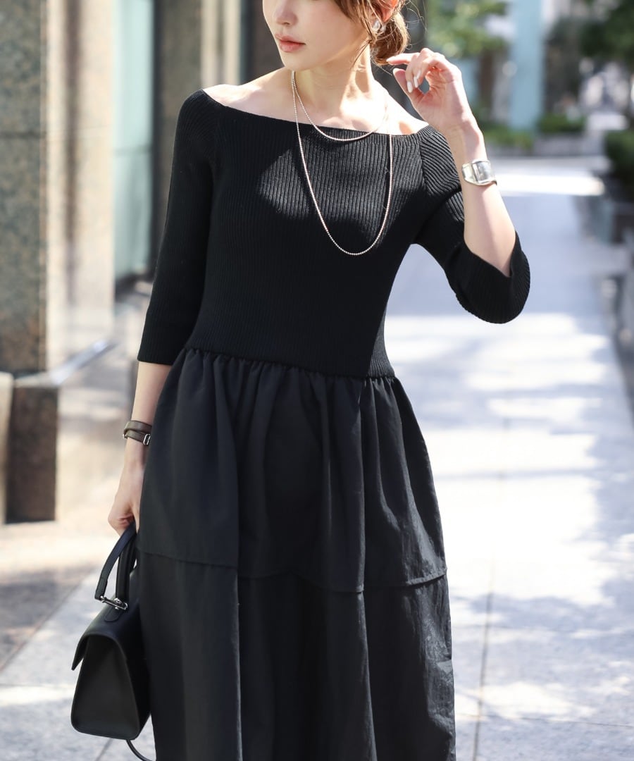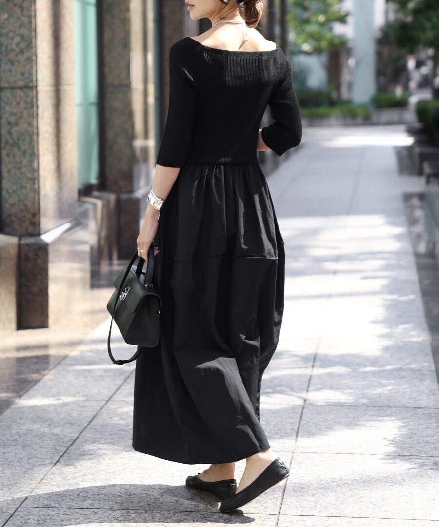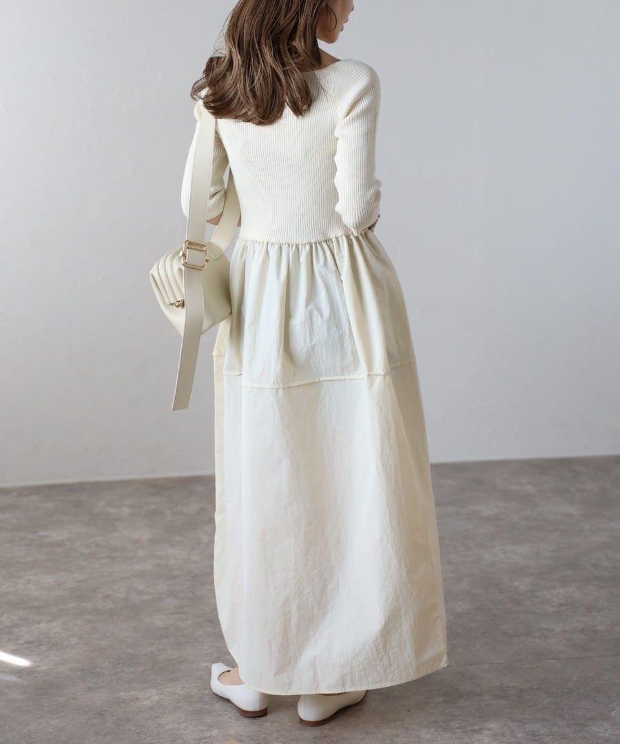 立体感のあるリブニットと、ハリのあるナイロン素材を組み合わせたドッキングワンピース。