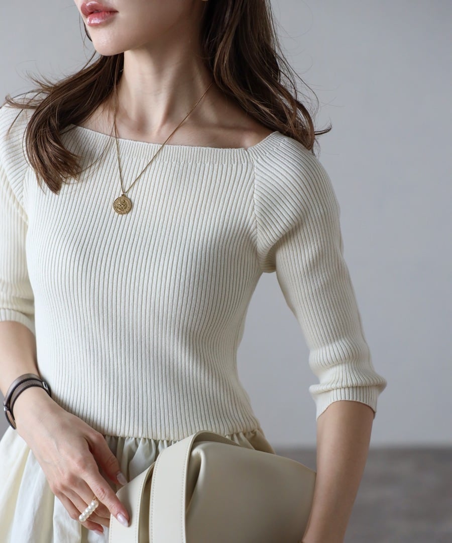 スクエアネックがデコルテを美しく魅せ、女性らしい抜け感を演出します。
