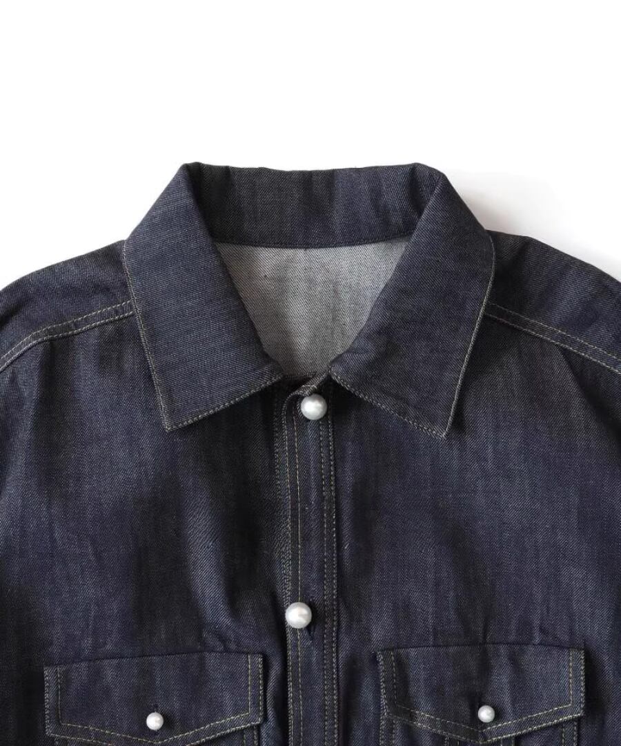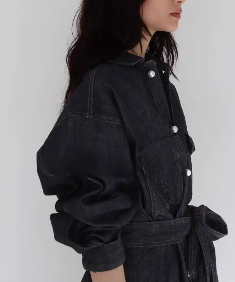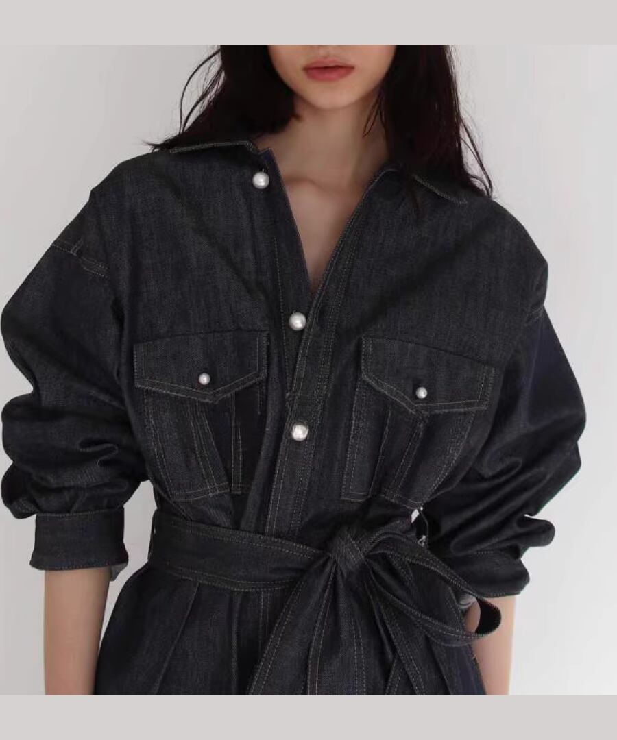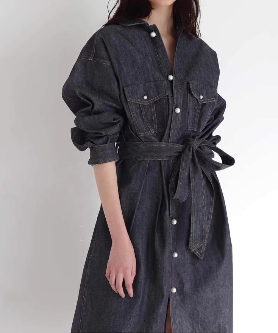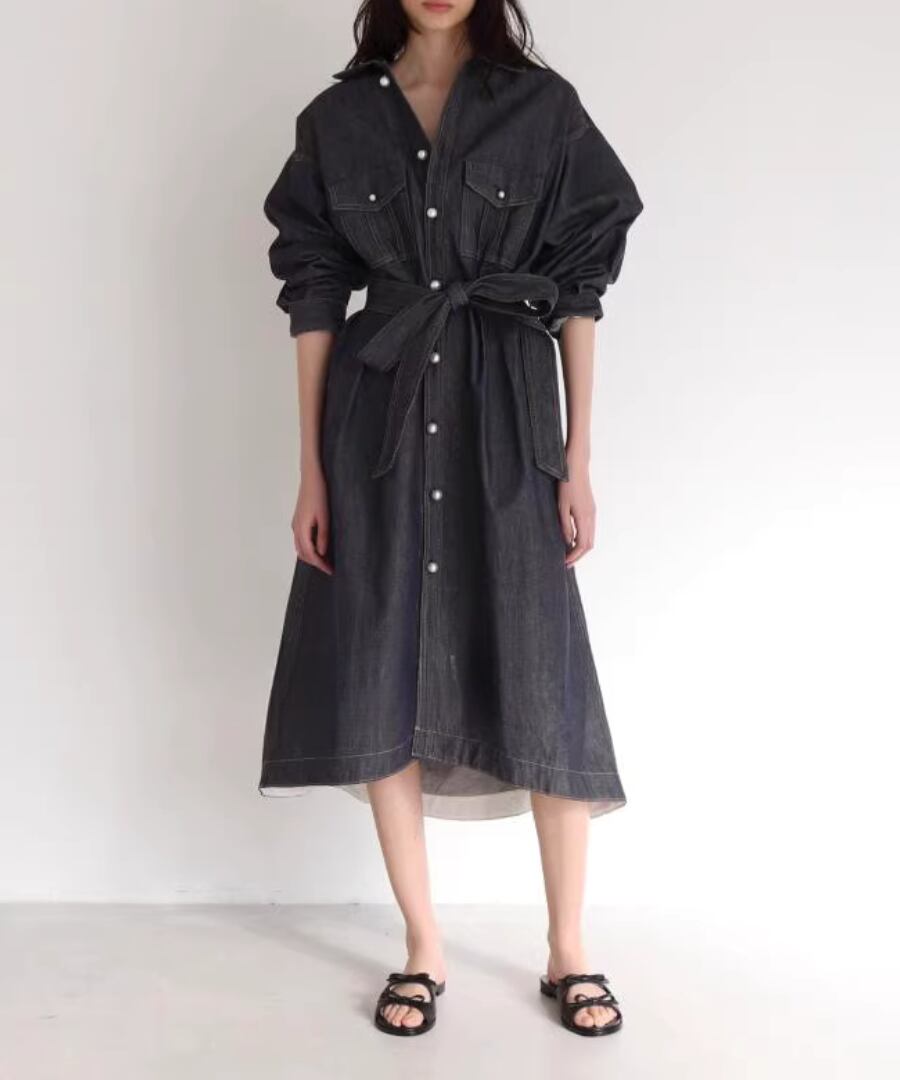 親しみやすさを兼ね備えたパールボタンのデニムワンピース。