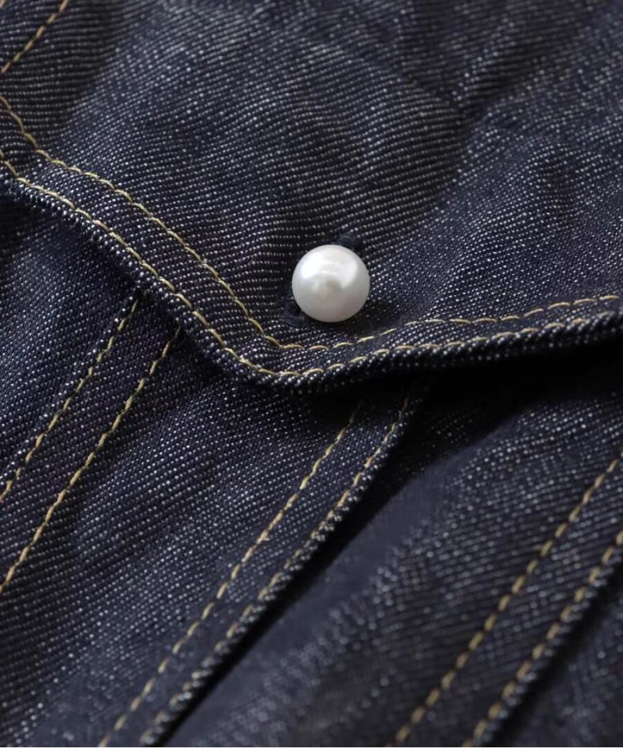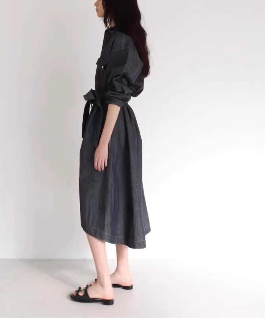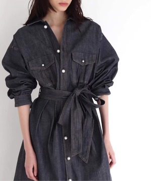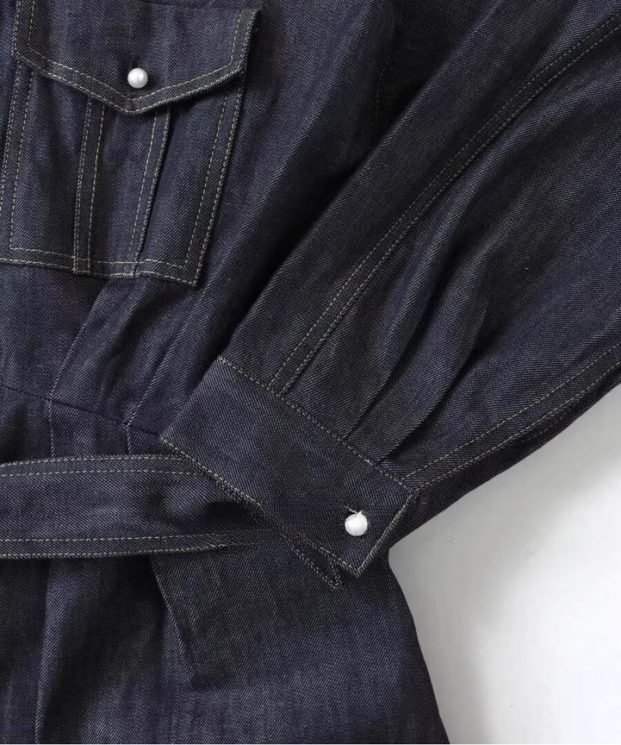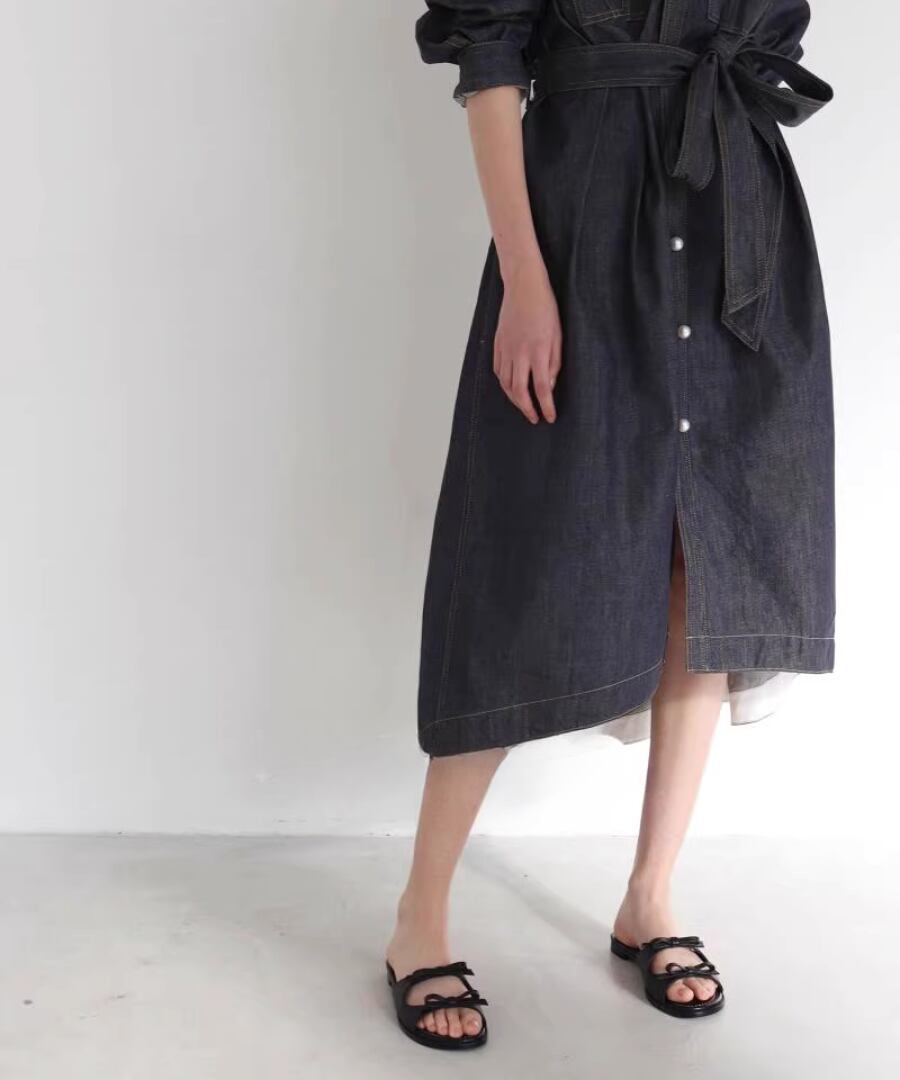親しみやすさを兼ね備えたパールボタンのデニムワンピース。
