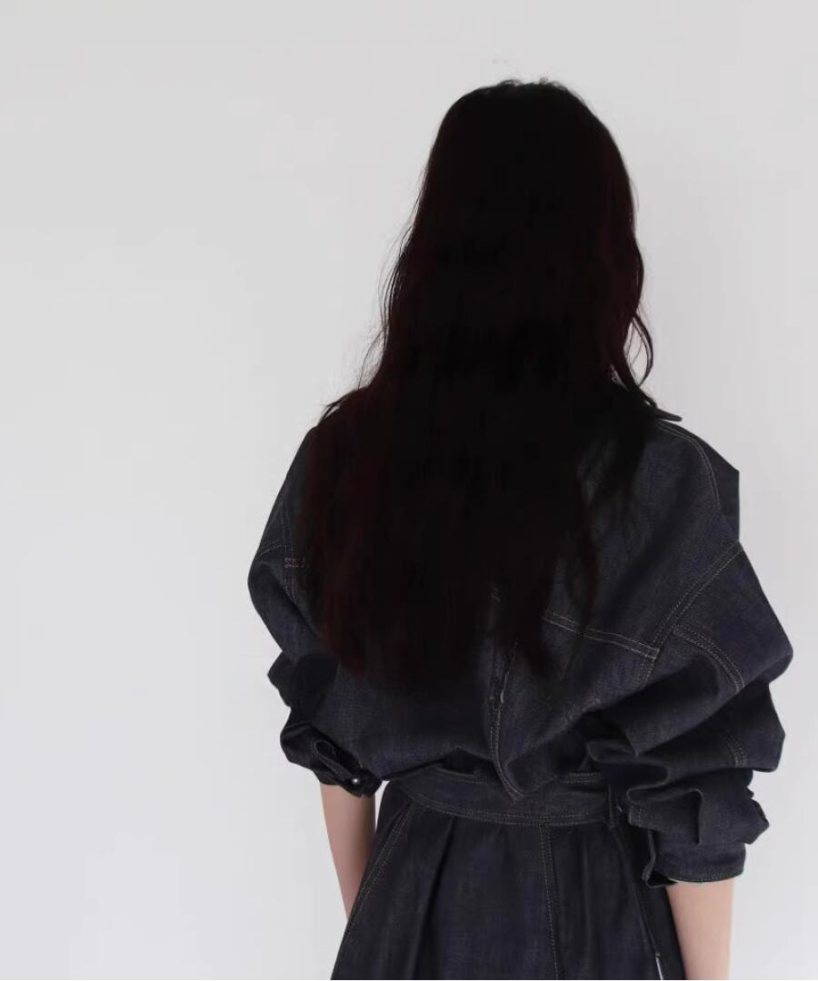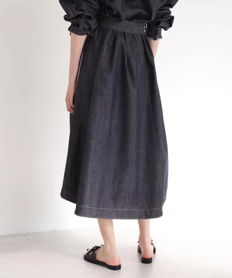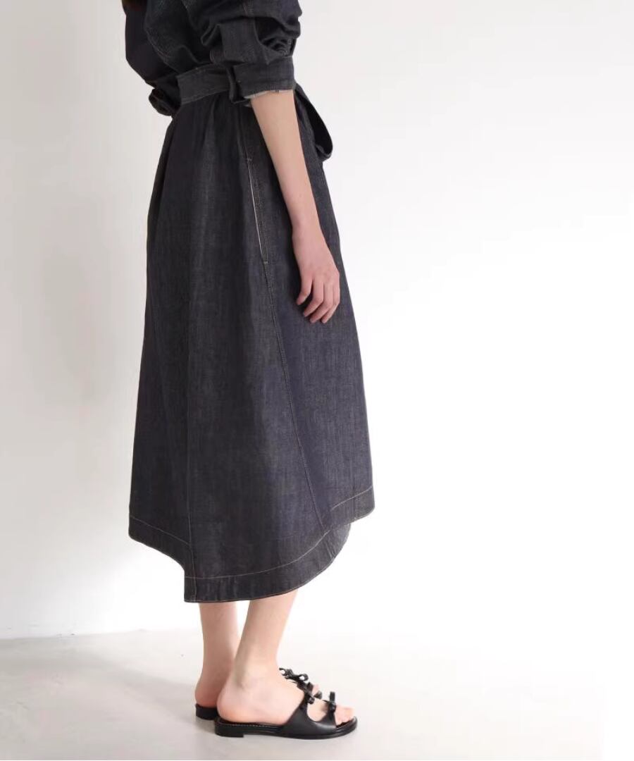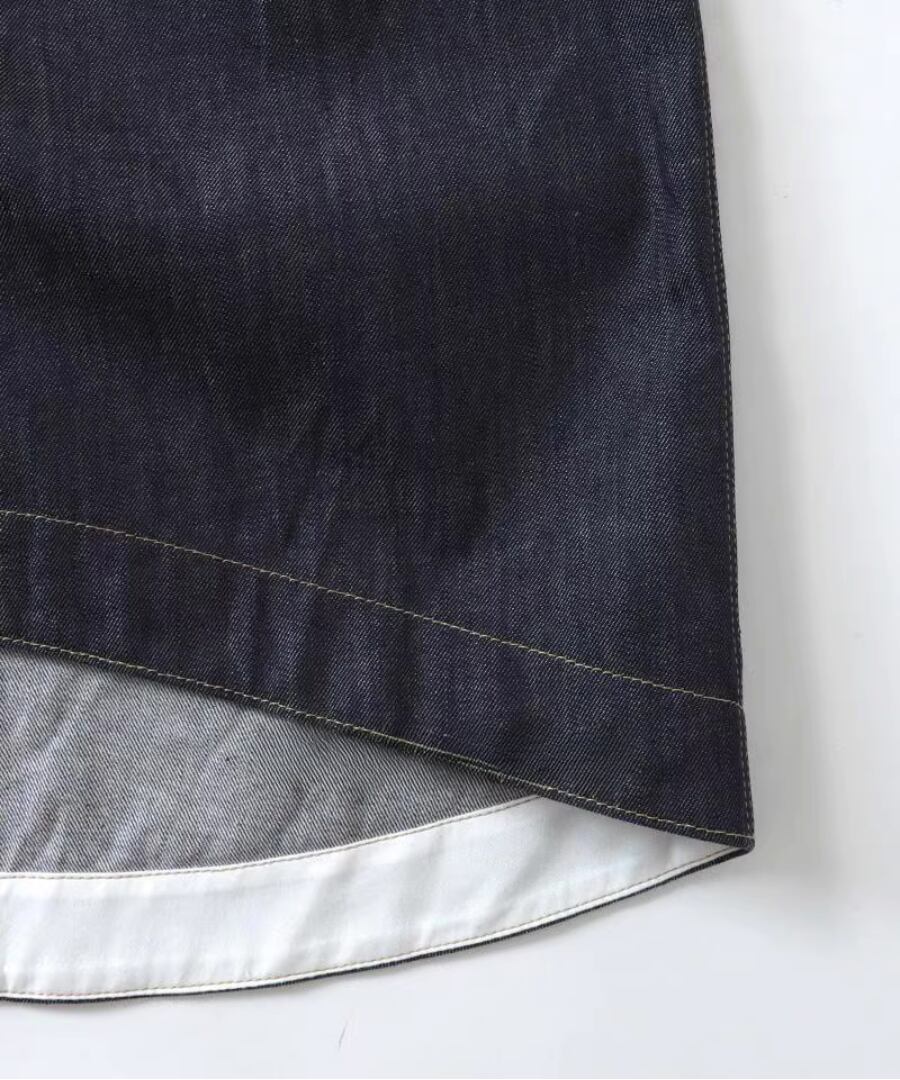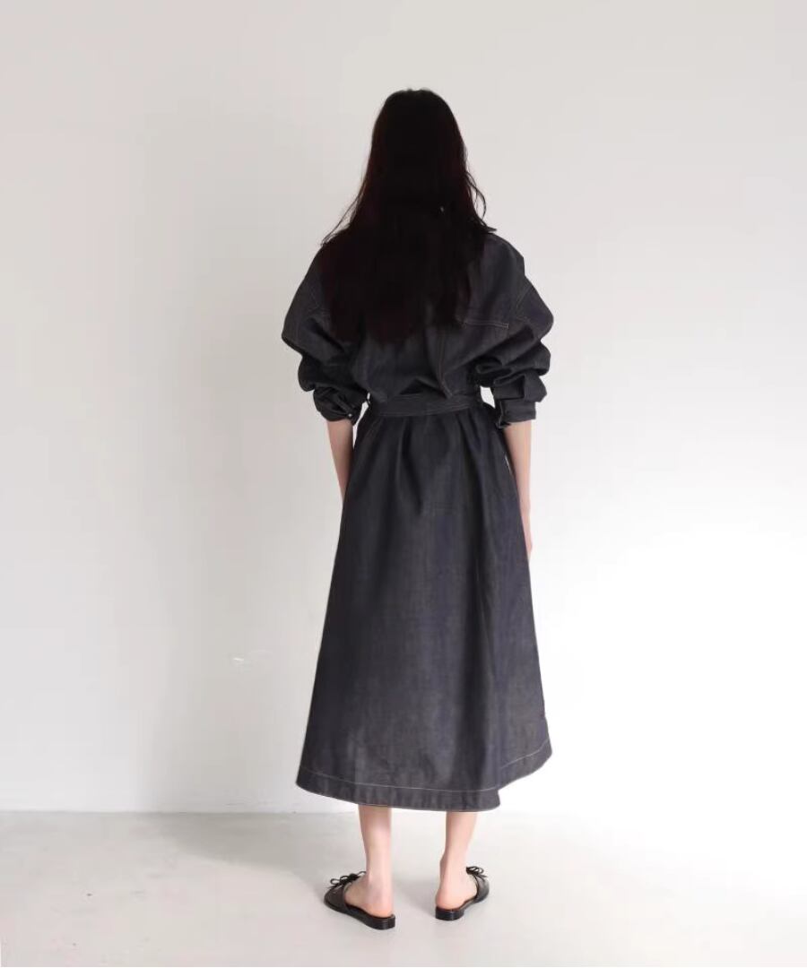 親しみやすさを兼ね備えたパールボタンのデニムワンピース。