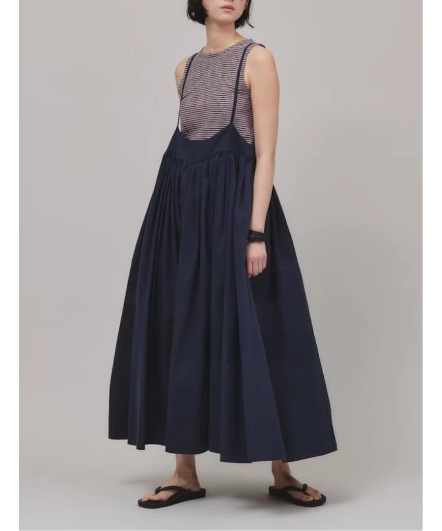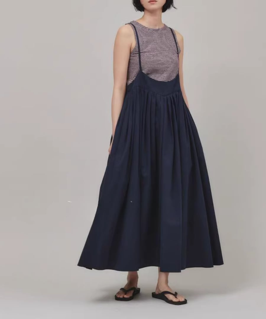 細いストラップが肩を華奢に見せつつ、スイングの動きが女性らしさを引き立てます。