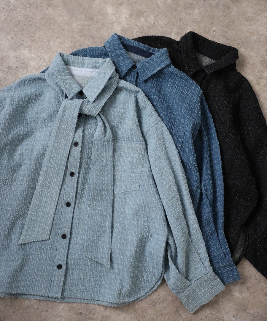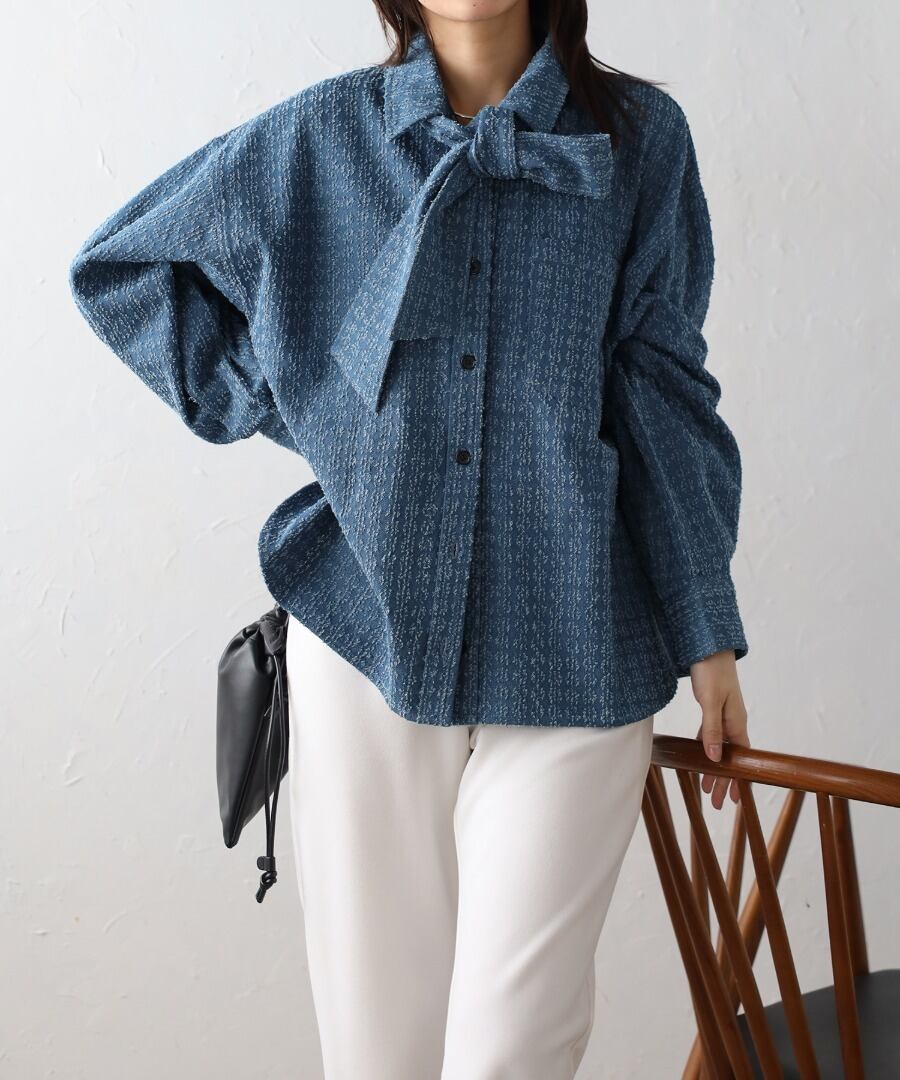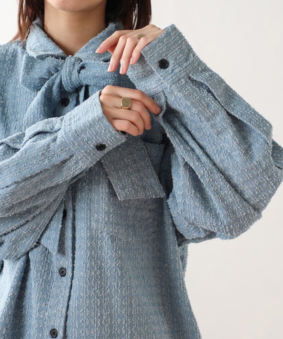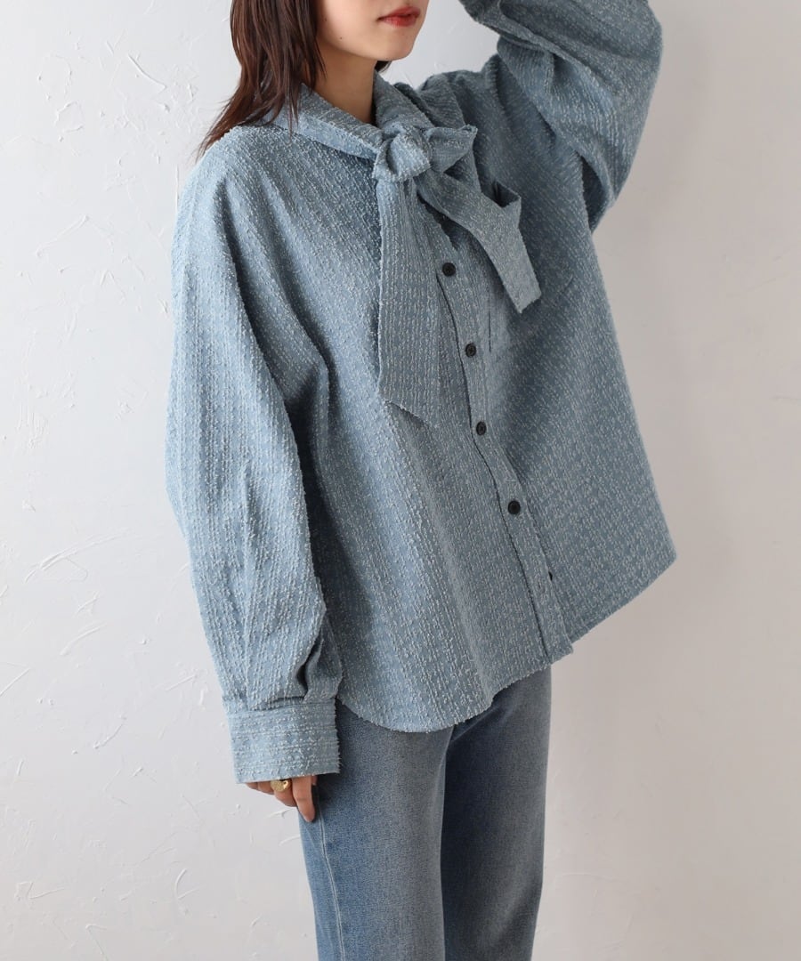 取り外し可能なボウタイで2WAYで着回せるクラッシュデニムシャツ