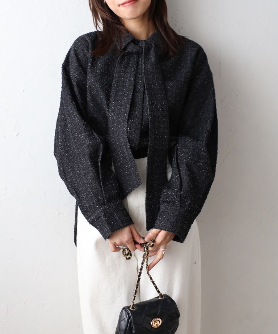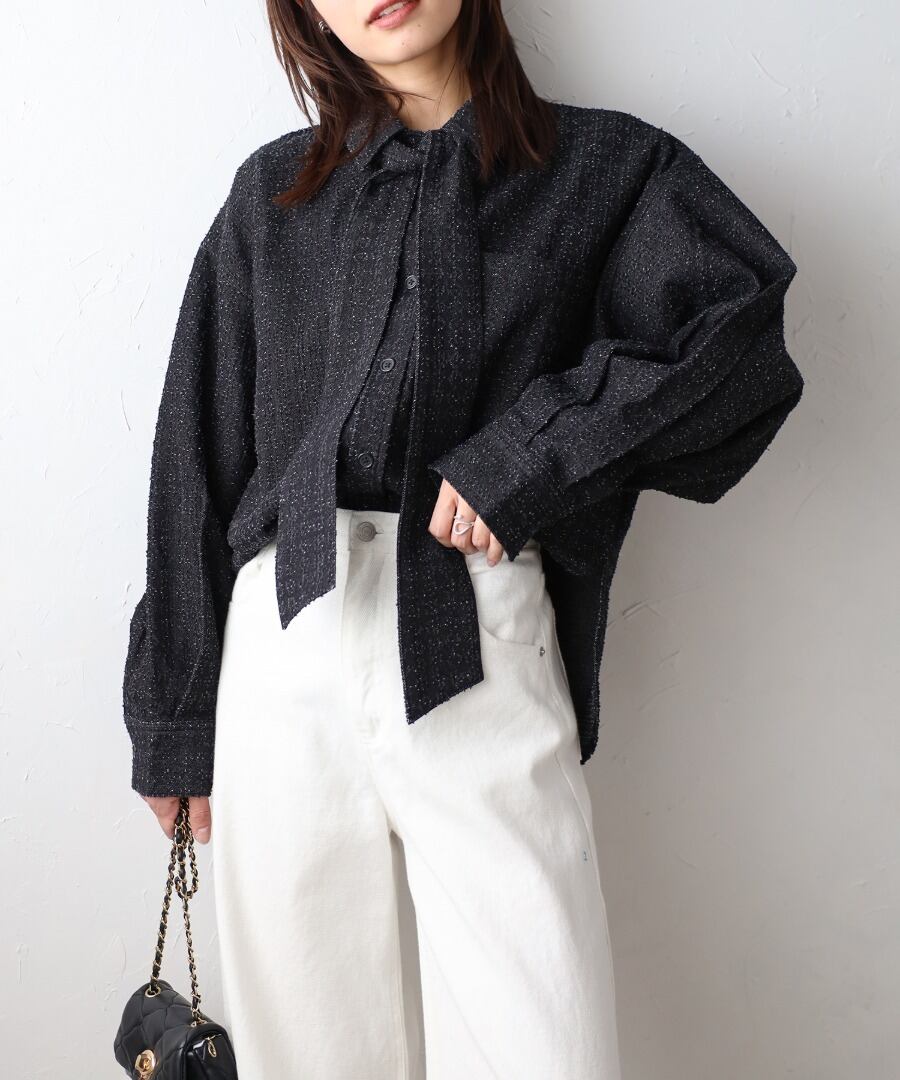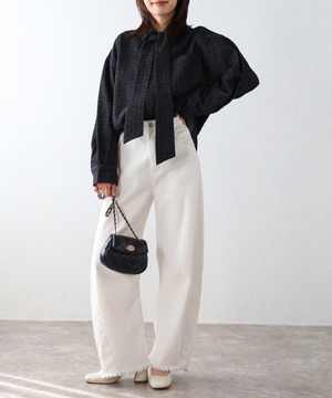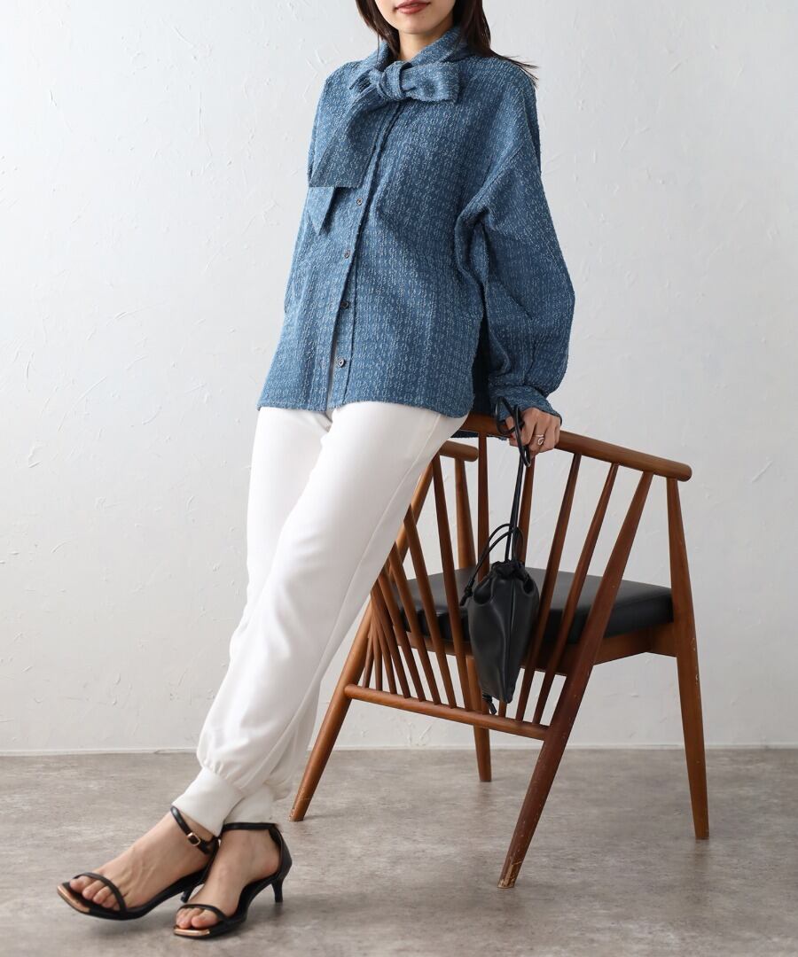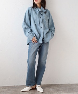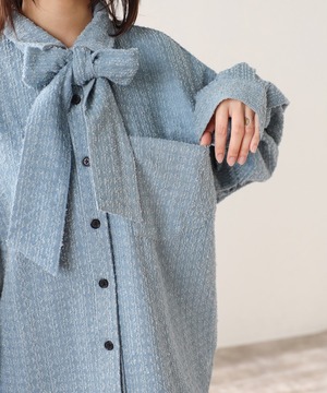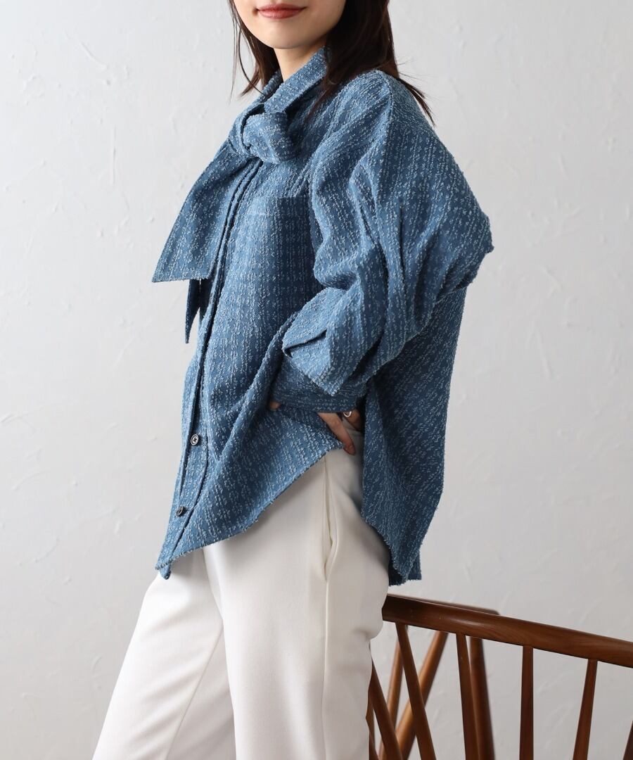 取り外し可能なボウタイで2WAYで着回せるクラッシュデニムシャツ