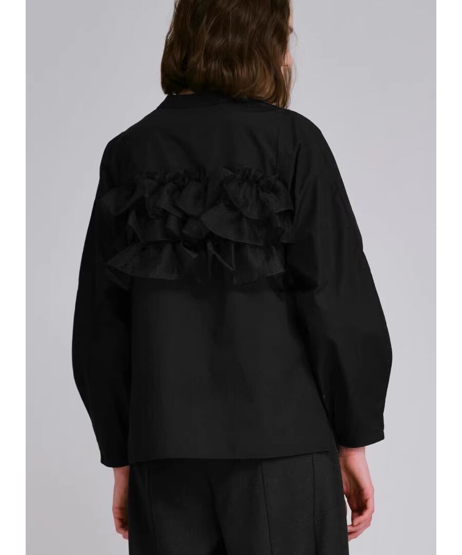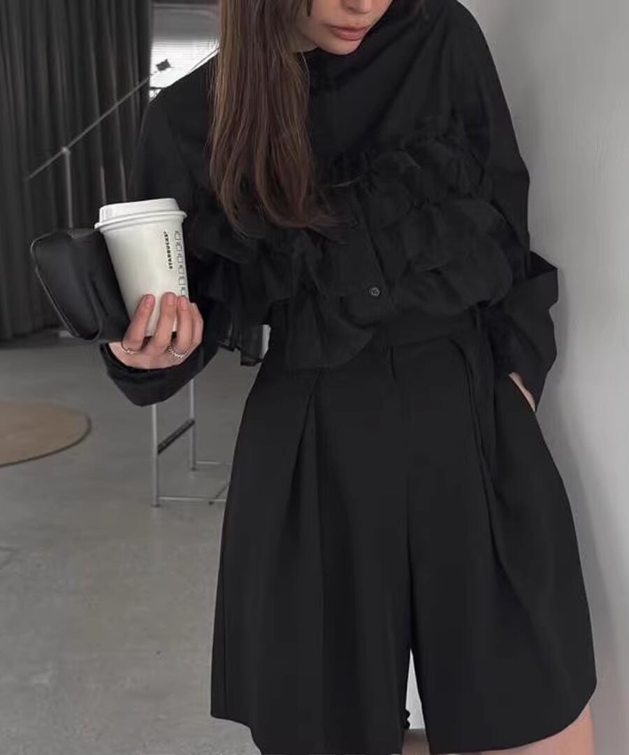 胸元のフリルディテールが優雅さをプラスし女性らしさを引き立てます。