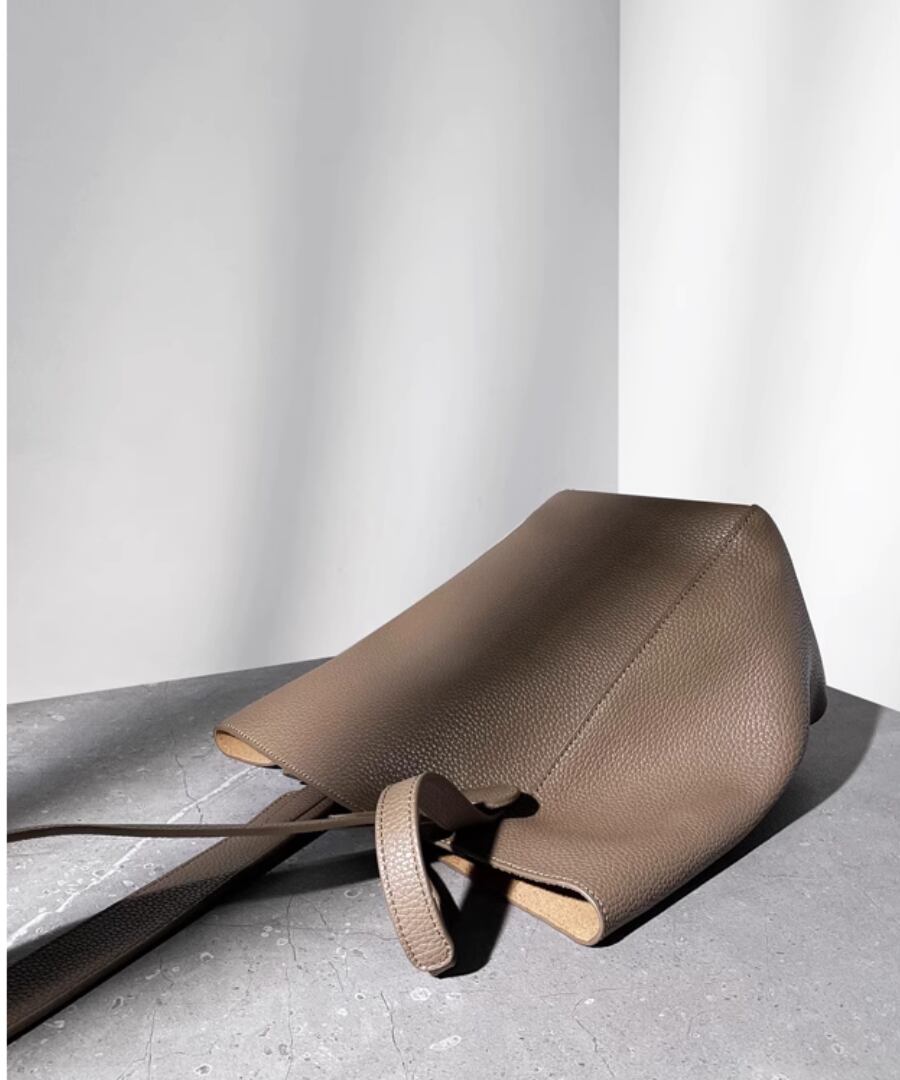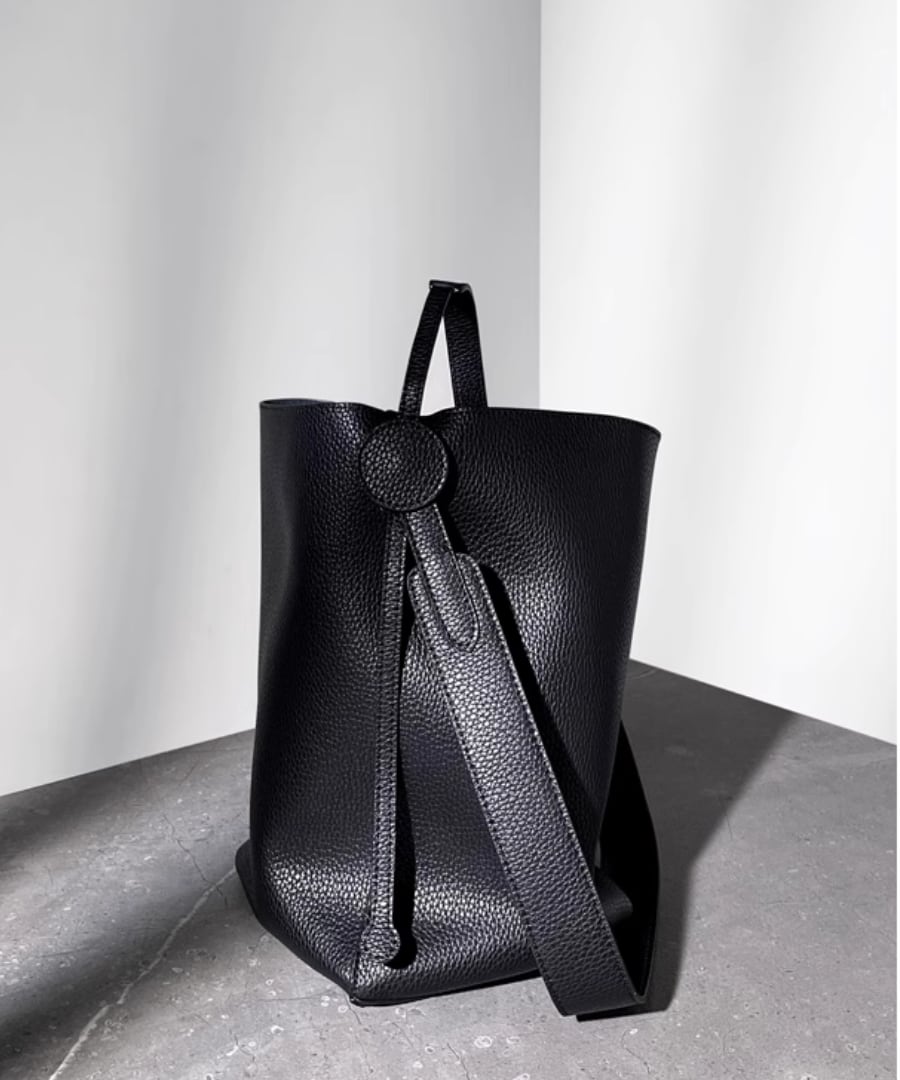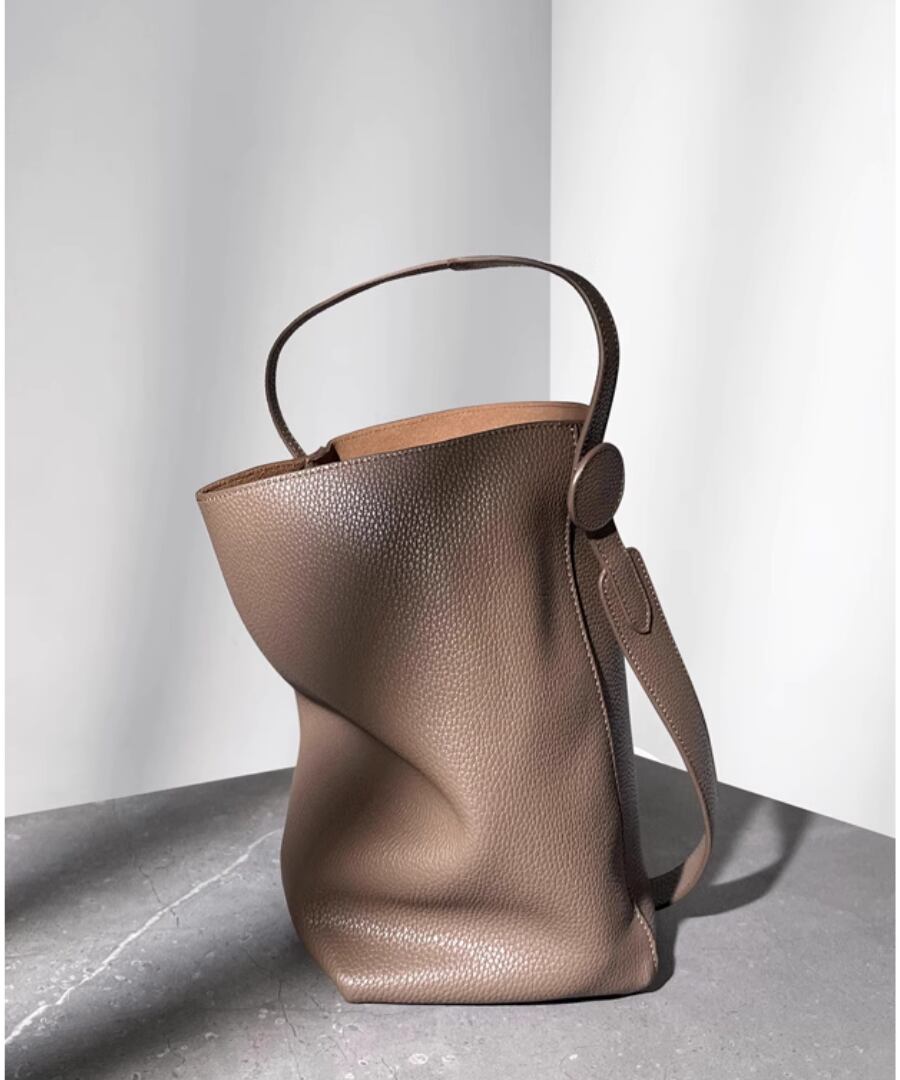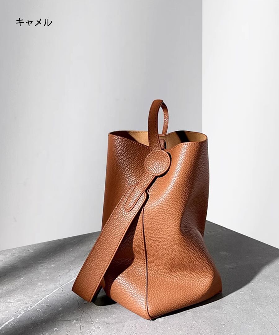 シンプルで洗練されたデザインのレザーバケットバッグ。