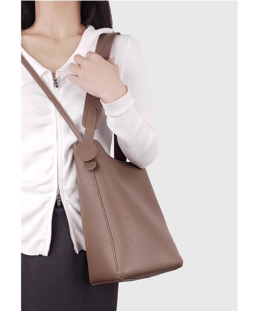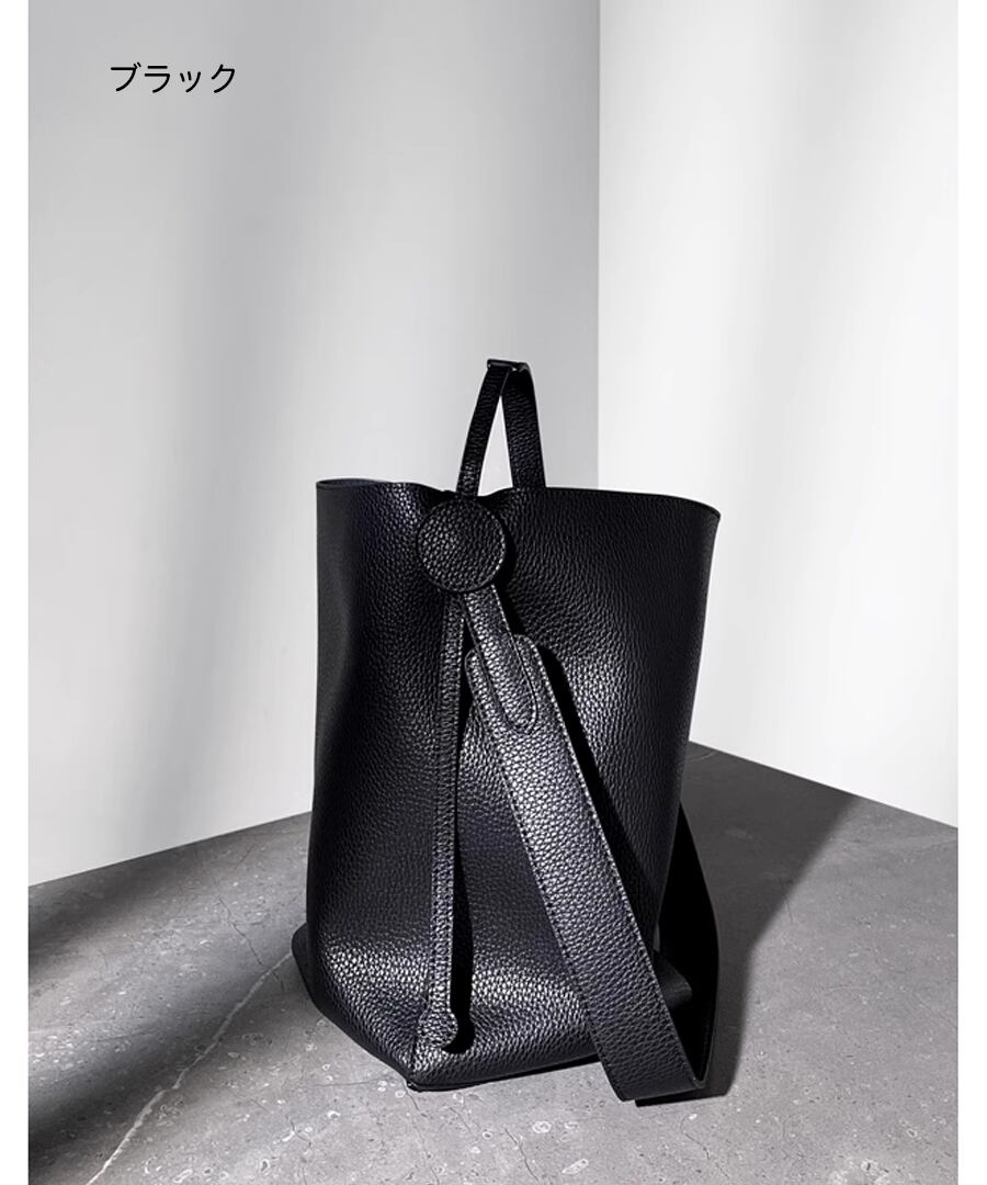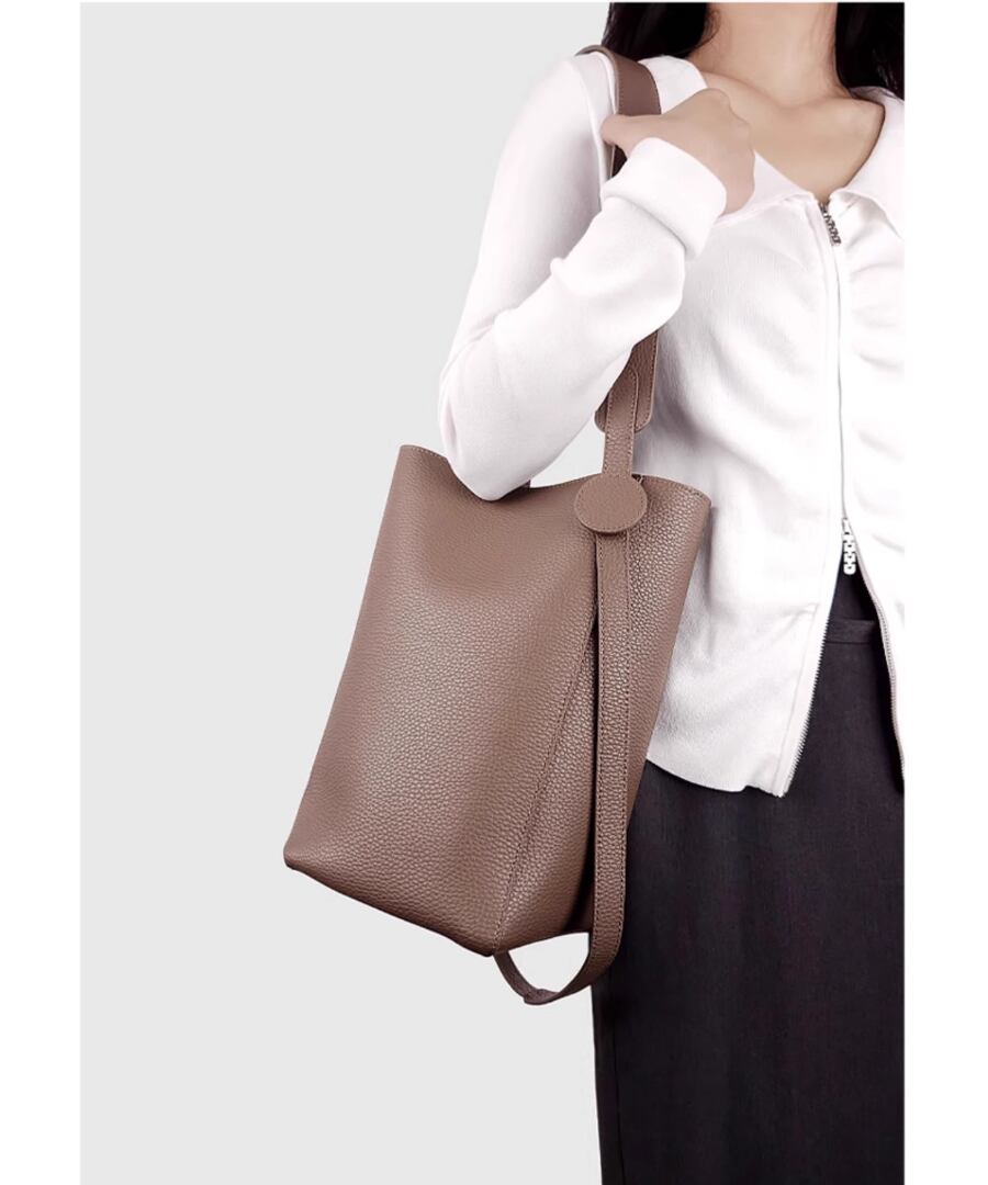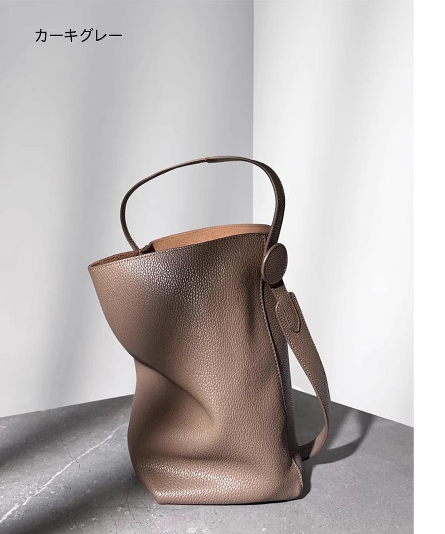 シンプルで洗練されたデザインのレザーバケットバッグ。