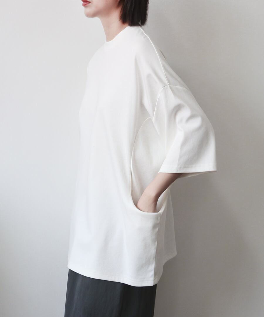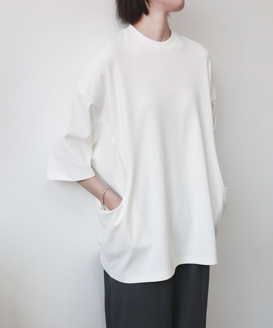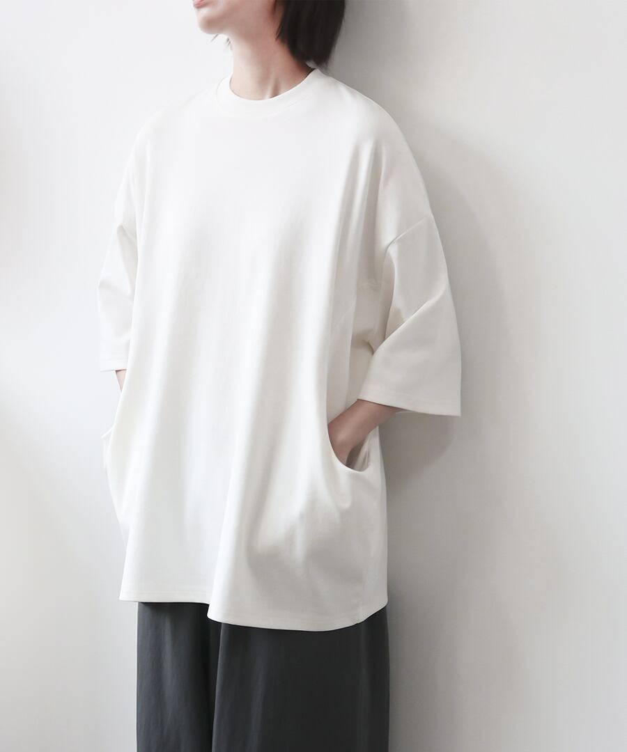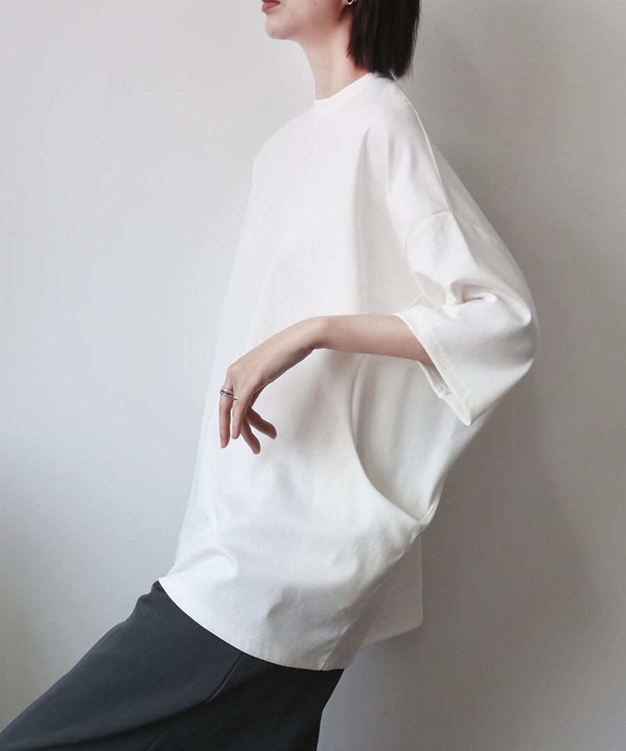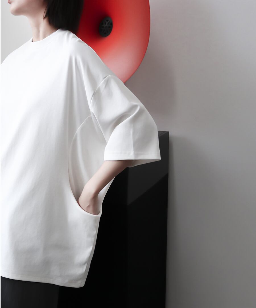素材感とリブ編みデザインが、シンプルながらも洗練された印象を与えるTシャツ。