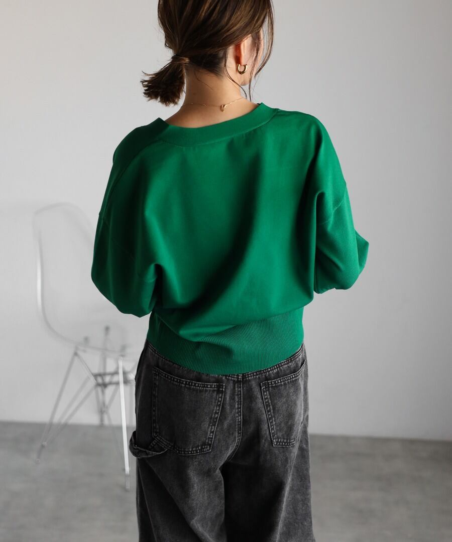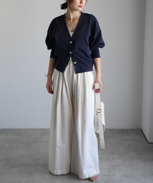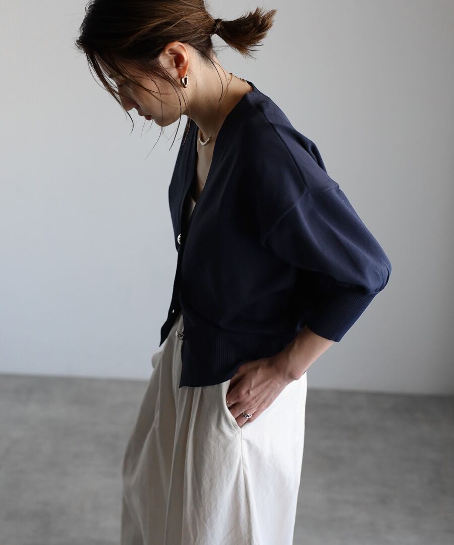 Vネックデザインが顔周りをすっきりと魅せる上品カーディガン。
