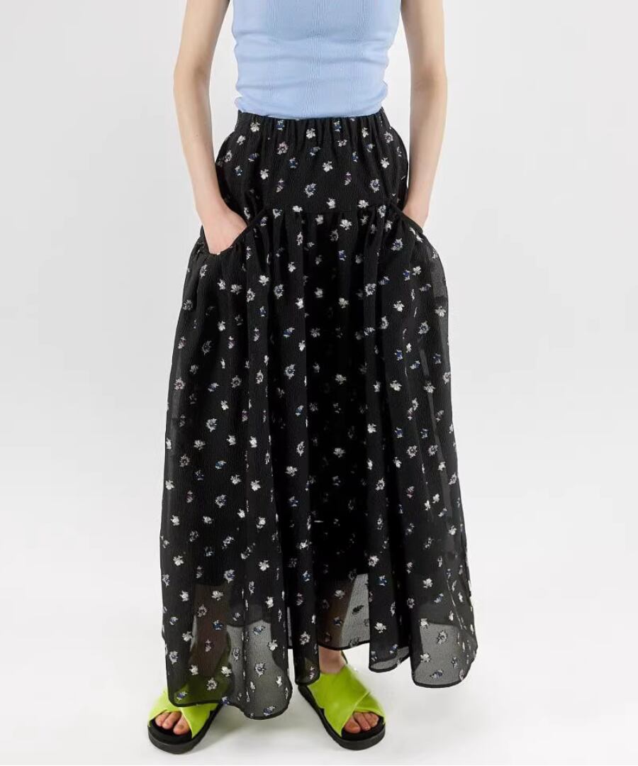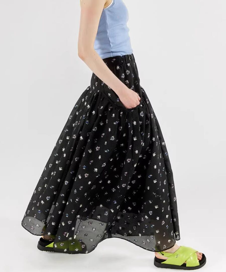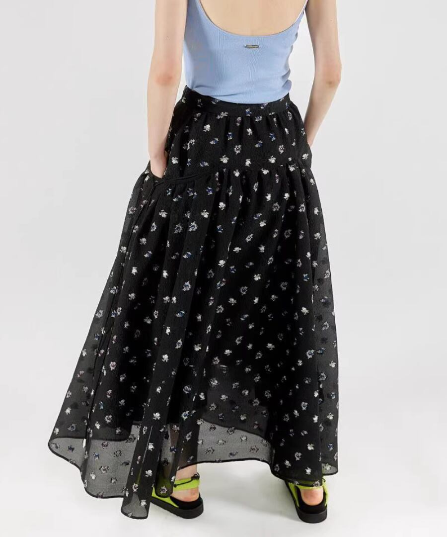 華やかなジャカードフラワー刺繍が施されたフレアスカート。