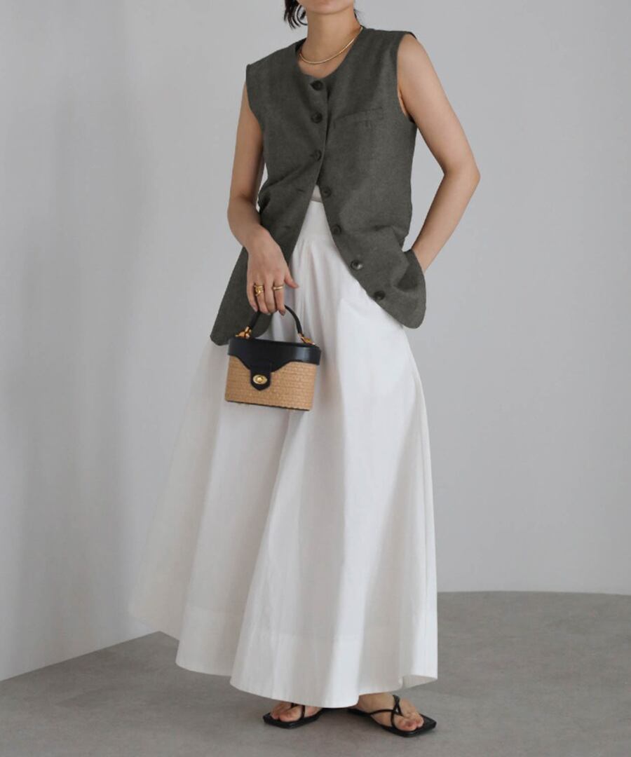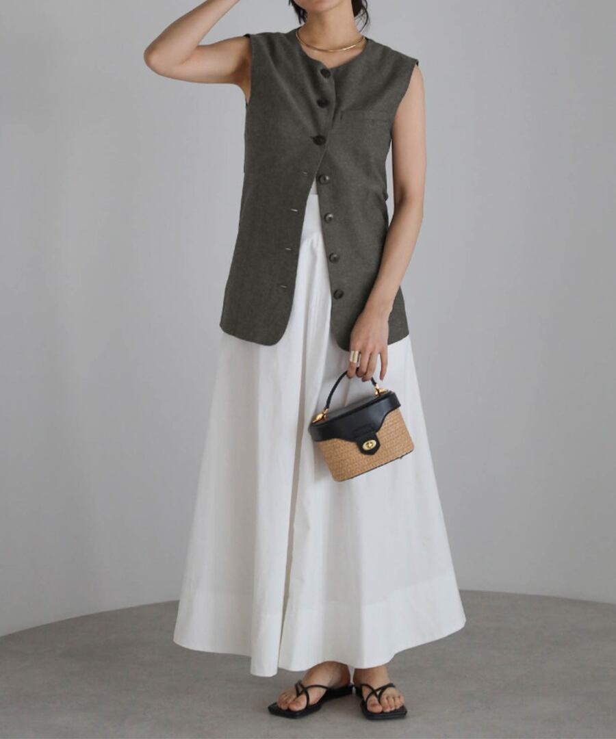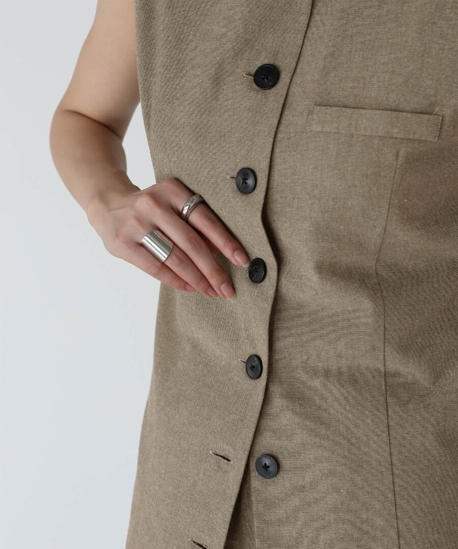フロントボタンが映えるノースリーブベストは、モードな雰囲気を演出。
