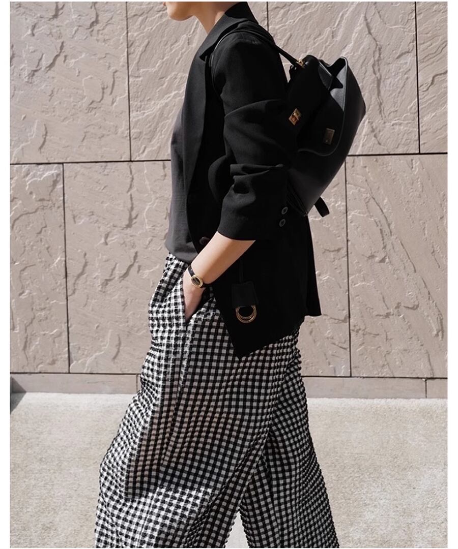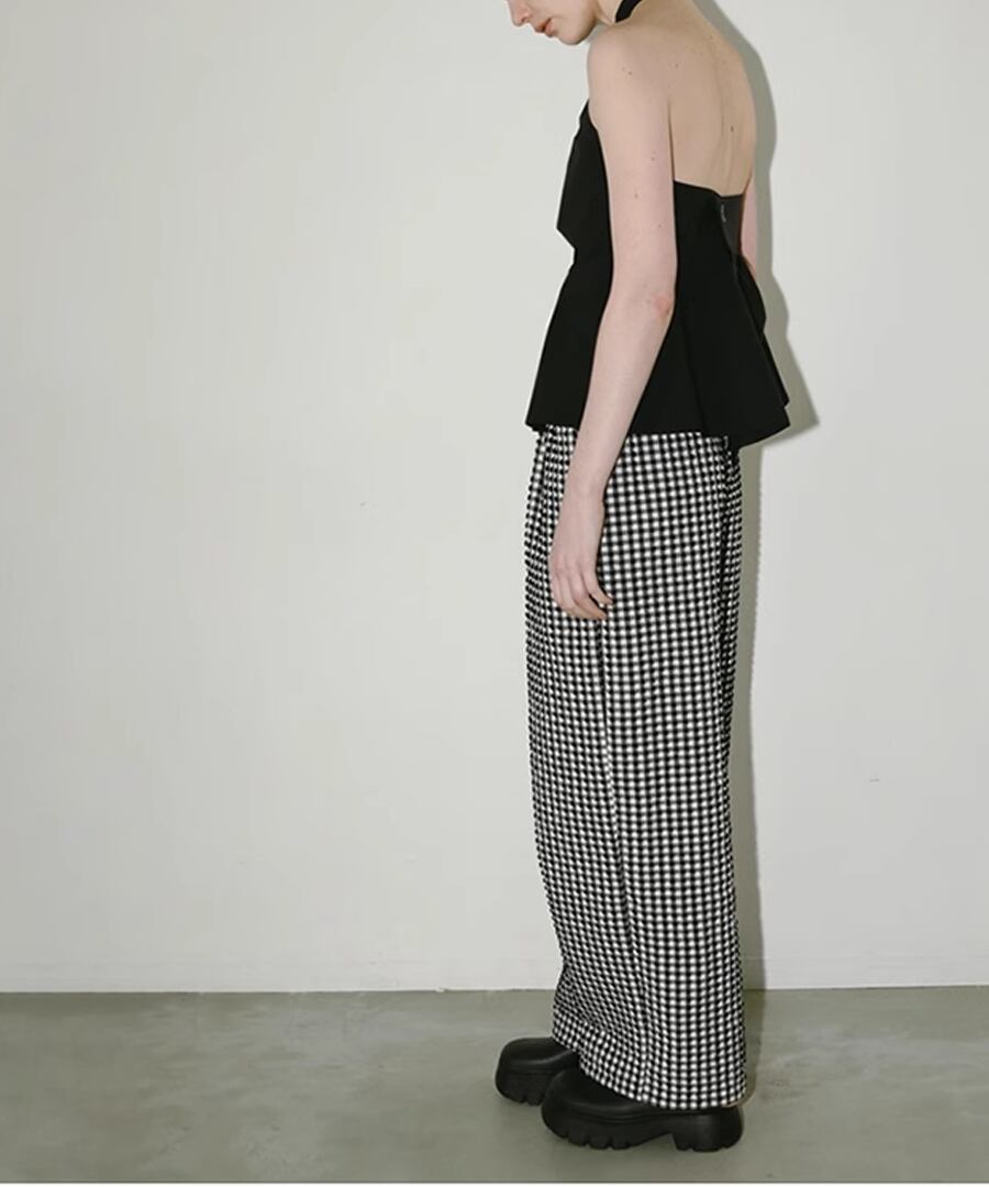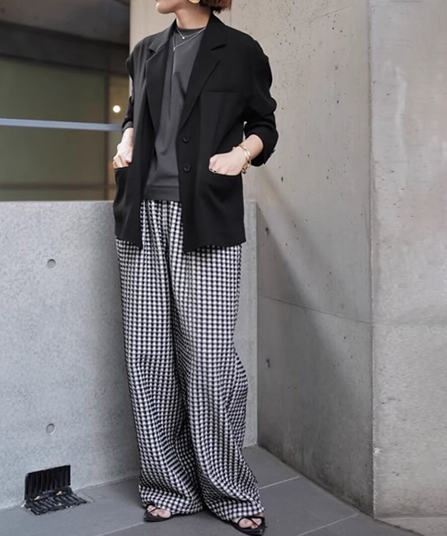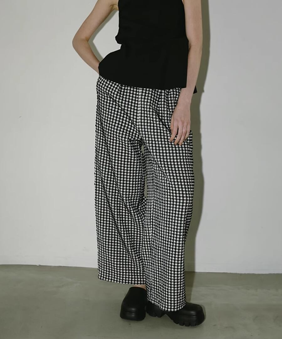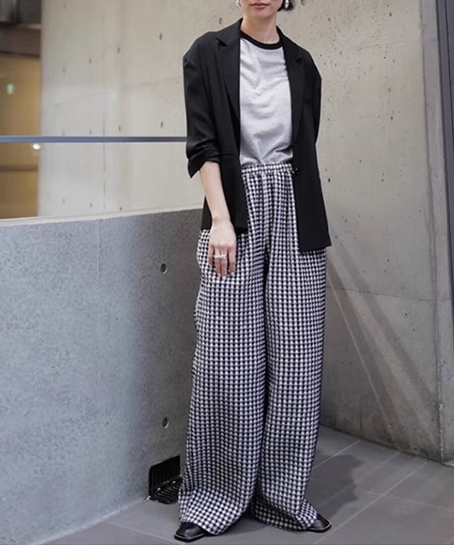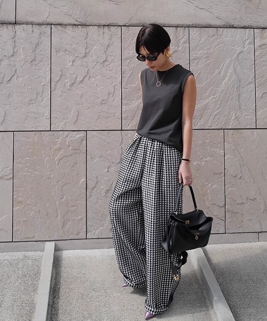 トレンド感溢れるチェック柄のハイウエストワイドレッグパンツ