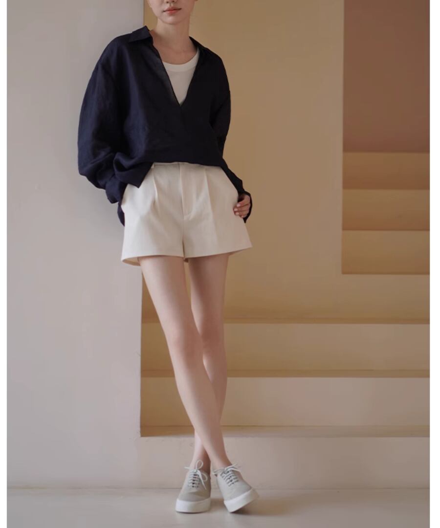 カジュアルなシャツもネイビーカラーで大人っぽい雰囲気に。