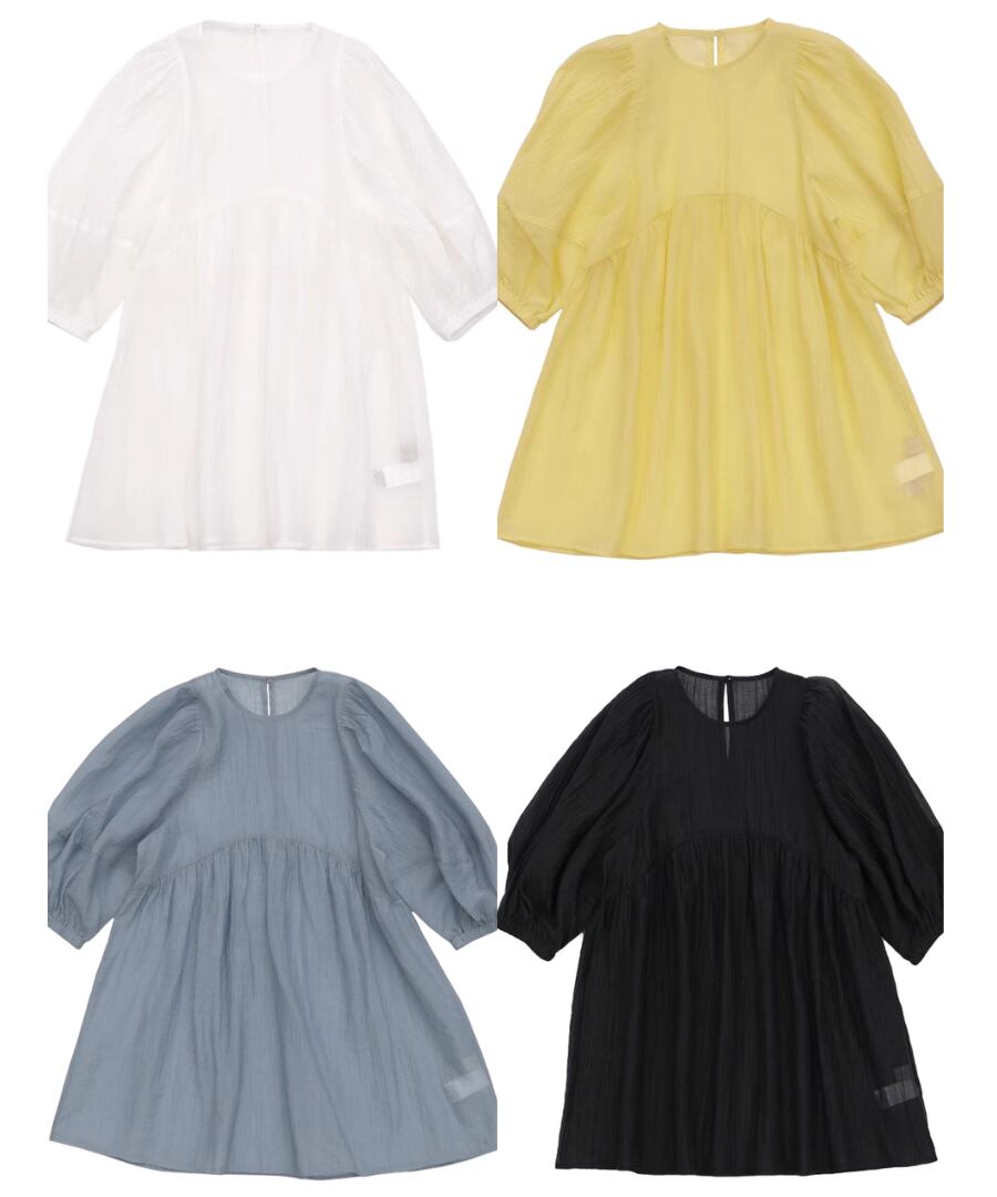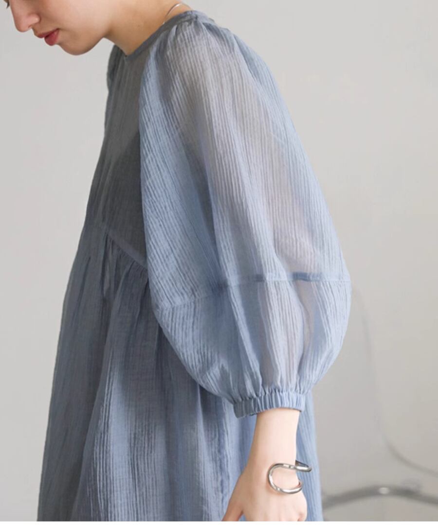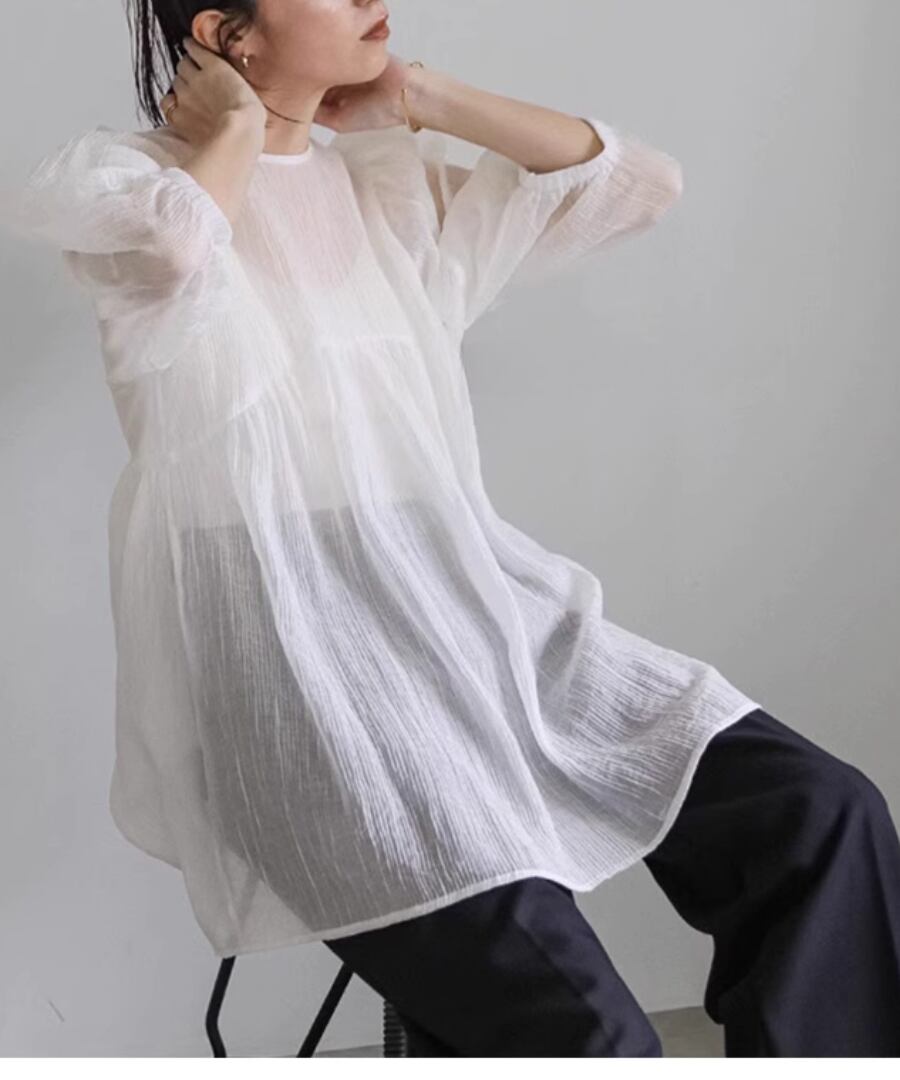 透け感のあるシアー素材は、軽やかな印象を与え、体のラインを美しく見せるデザインです。