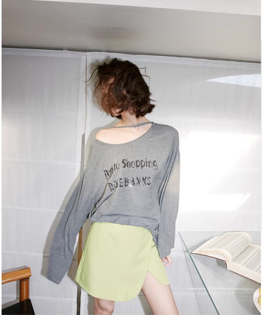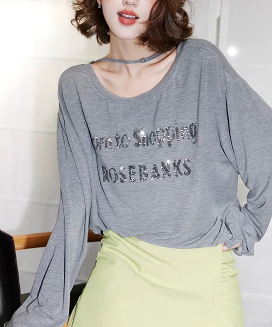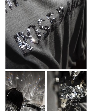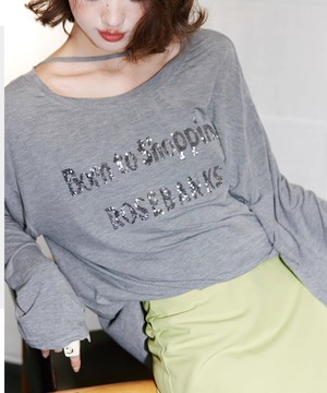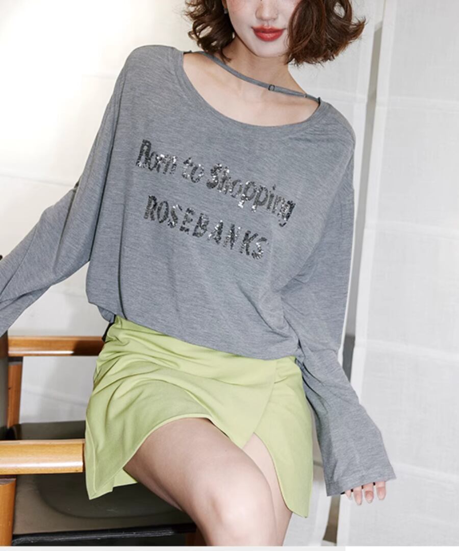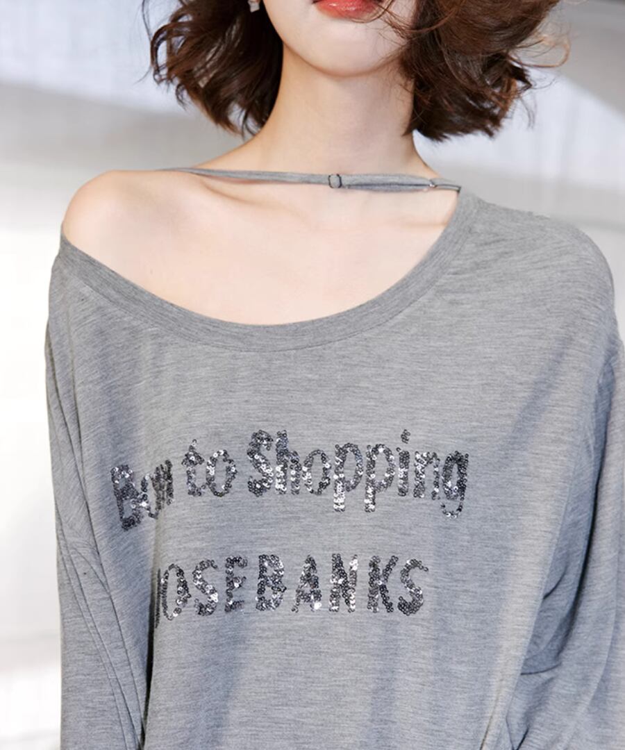 スタイリッシュなオフショルダーのデザインと、煌めくスパンコールが特徴のカットソー。