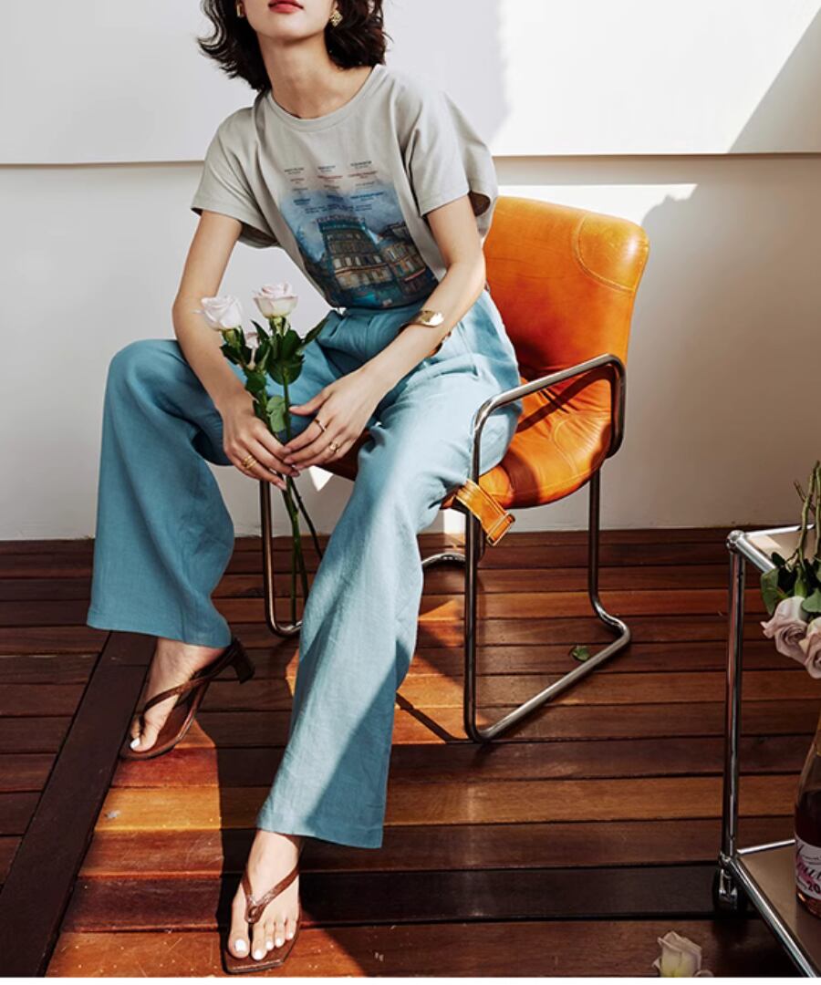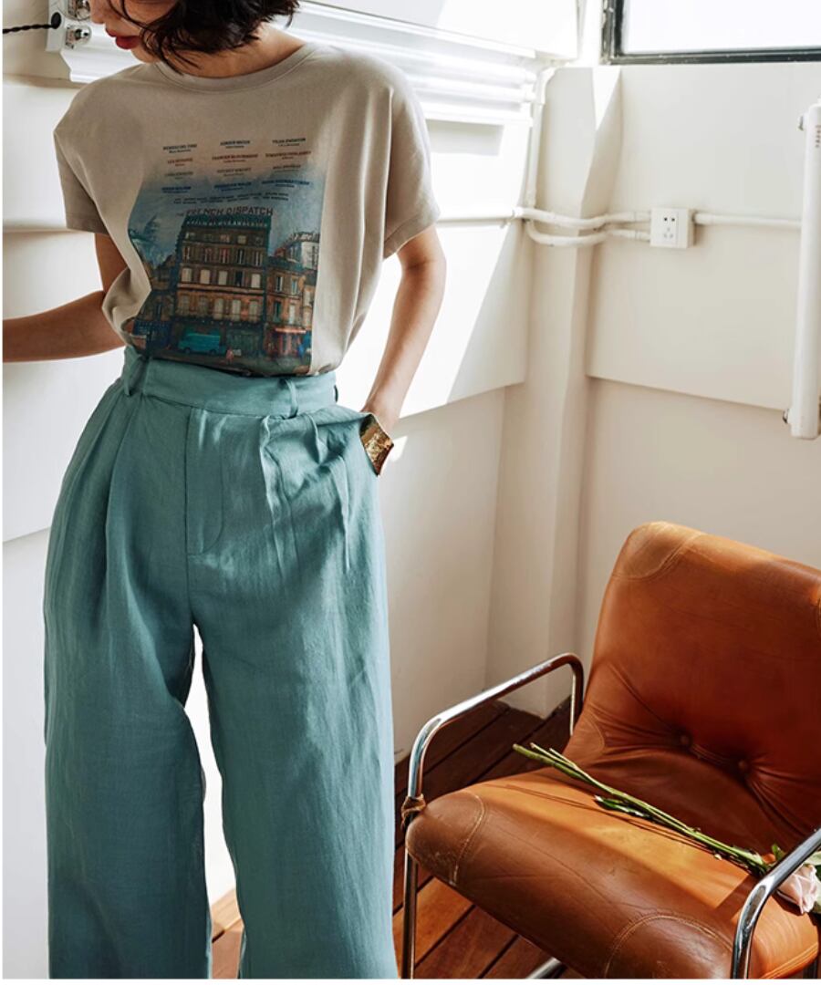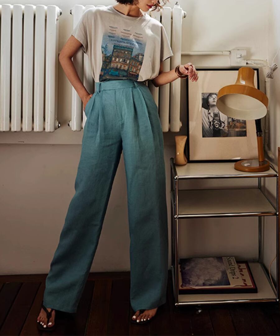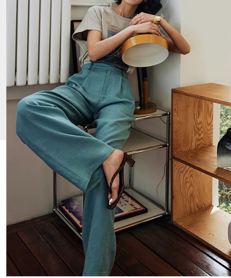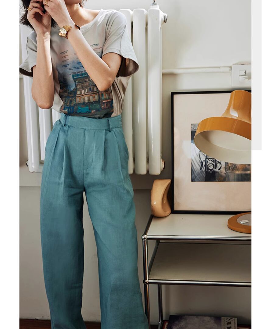 涼しげなレイクブルーが目を引くリネン100%のカジュアルパンツ。