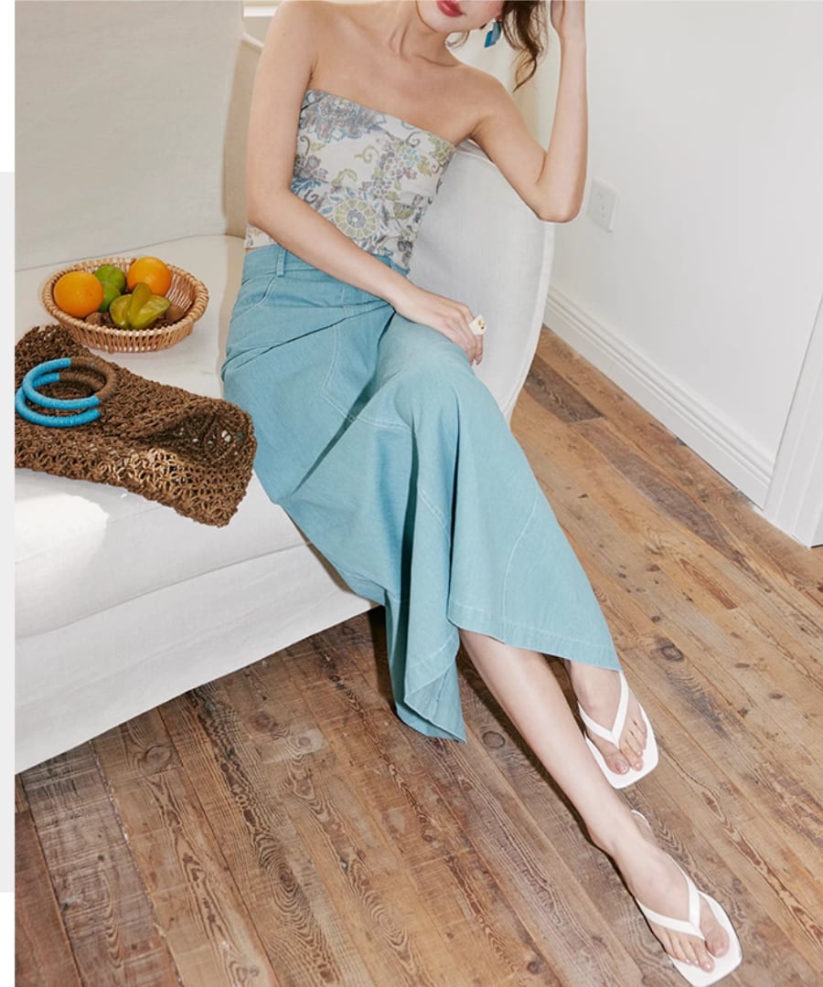 ウォッシュ加工を施したダメージデニムスカートは、カジュアルコーディネートにぴったり。