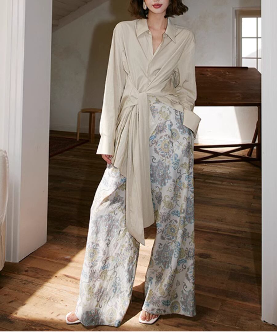 リネン混素材を使用したプリントワイドレッグパンツ。