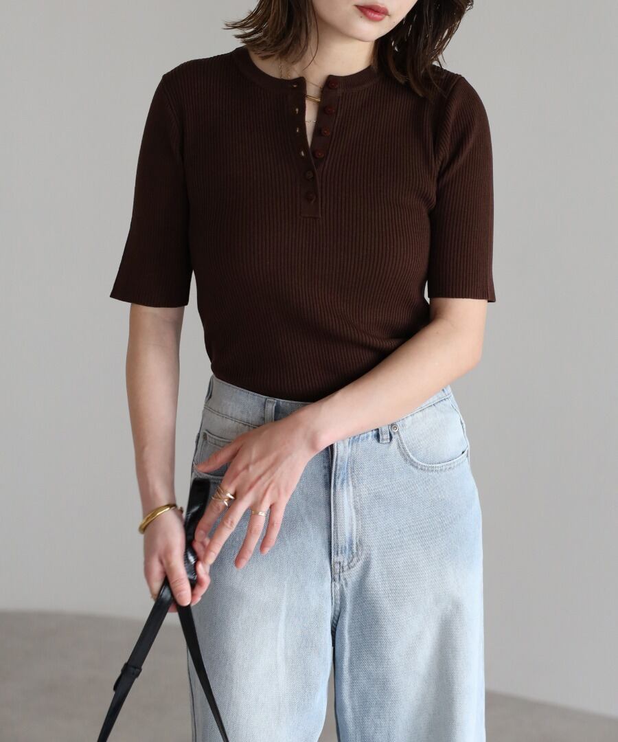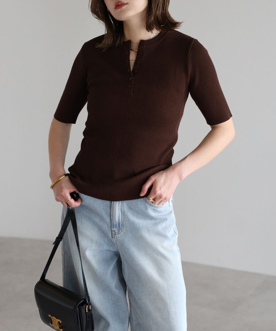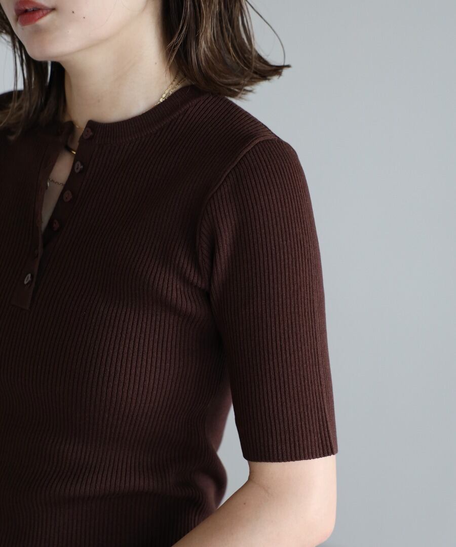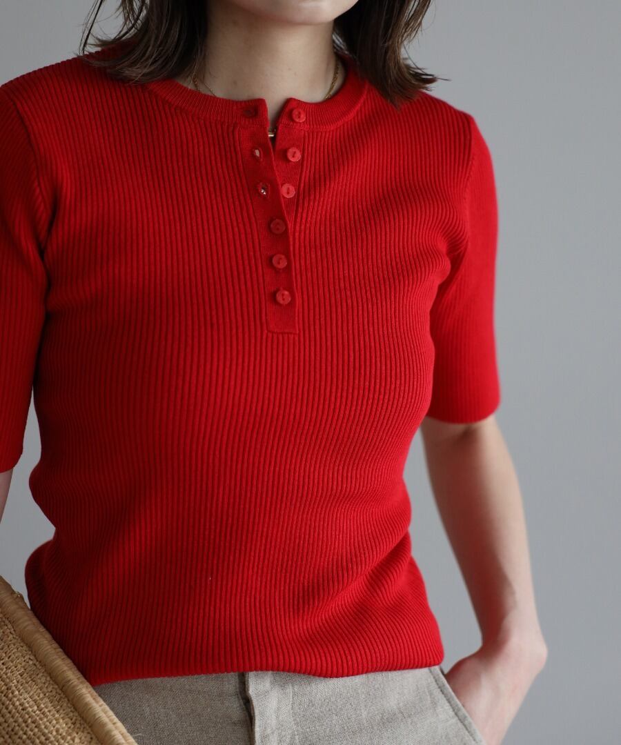 リブの表情が際立つ、ヘンリーネックデザインの半袖ニット。