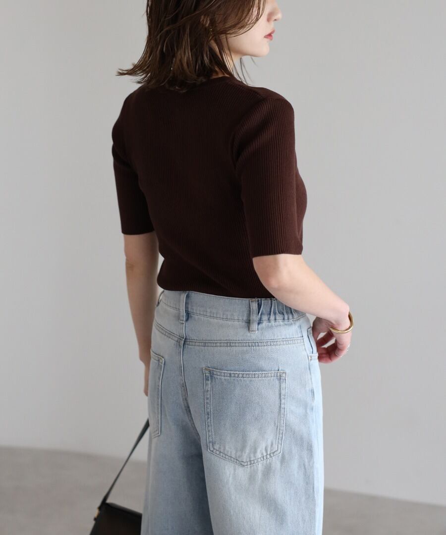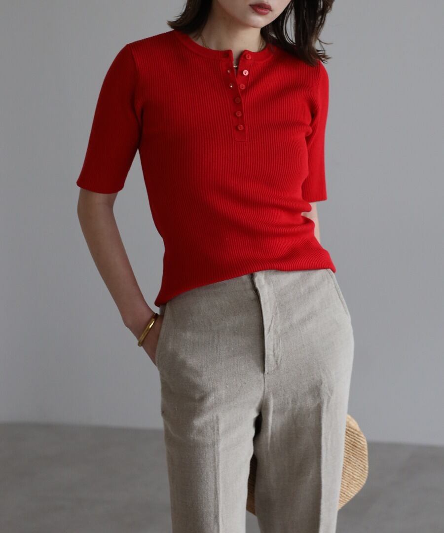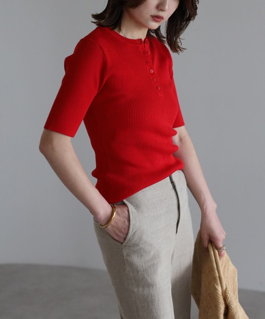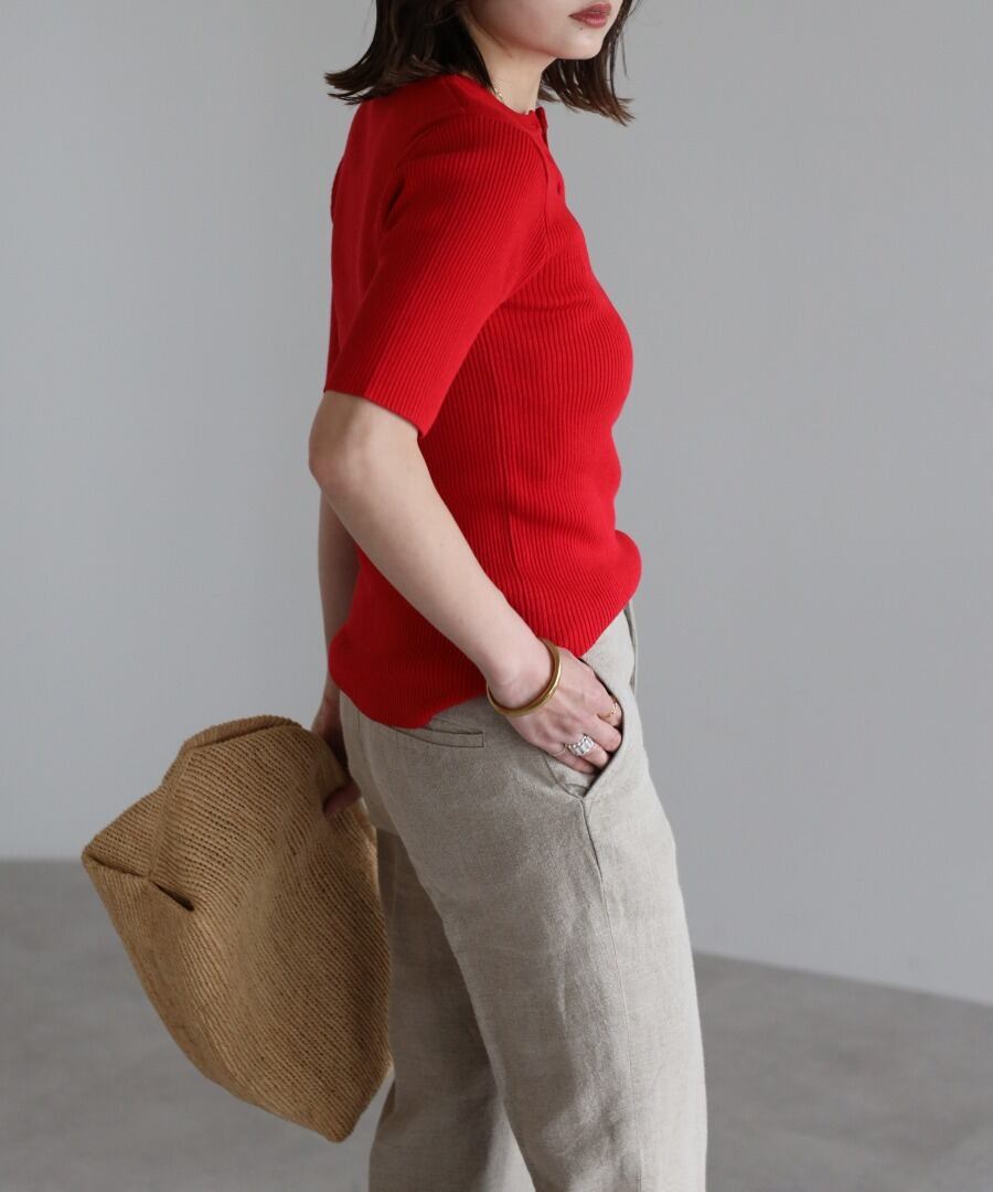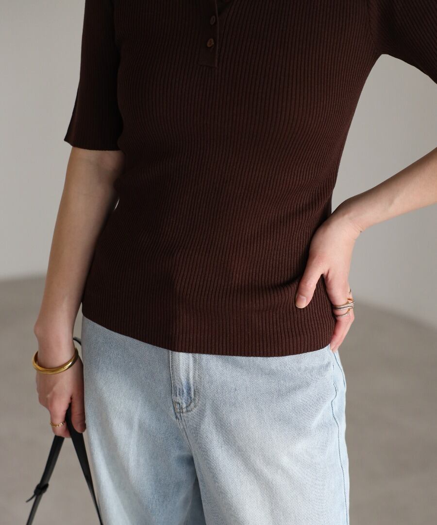 リブの表情が際立つ、ヘンリーネックデザインの半袖ニット。