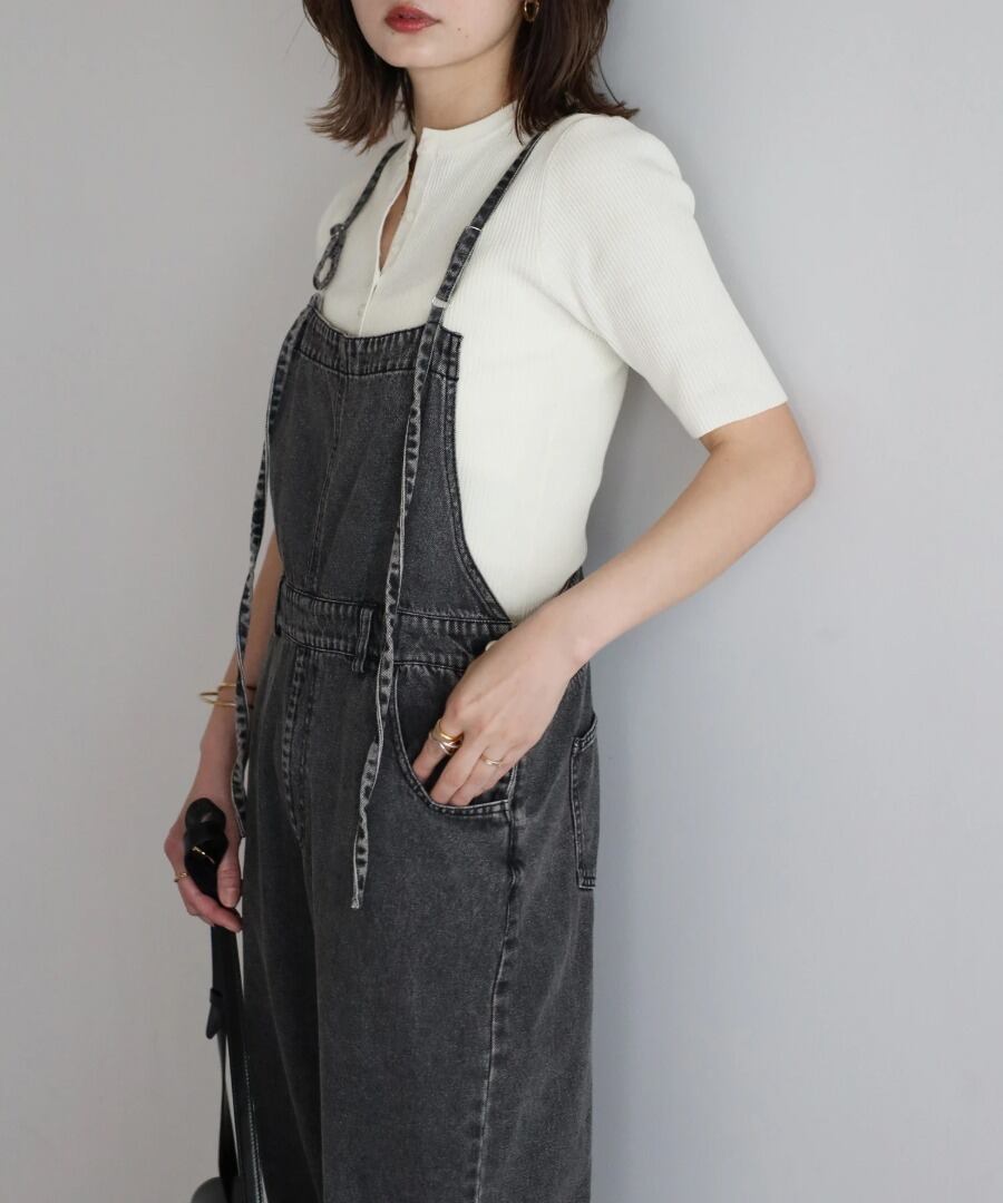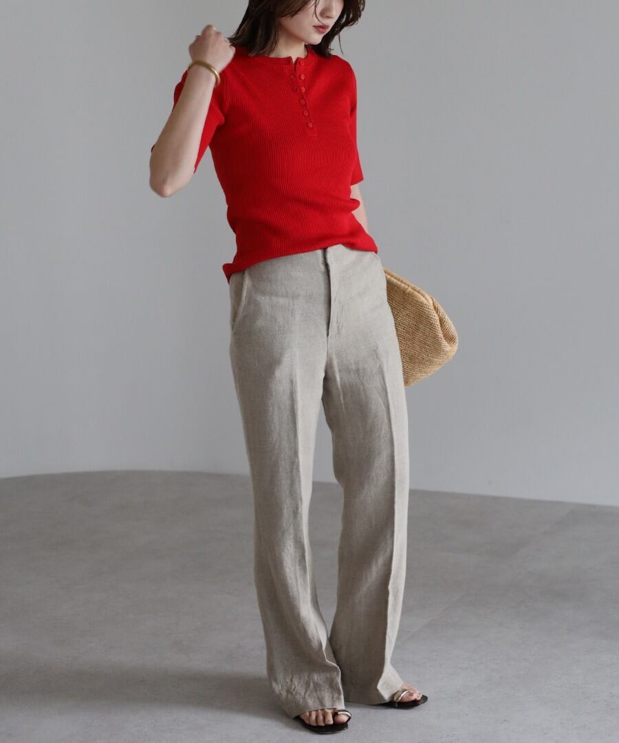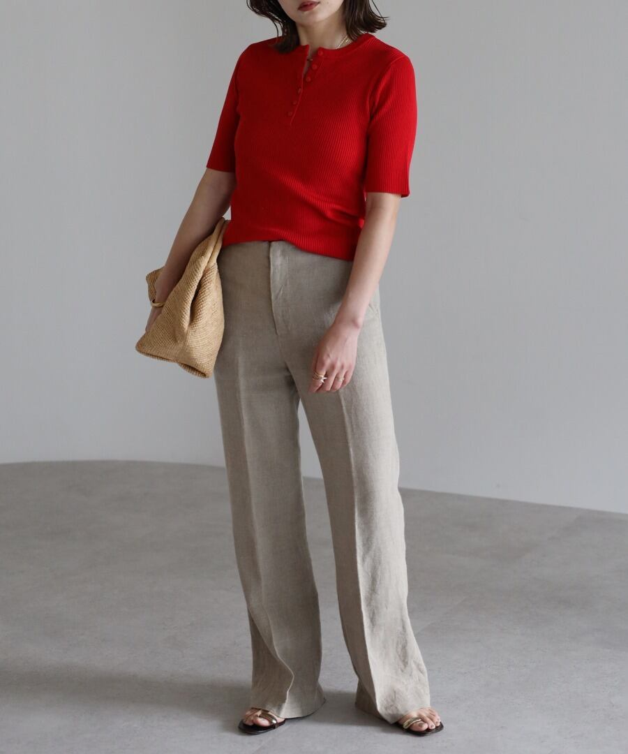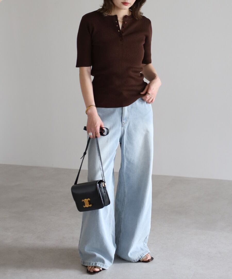 リブの表情が際立つ、ヘンリーネックデザインの半袖ニット。