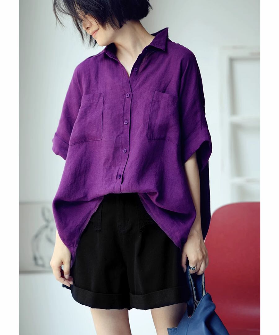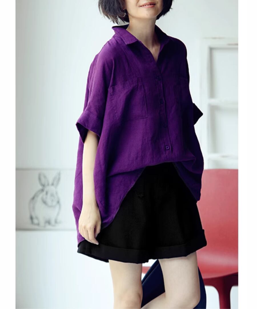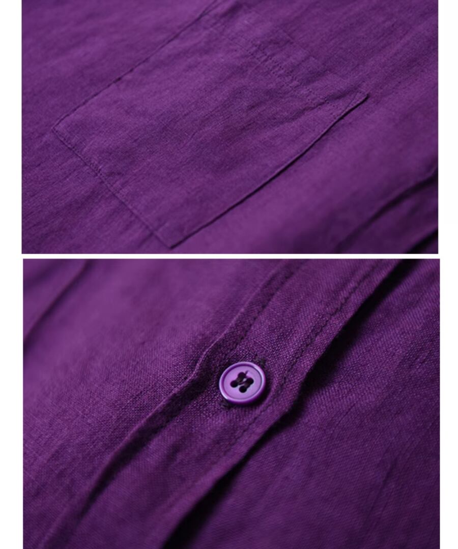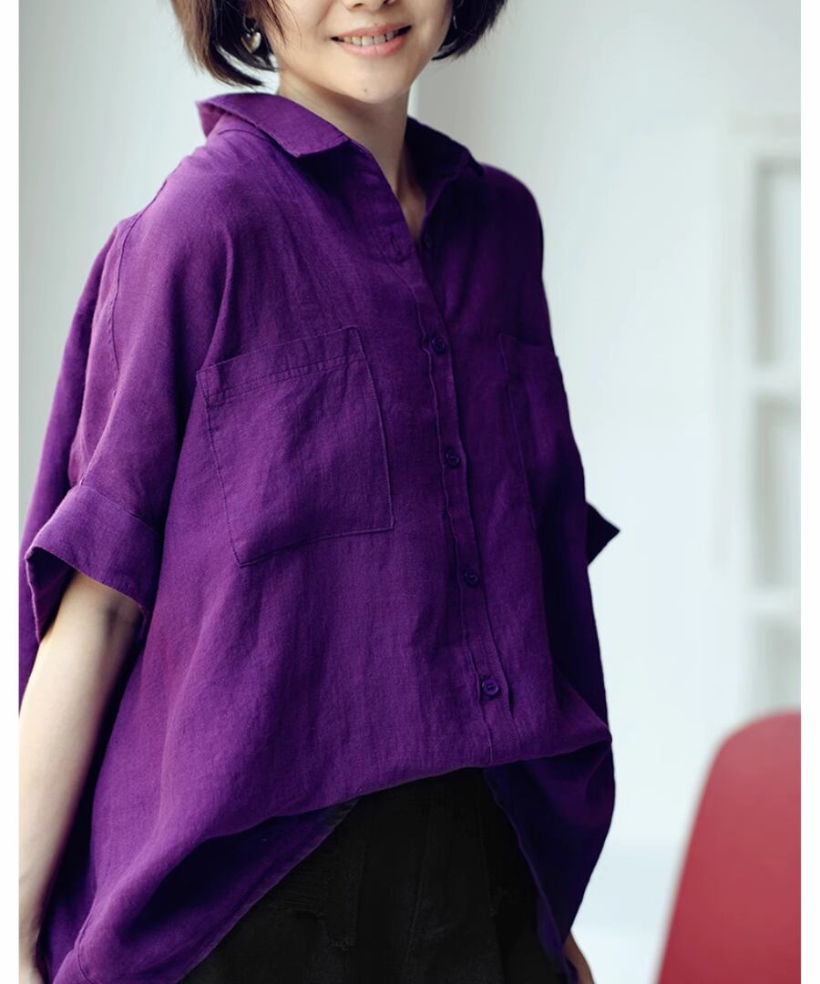 カジュアルなのに上品さを兼ね備えた、リネン100%のパープルシャツ。