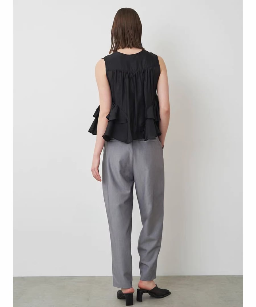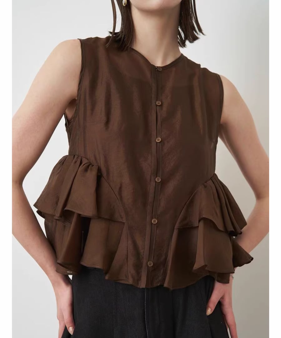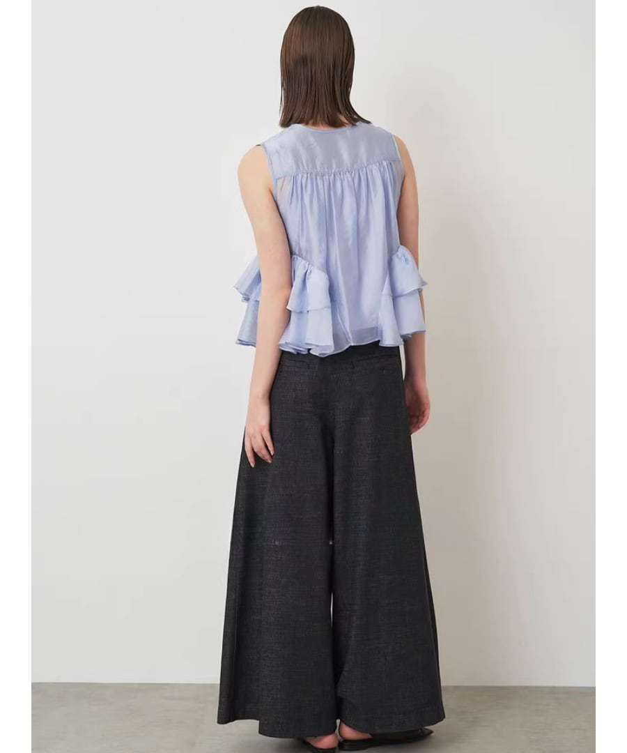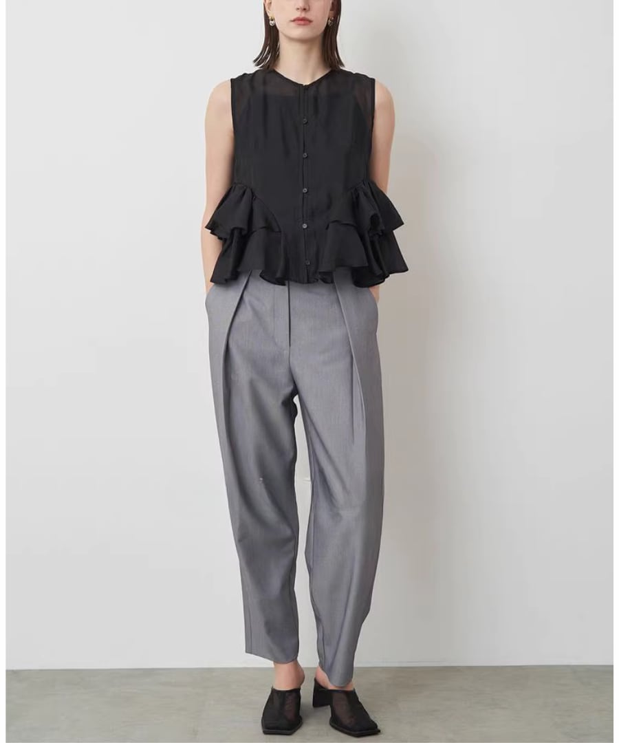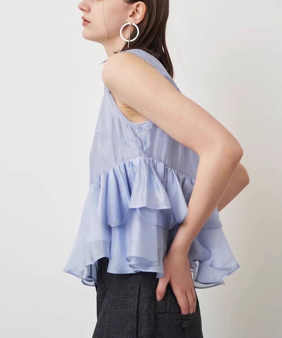 エレガントなフリルが、女性らしい柔らかな印象を与えるノースリーブブラウスです。