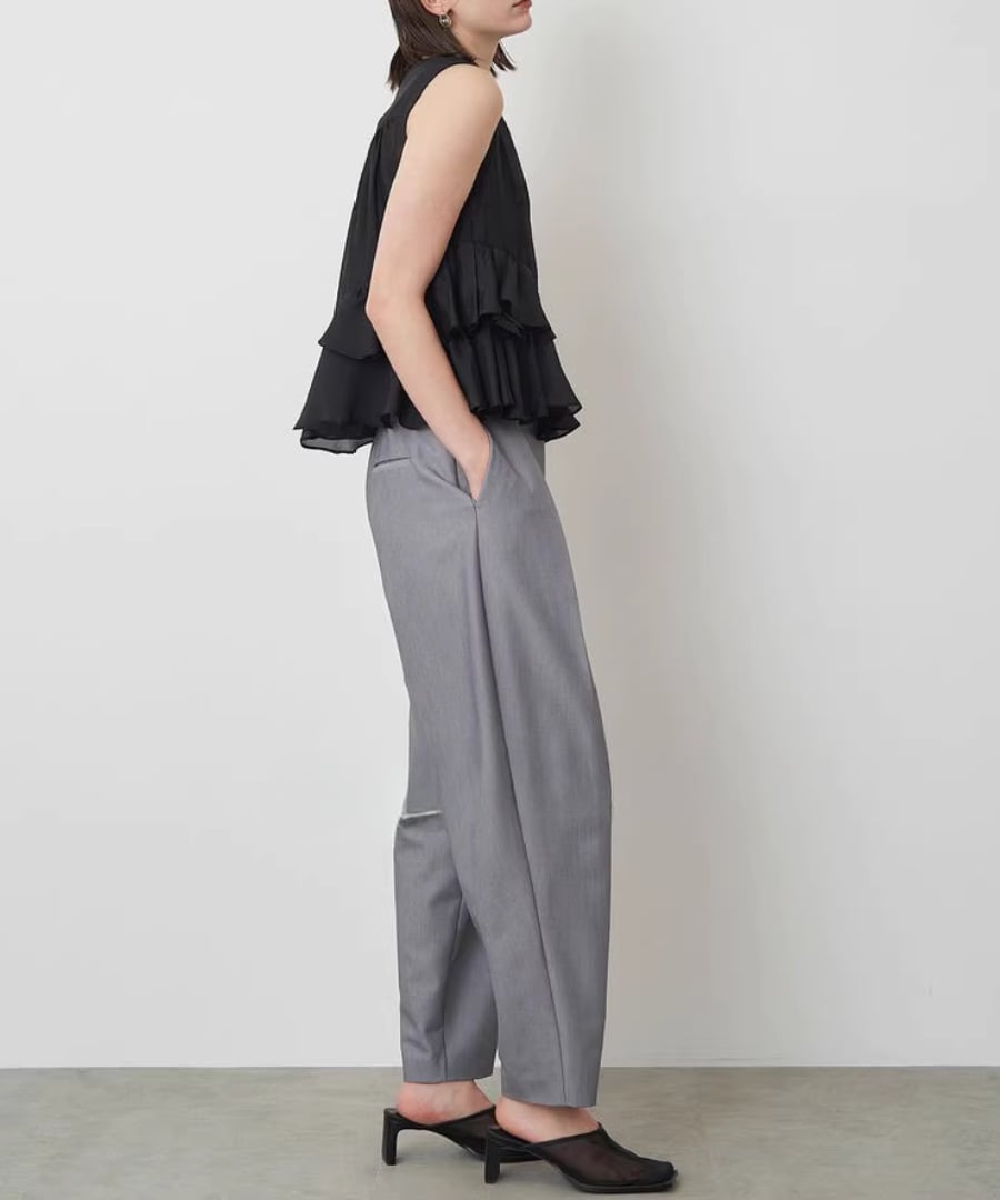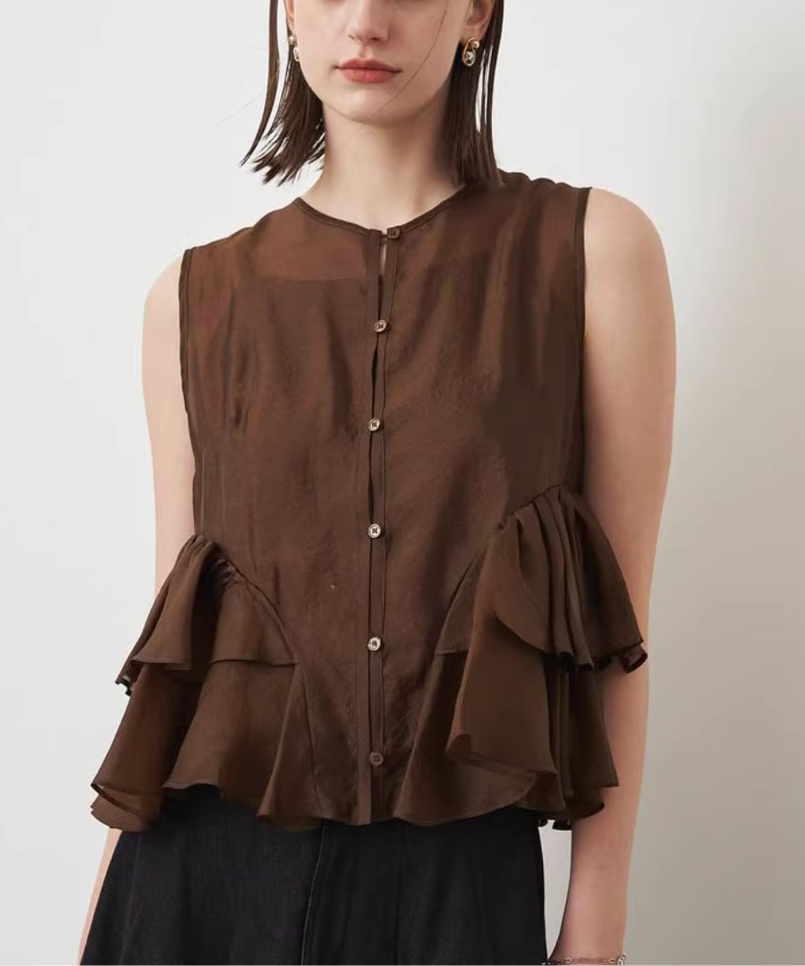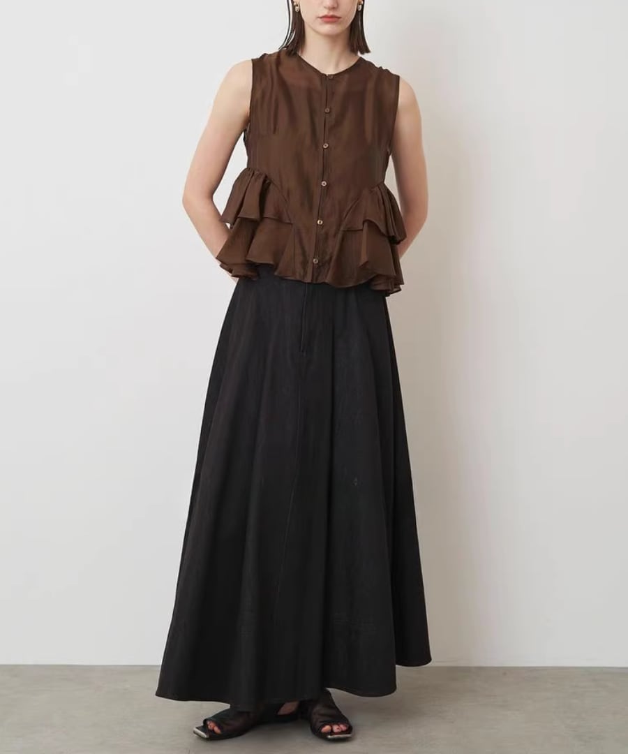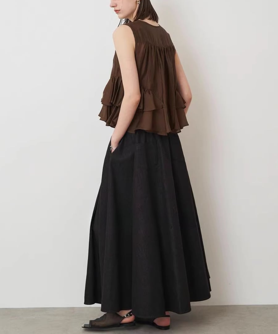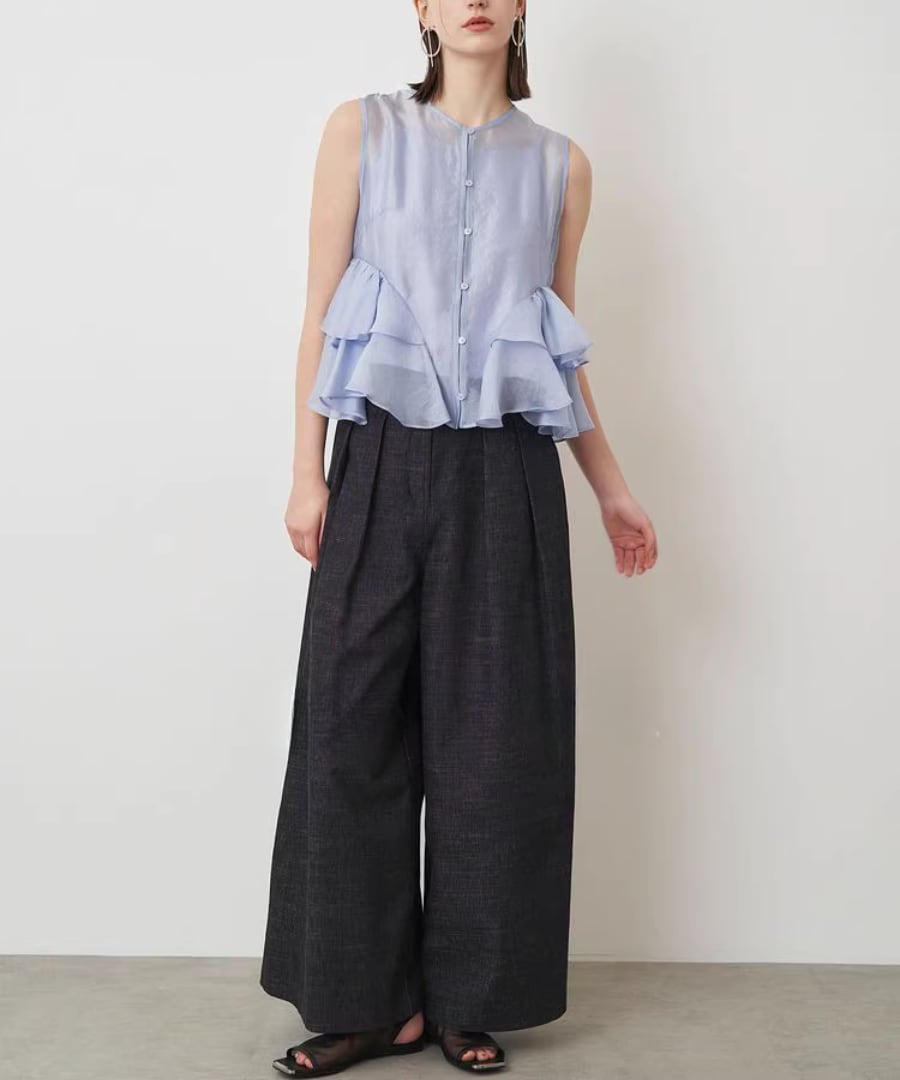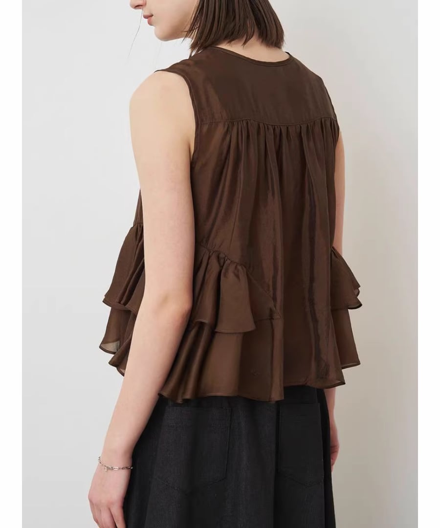 エレガントなフリルが、女性らしい柔らかな印象を与えるノースリーブブラウスです。