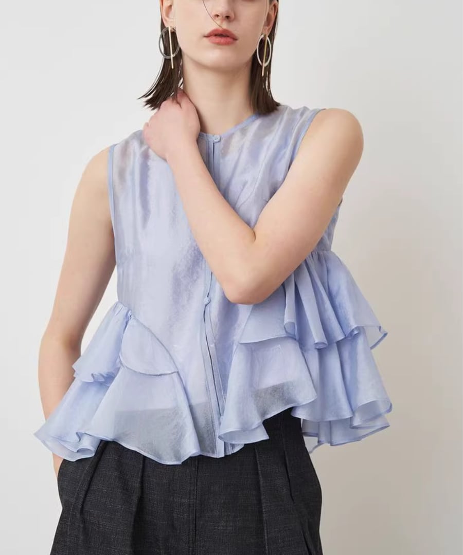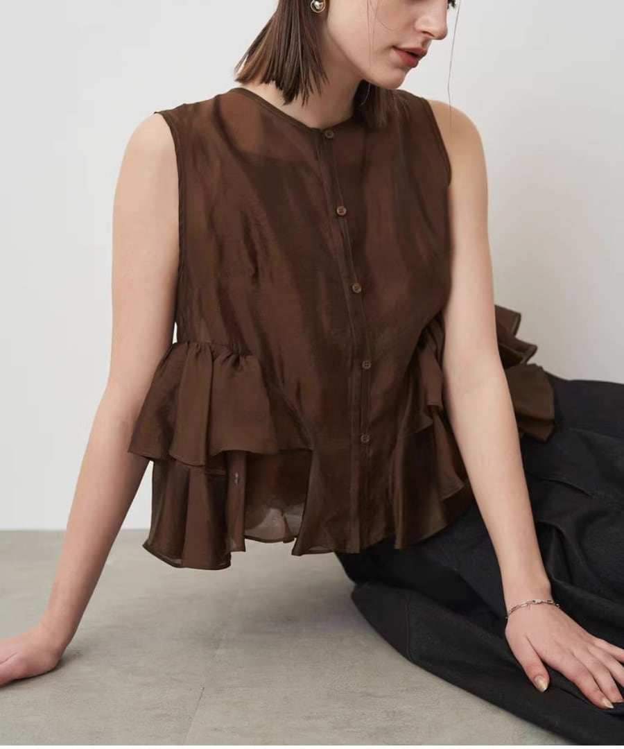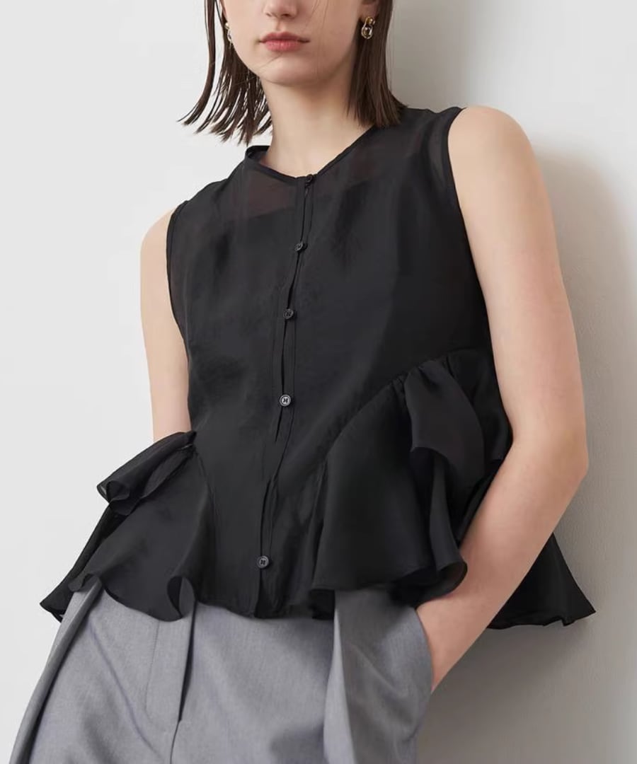 シアー素材が軽やかに揺れる、ノースリーブブラウス。