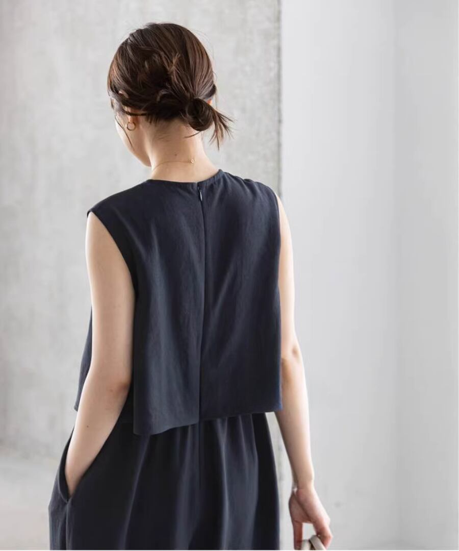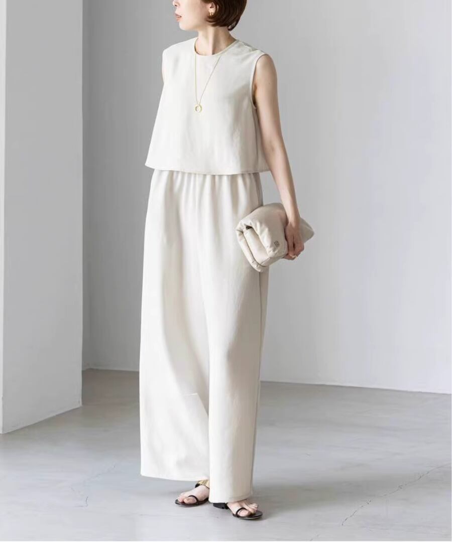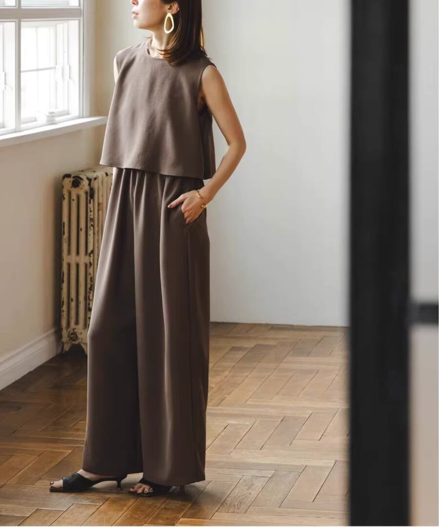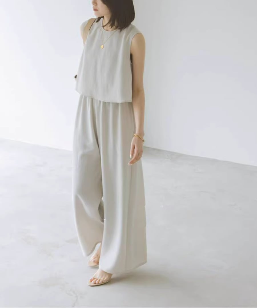 心地良いクレープデシン生地を使用した、ノースリーブトップス&ワイドレッグパンツのセットアップです。