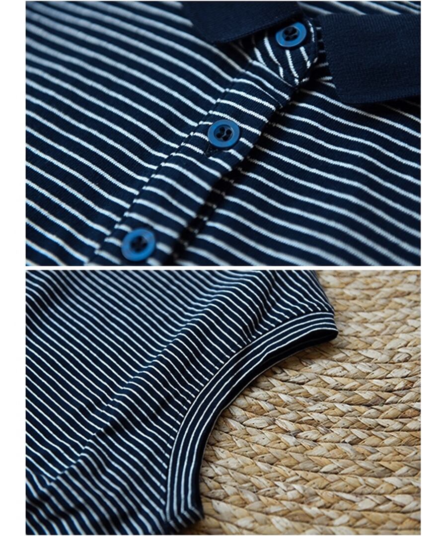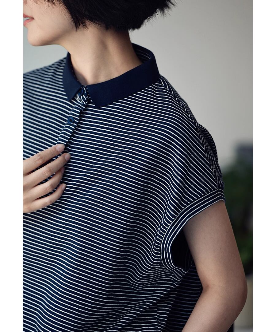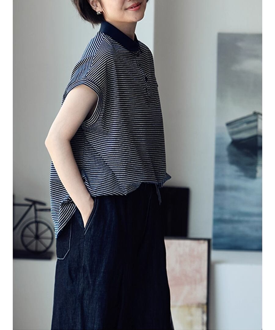 カジュアルながらも上品さを兼ね備えたストライプポロシャツ。