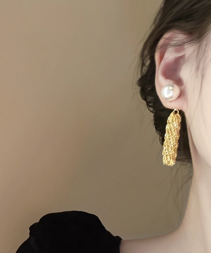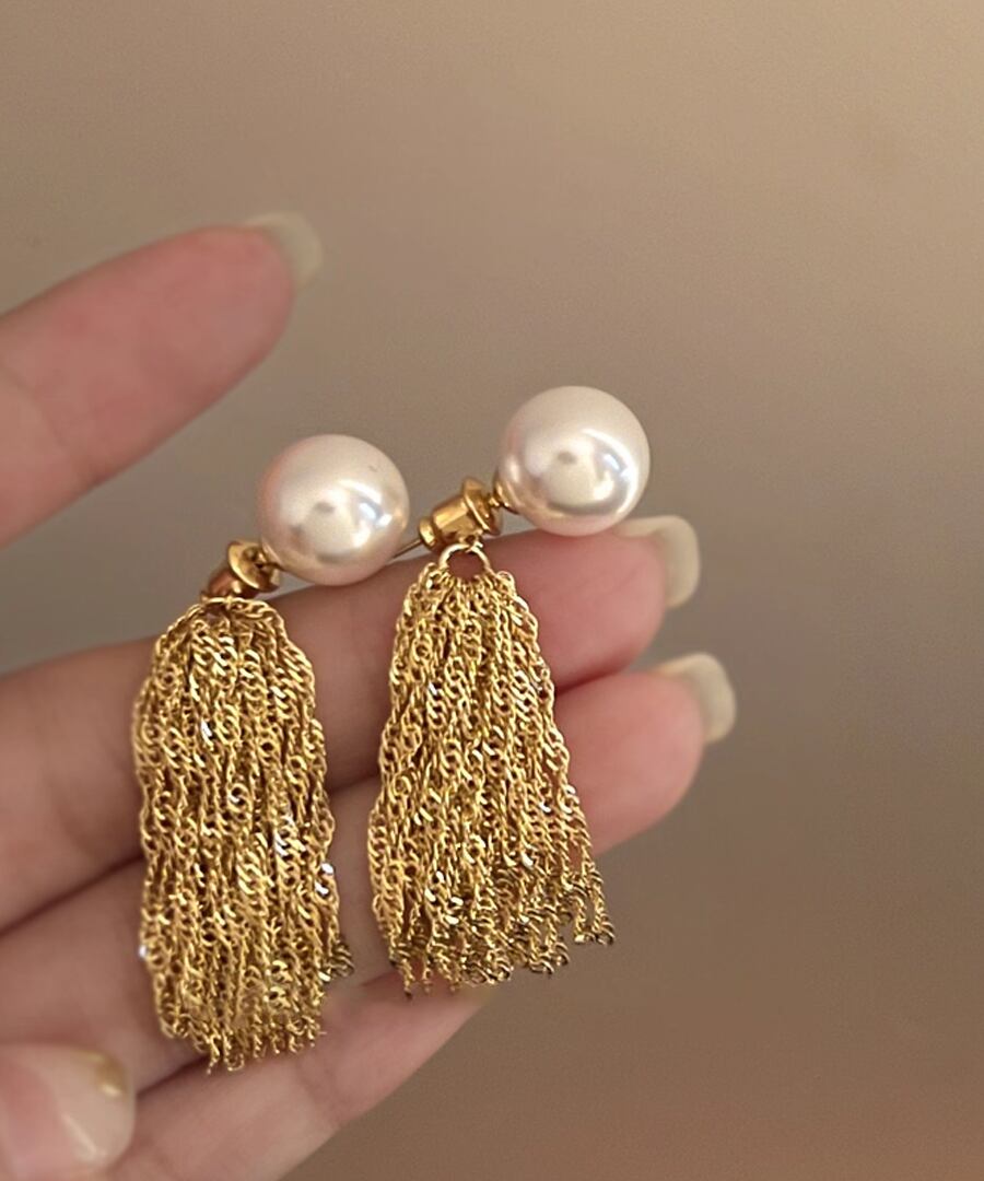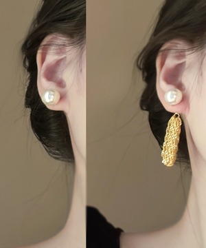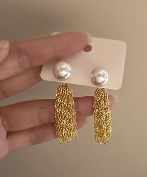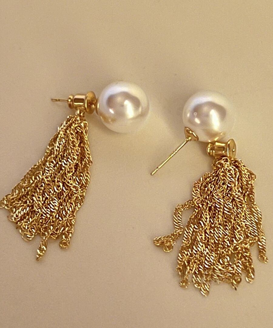 華やかなゴールドタッセルとイミテーションパールが印象的な2wayピアス。
