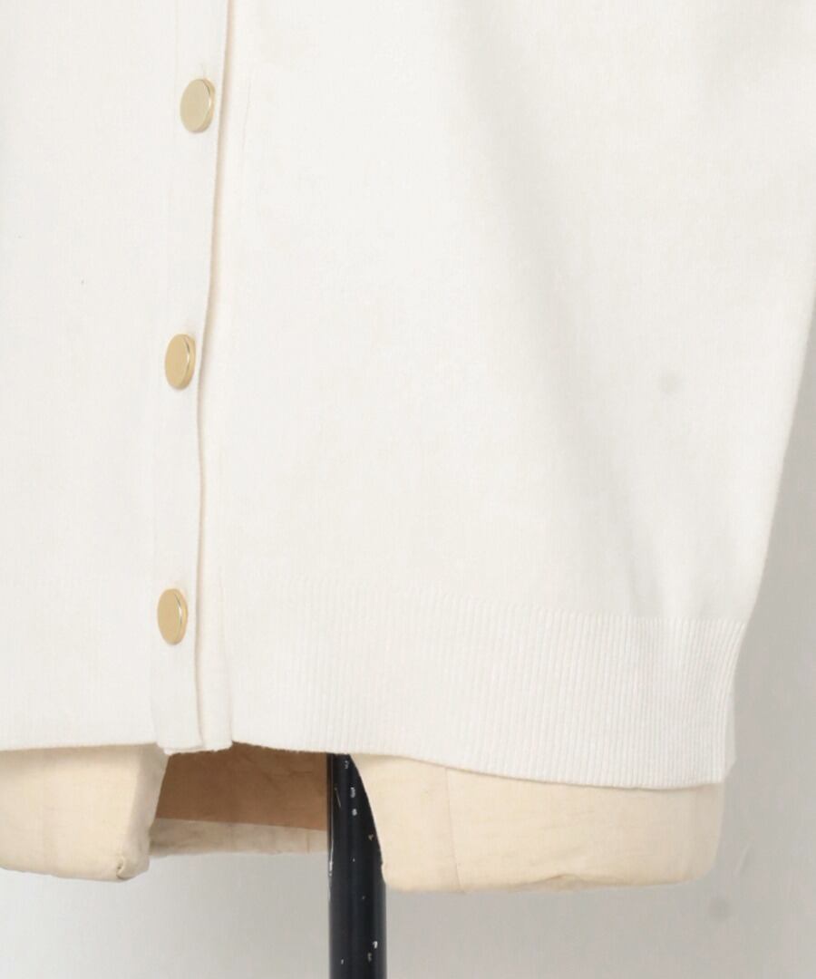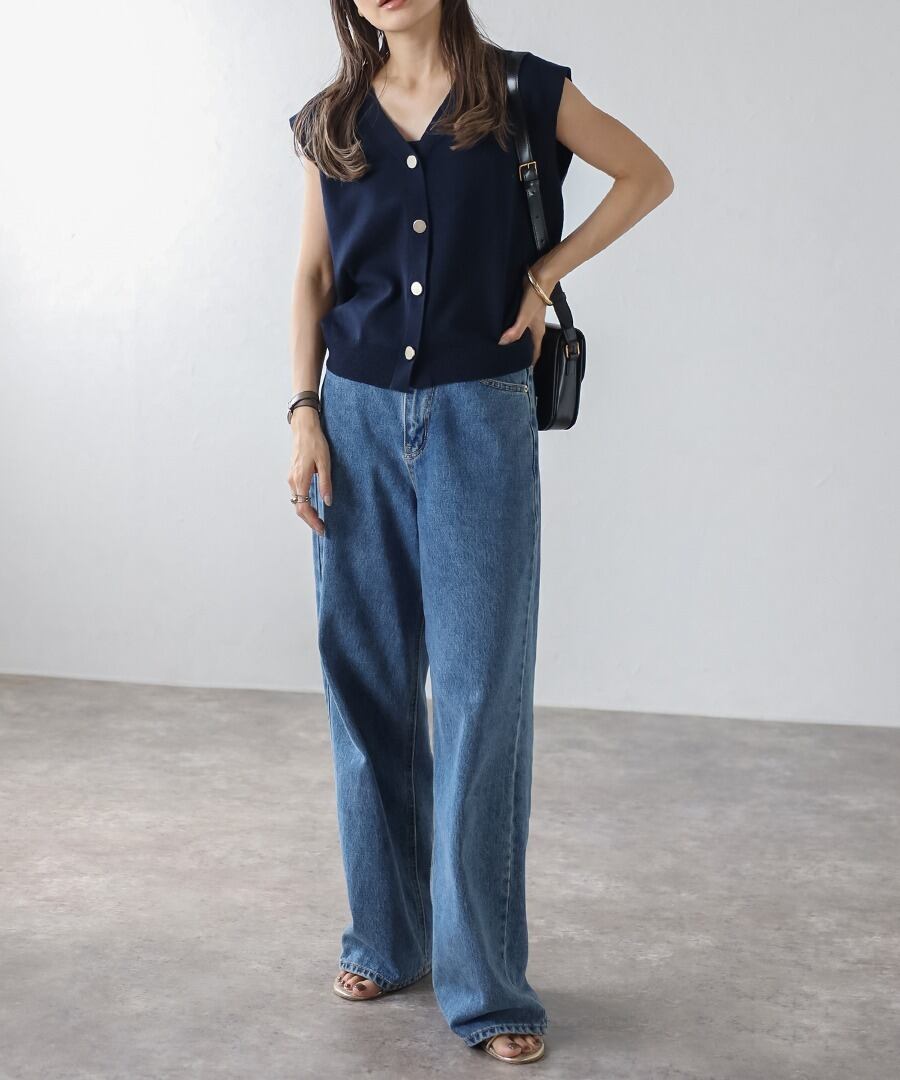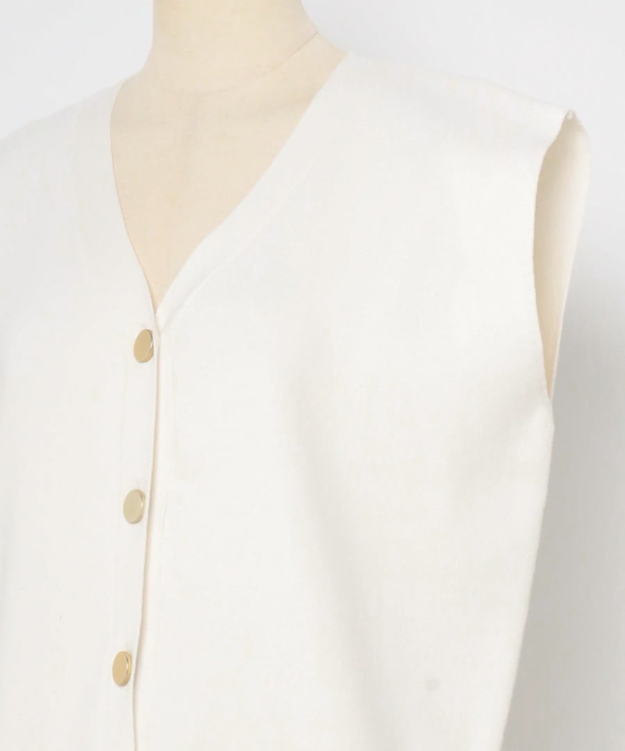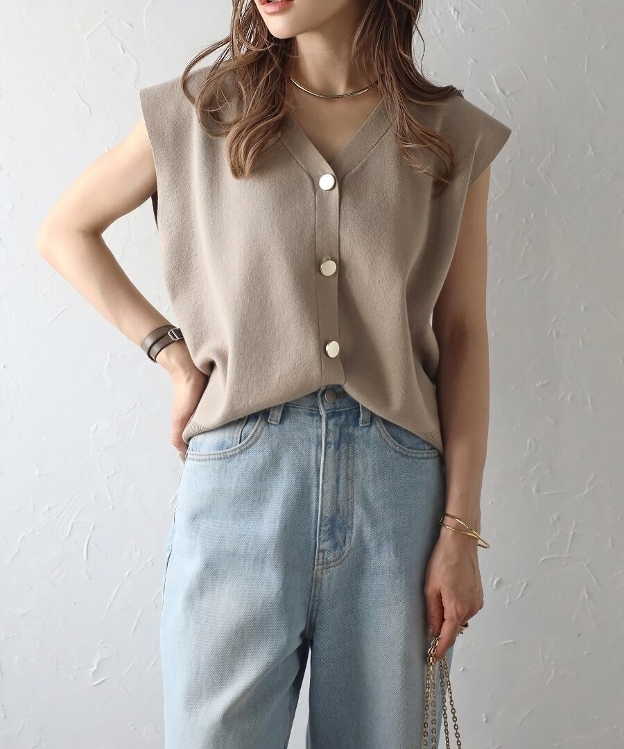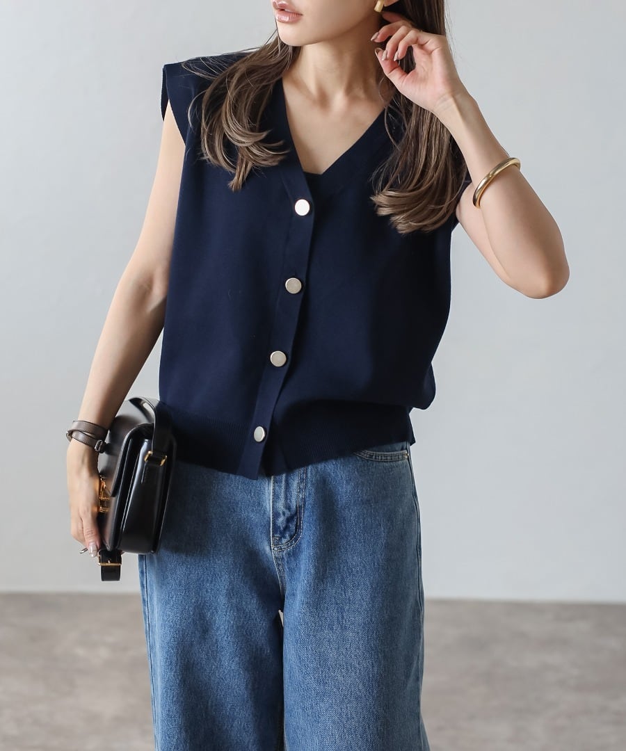 程よい開きのVネックでヘルシーな大人スタイルに。ゴールドボタンベスト