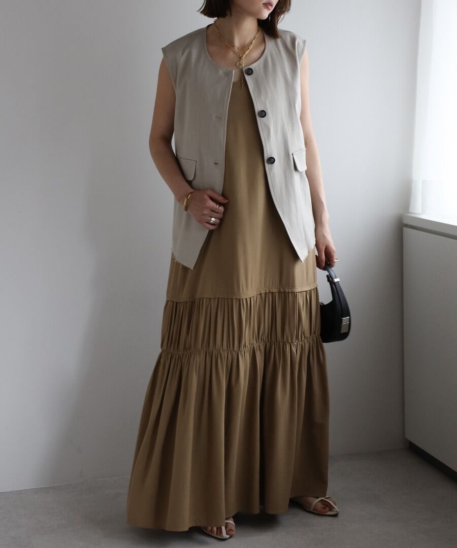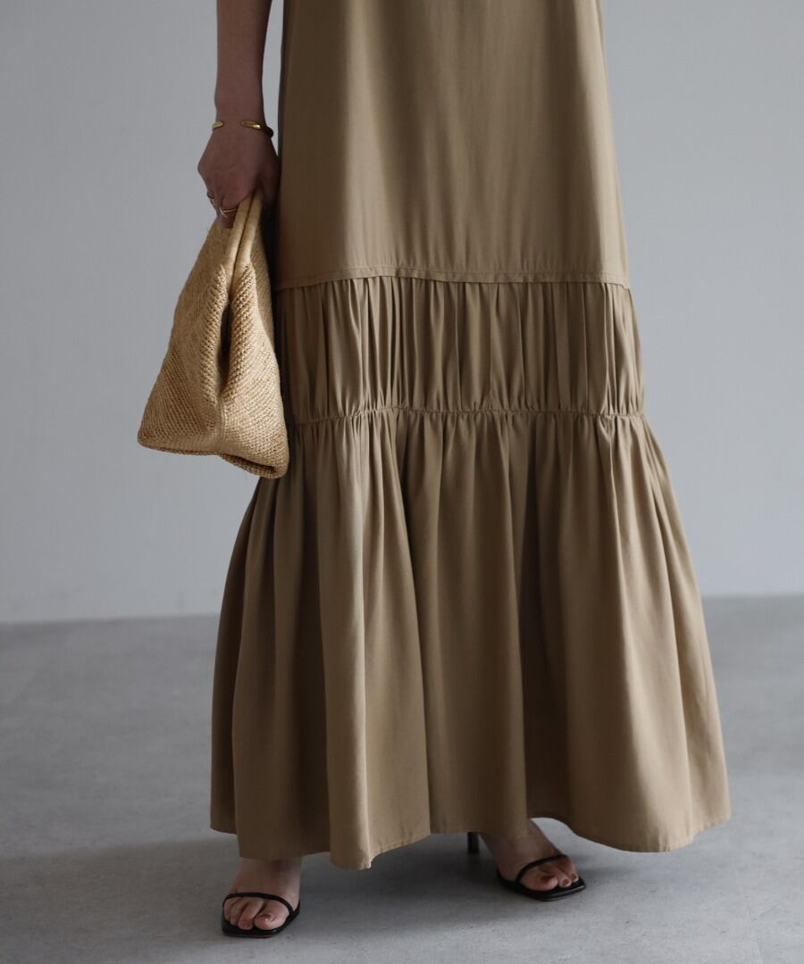 たっぷりギャザーの切り替えとフレアシルエットで、表情豊かなティアードワンピースです。